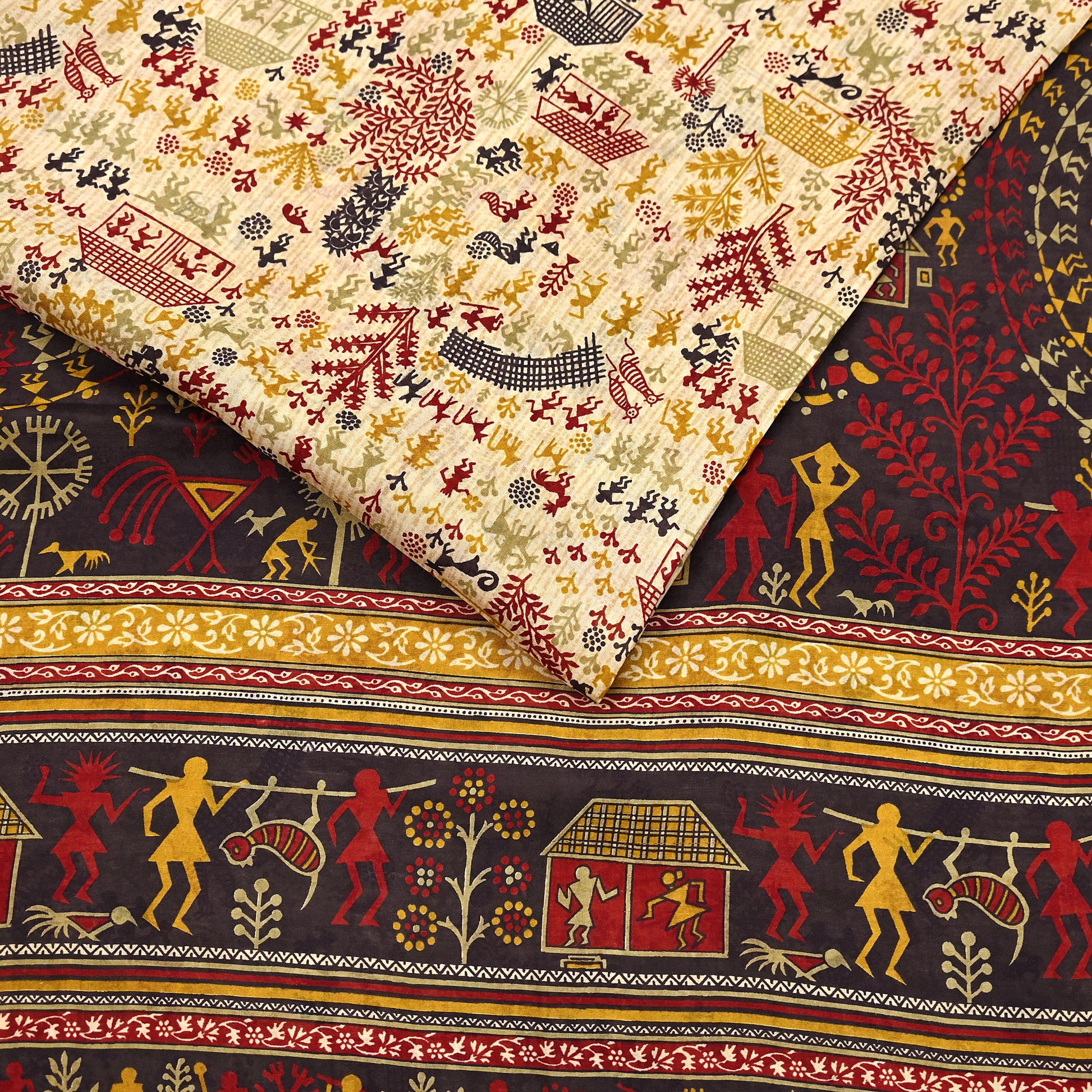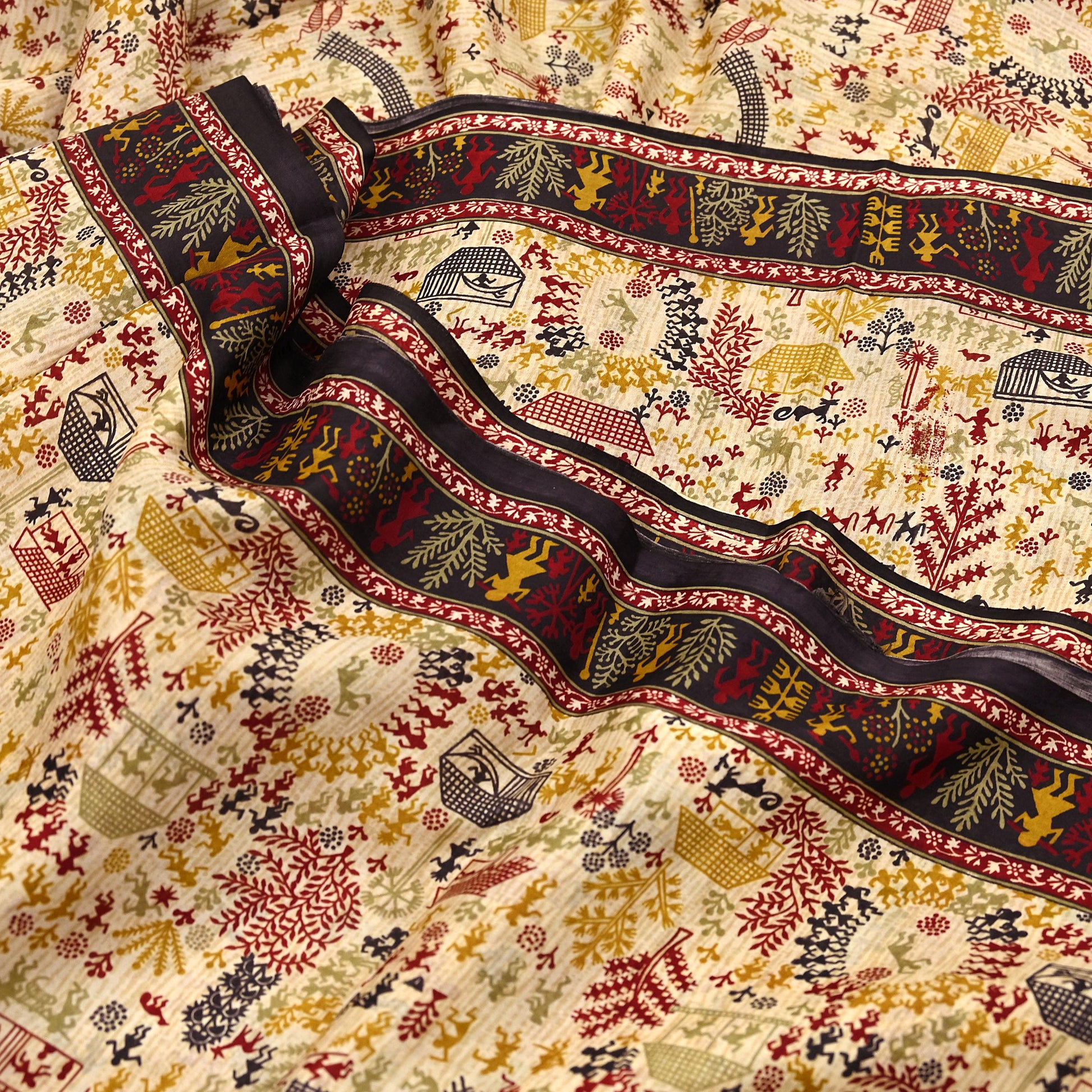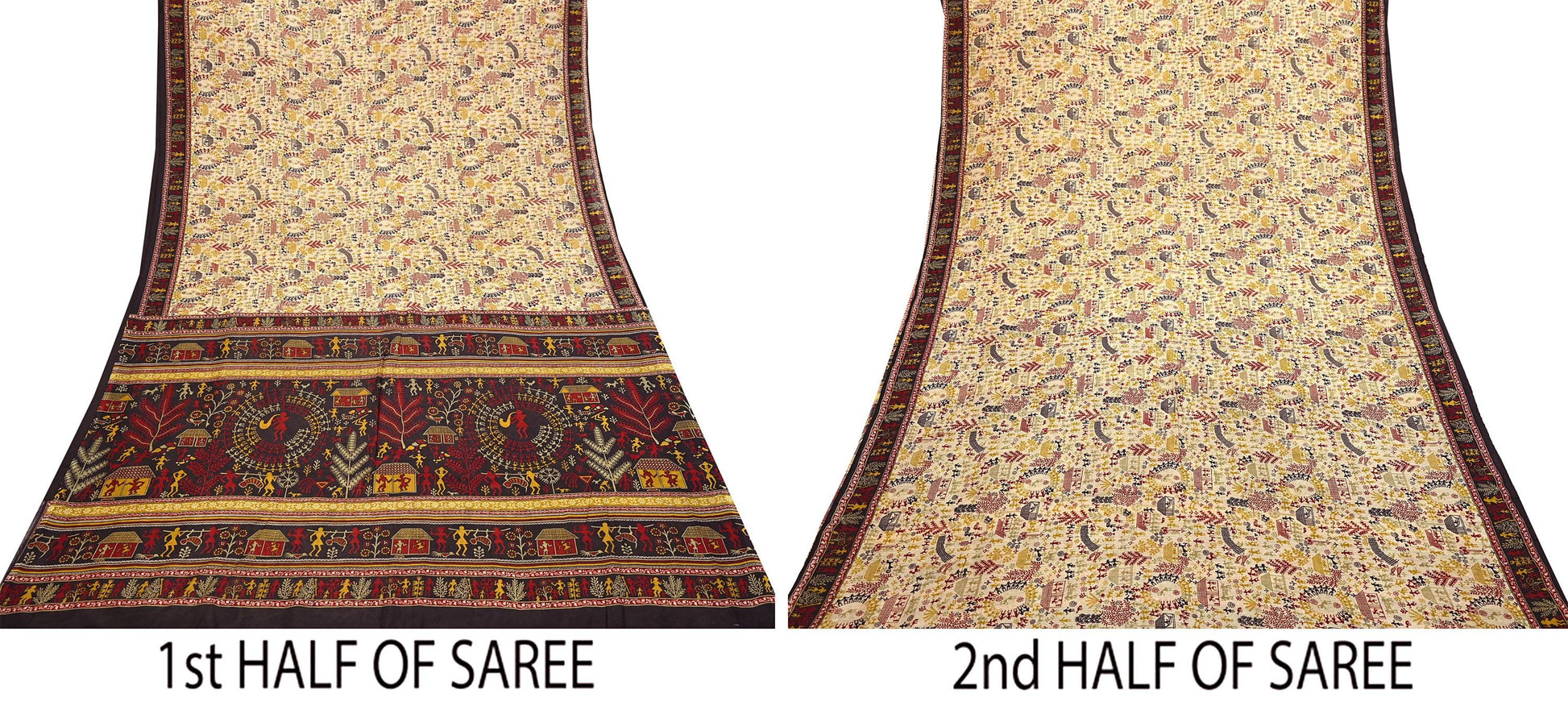 Indian Vintage Sari Beige & Black Pure Silk Warli Printed Saree Craft Fabric 5Yd Dress making Sewing Dress making For Crafting Quilting
