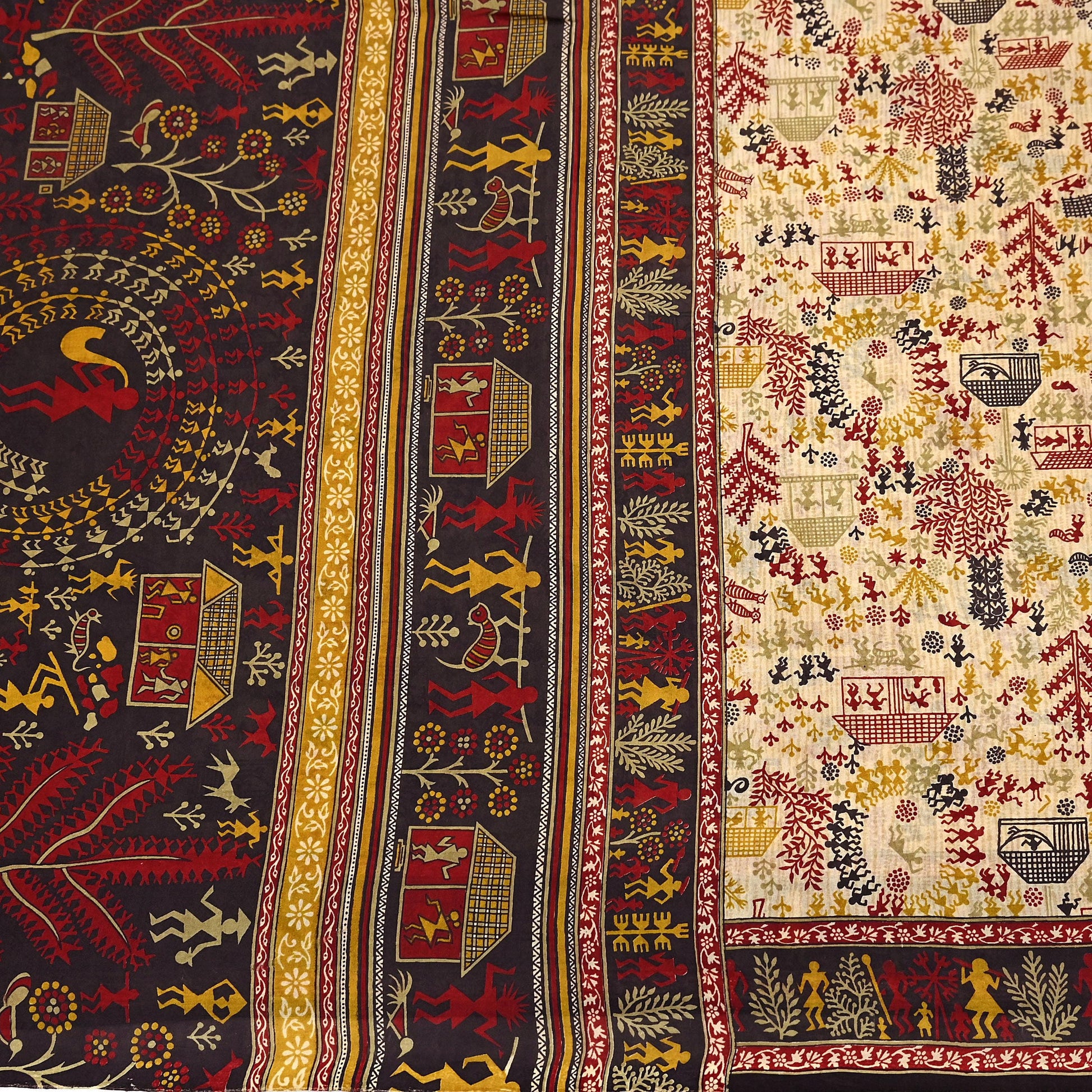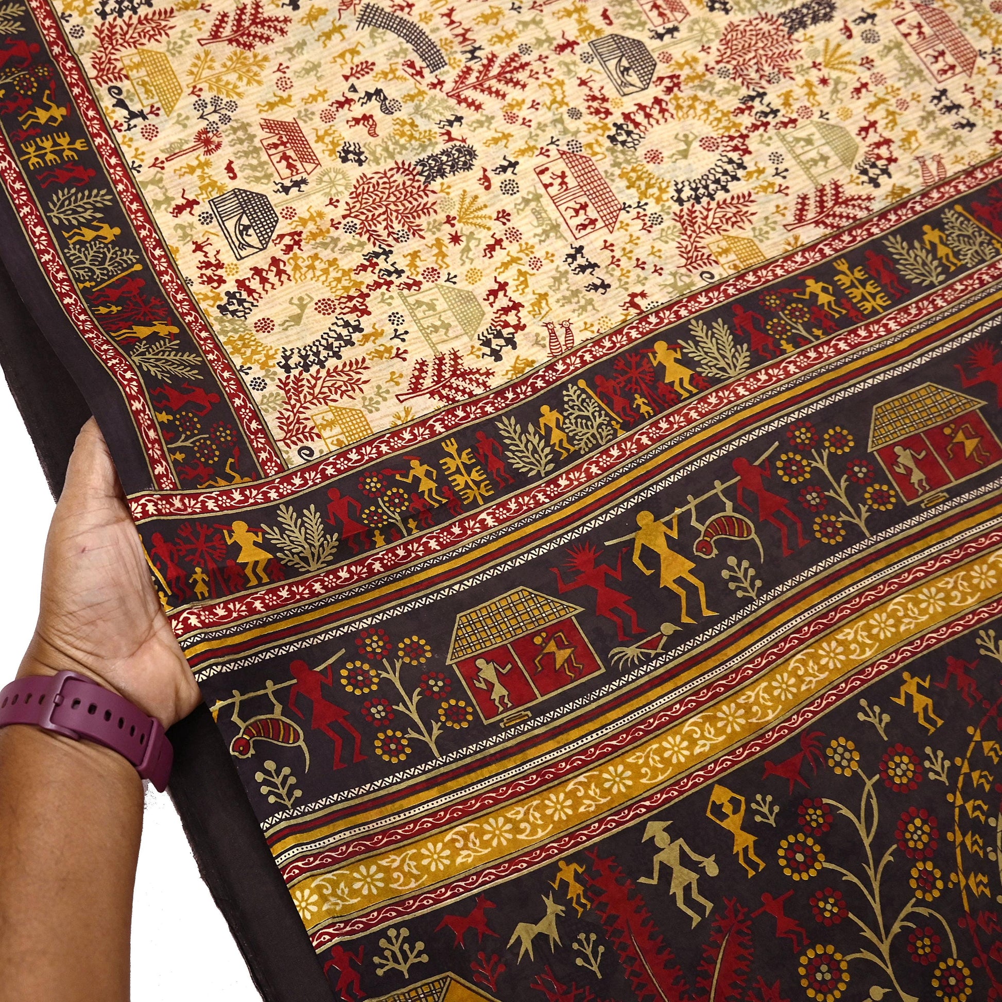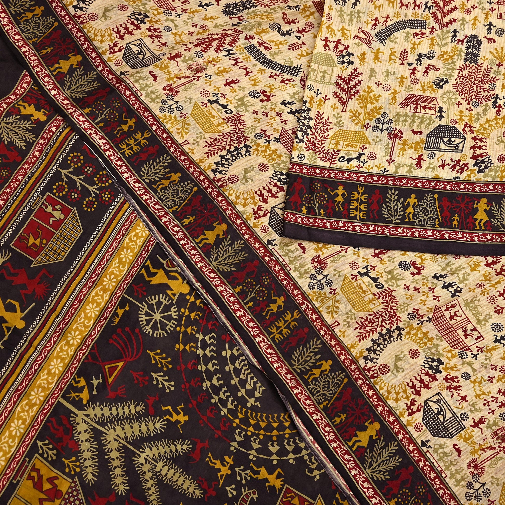 Indian Vintage Sari Beige & Black Pure Silk Warli Printed Saree Craft Fabric 5Yd Dress making Sewing Dress making For Crafting Quilting