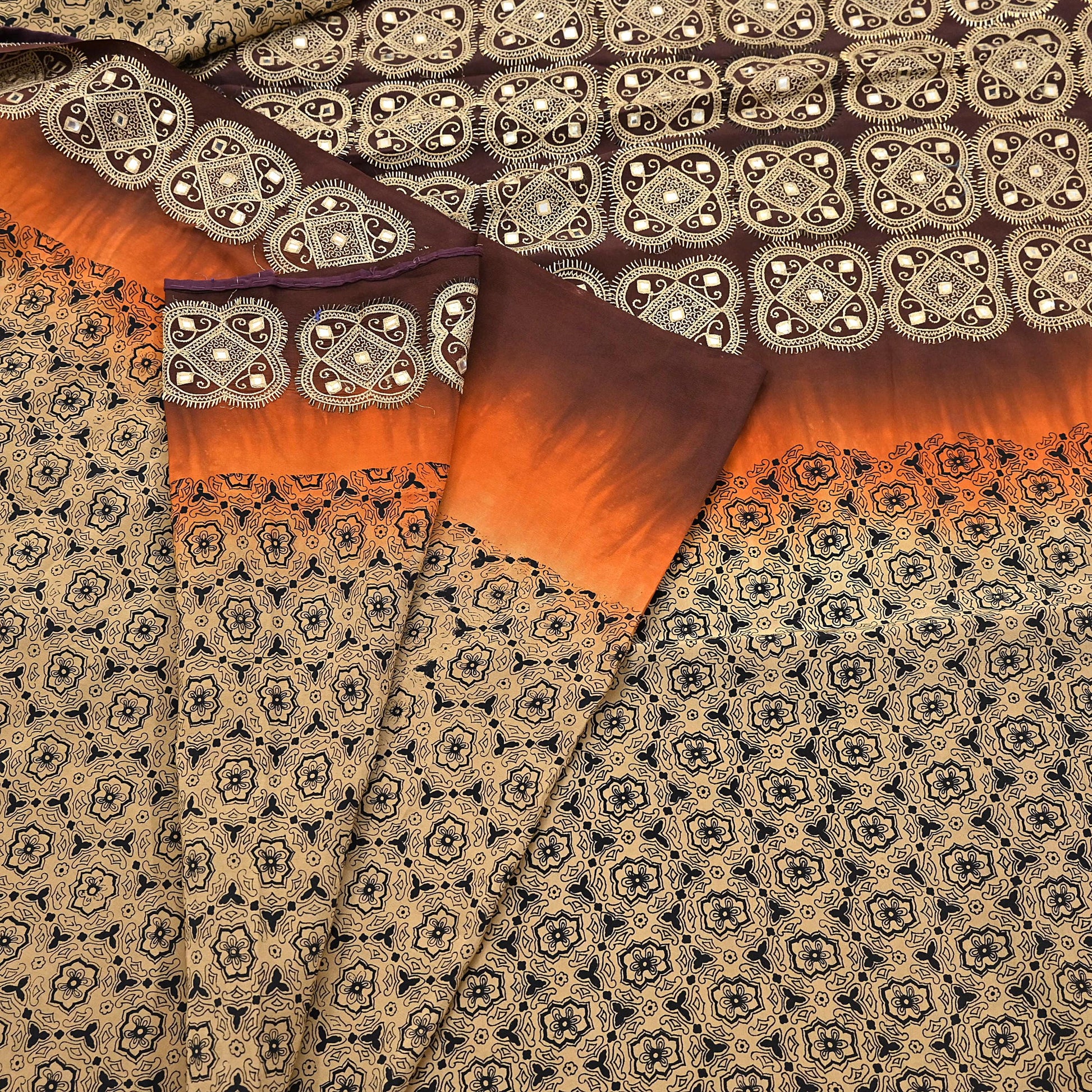 *Beautiful Beige & Brown Colored Hand Embroidered Block Print Pure Crepe Silk Saree.