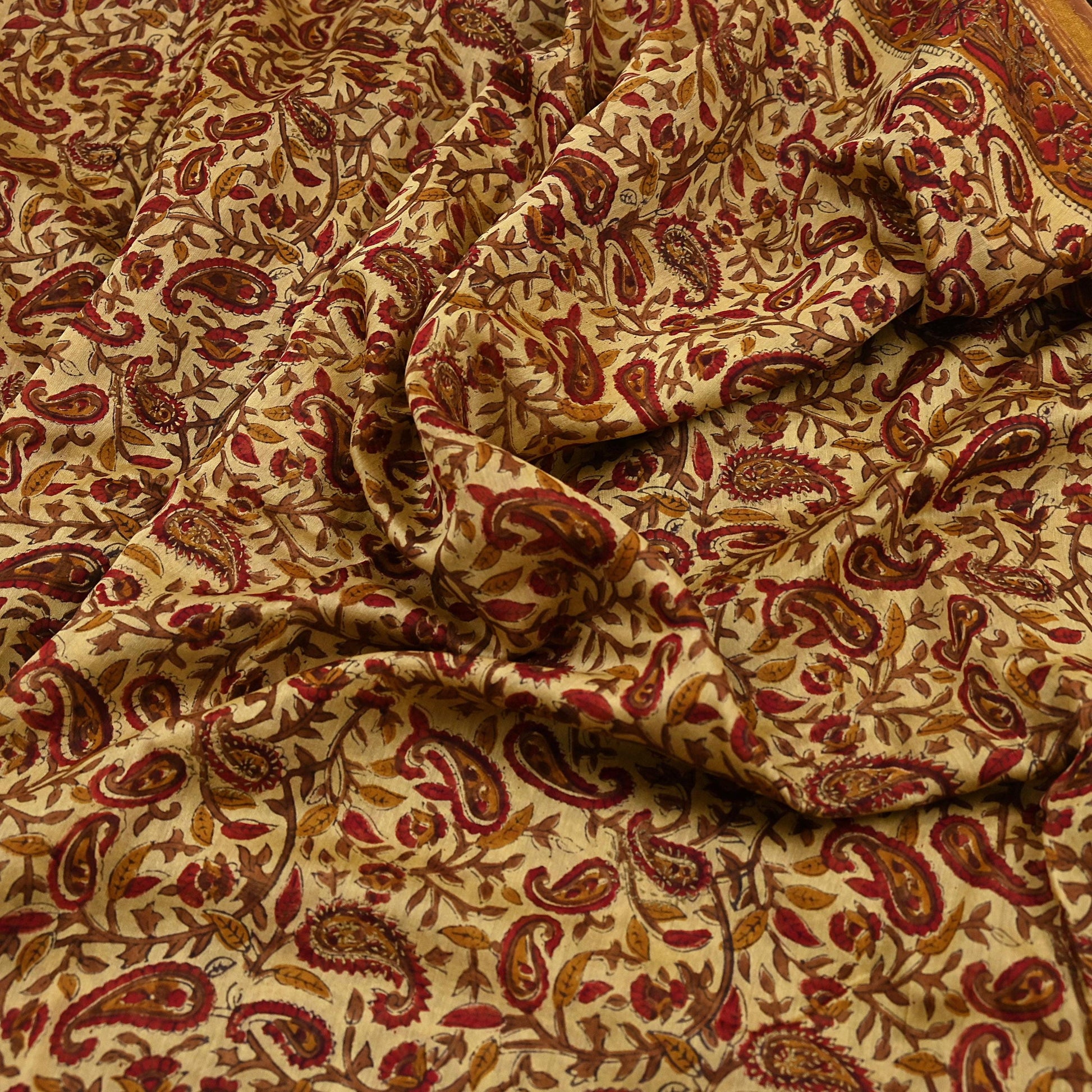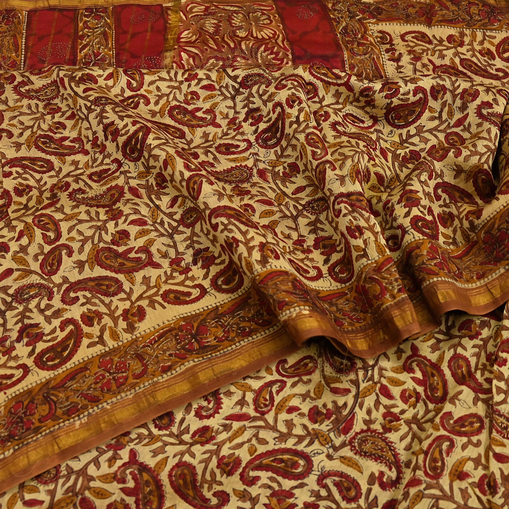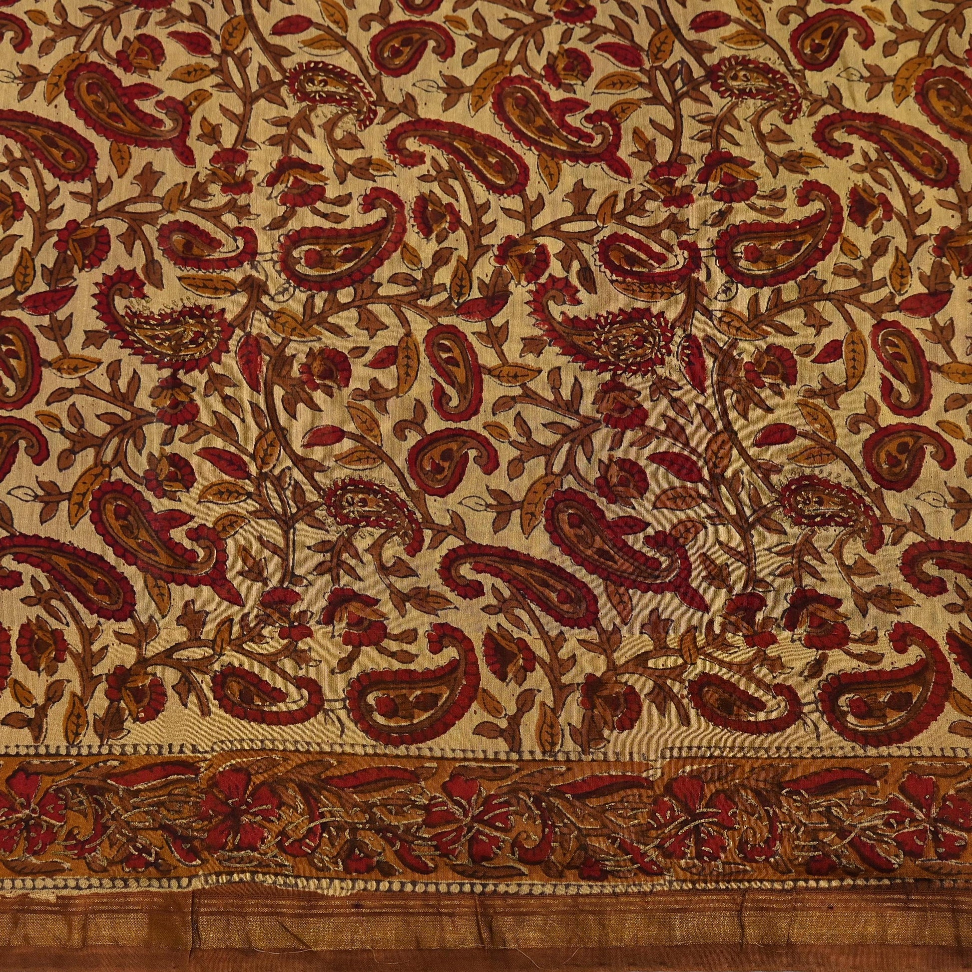 Indian Vintage Sari Beige chanderi Silk Bagru Printed Saree 5Yd Fabric Floral Soft Zari Border Ethnic Upcycle Crafting Dress making