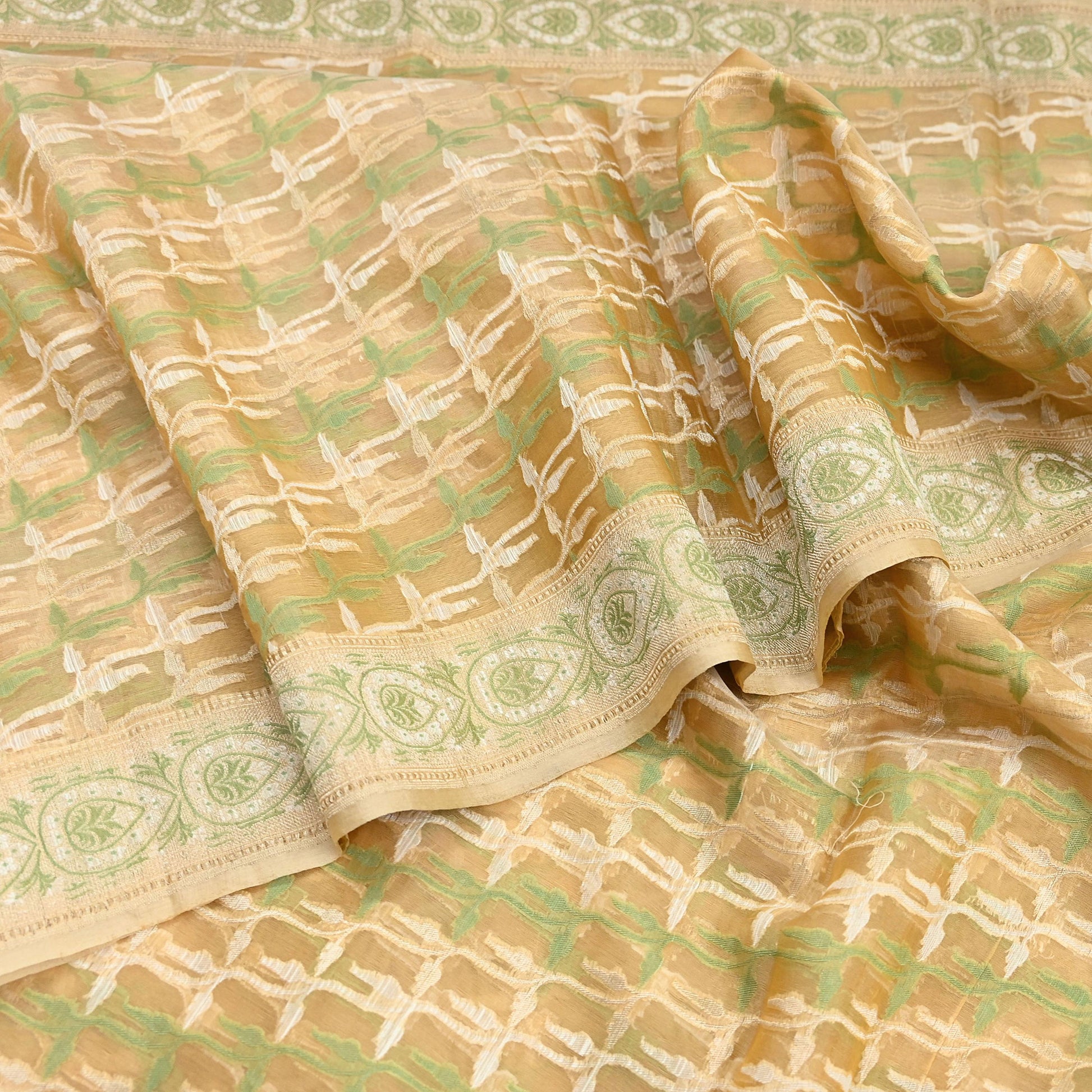 Indian Vintage Sari Beige Hand Woven 100% Pure Organza Silk Saree Craft Fabric 5Yd Dress Making Crafting Quilting Upcycle Fringes