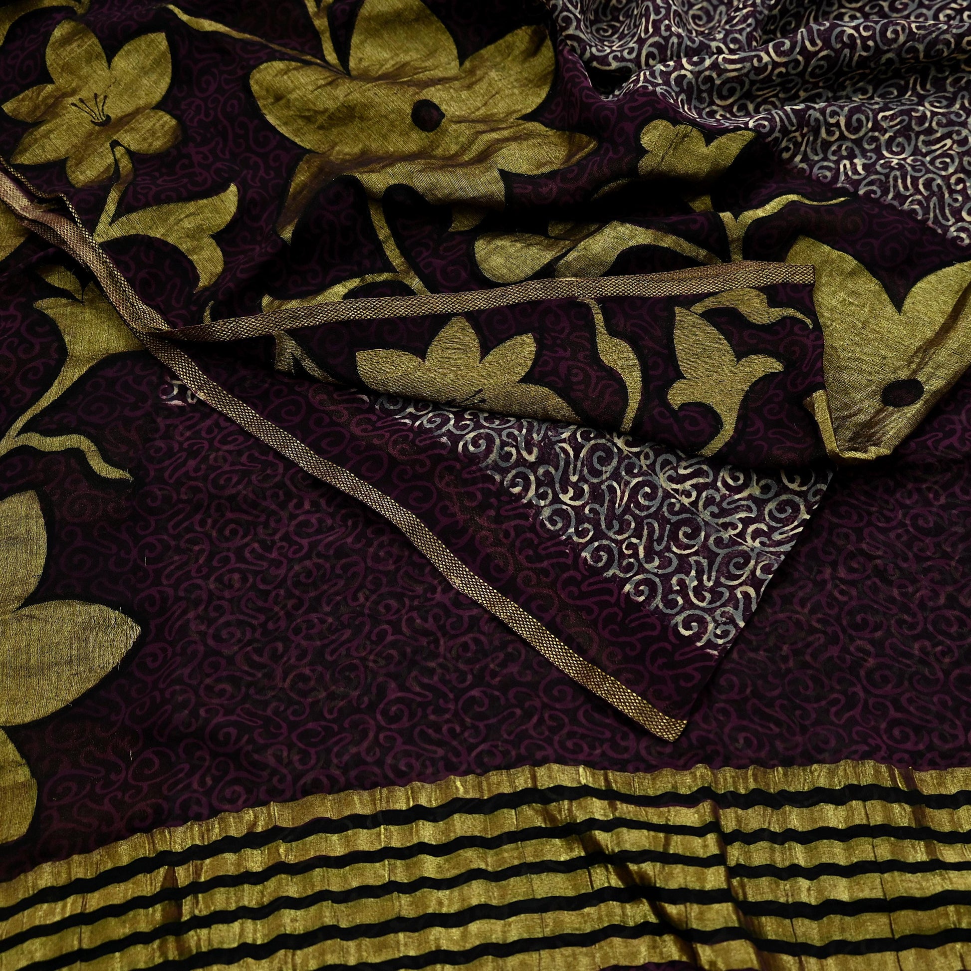 * Pallu & Border Has Printed Stripes, Floral Design. With Golden Woven Zari Border work.