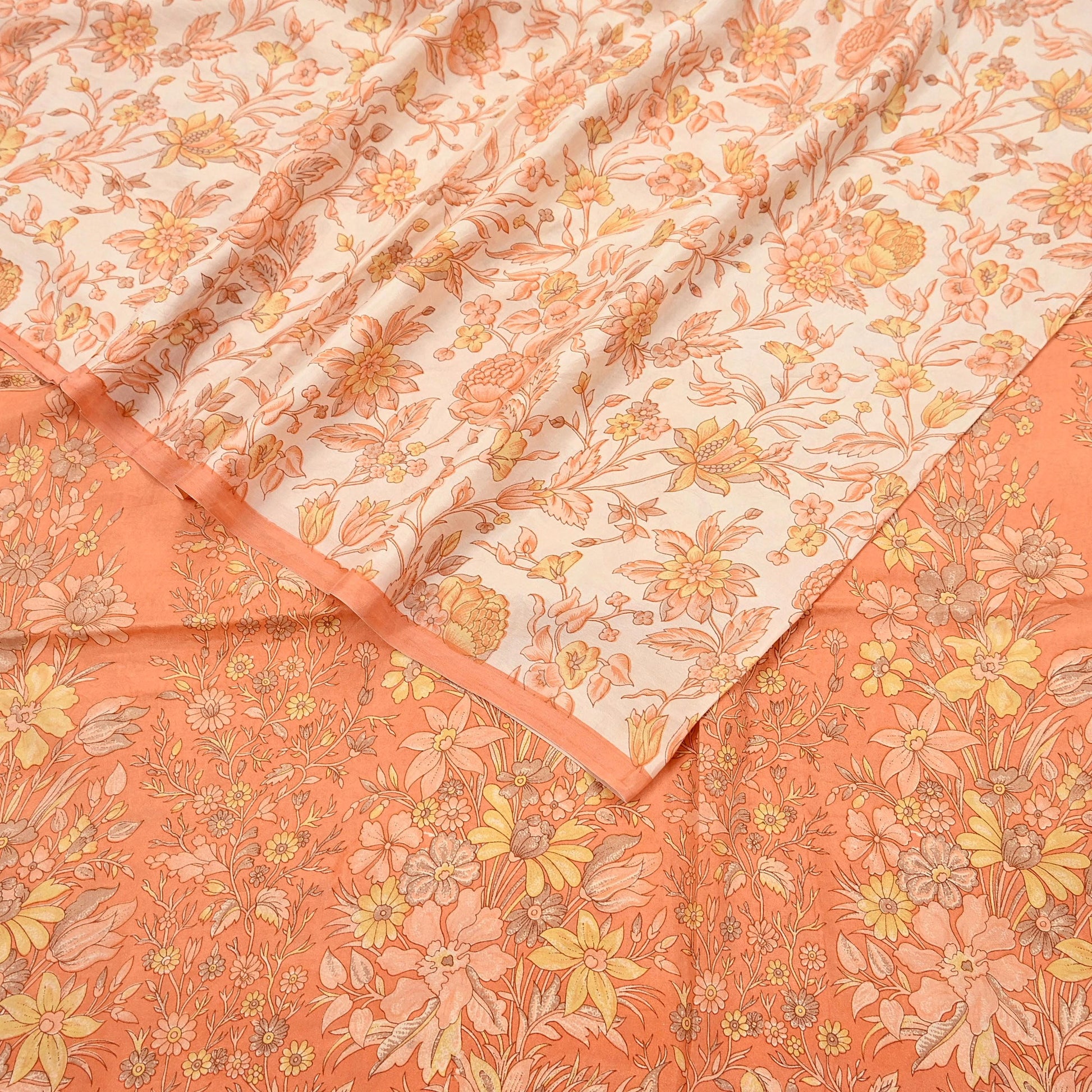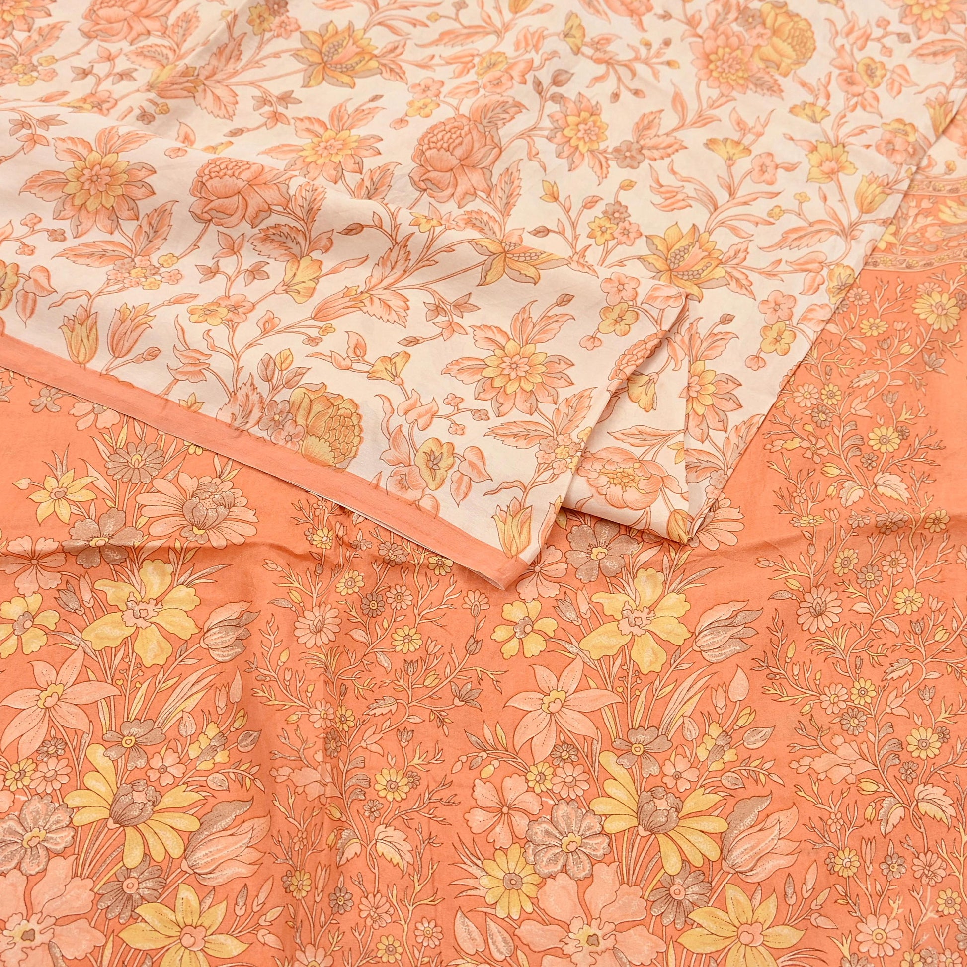 This vintage pure silk saree features a charming combination of Orange & beige hues adorned with elegant floral printed designs throughout. The pallu and borders showcase detailed floral patterns, continuing into the center part of the saree with matching motifs.