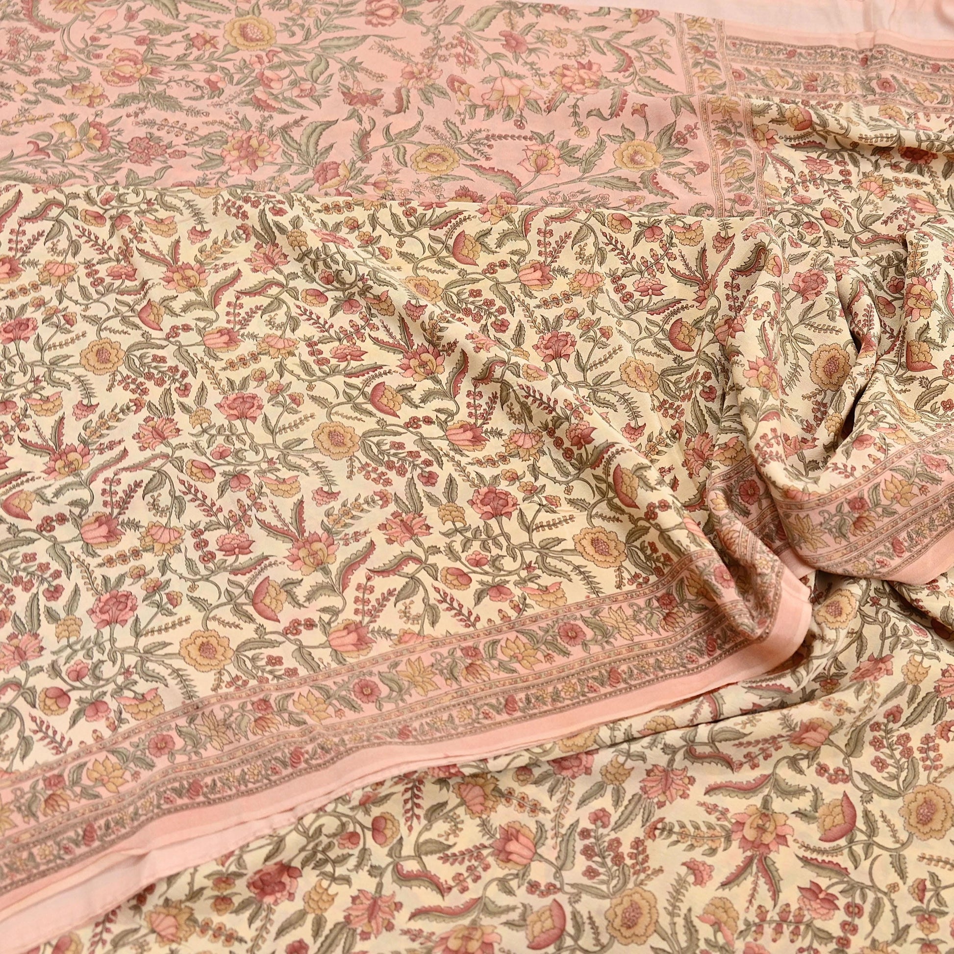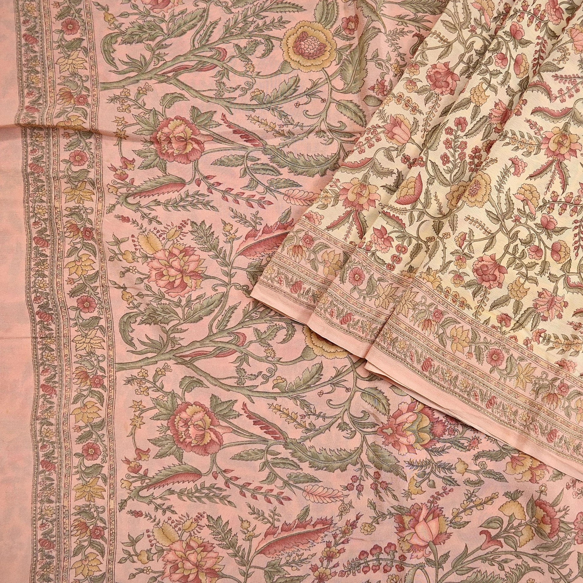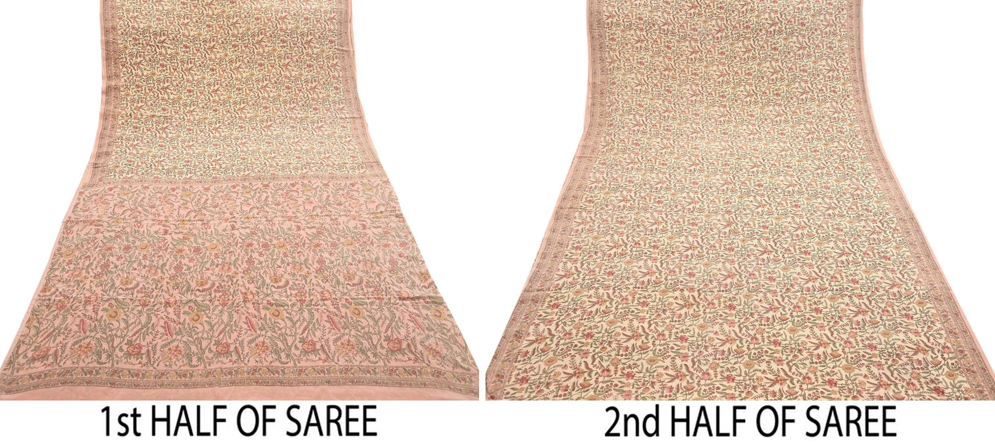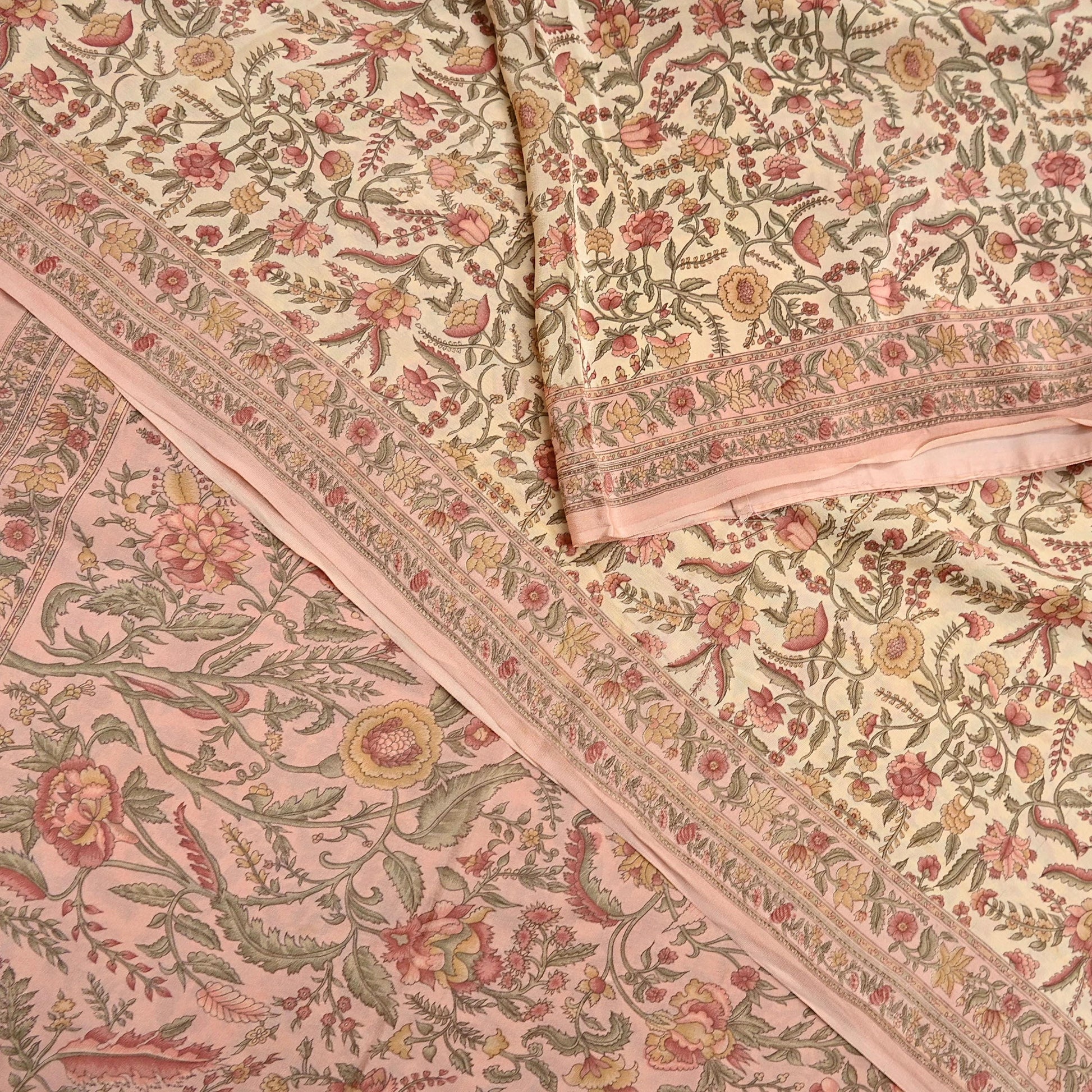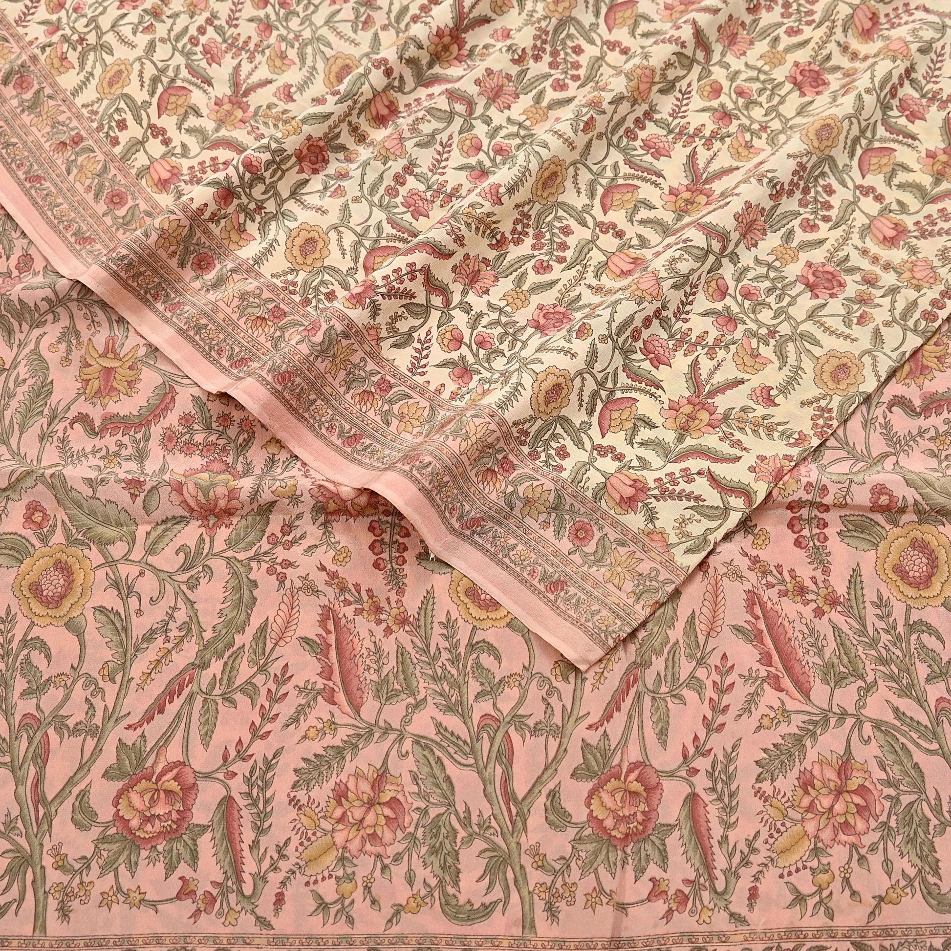 Indian Vintage Sari Beige & Peach Pure Crepe Silk Printed Saree 5yard Sewing Quilting Floral Soft Craft Fabric Wrap
