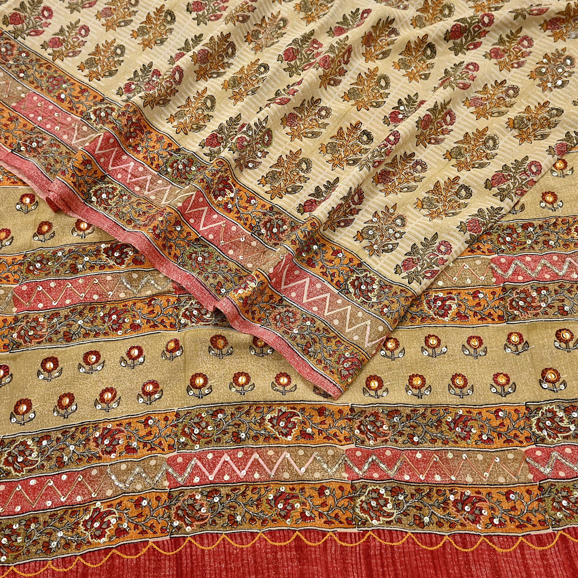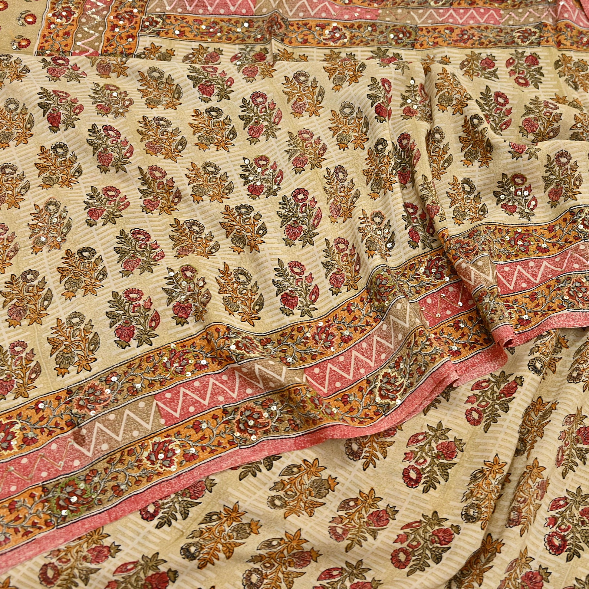 Nice Sequins Work With Printed Saree On Beige Color Base Fabric Is Really Enhancing The Beauty Of The Saree.
