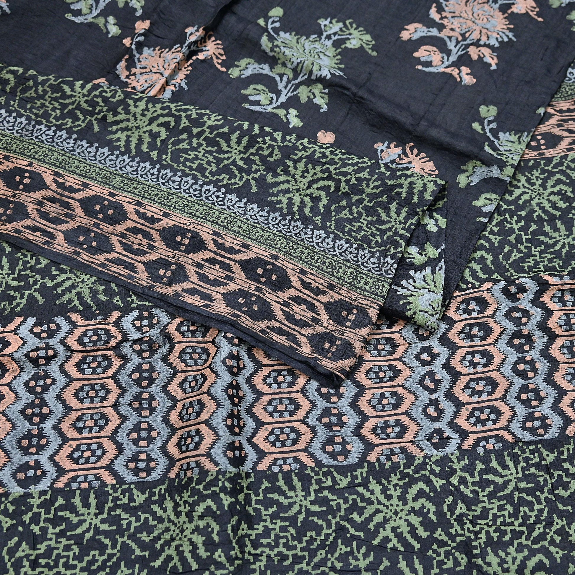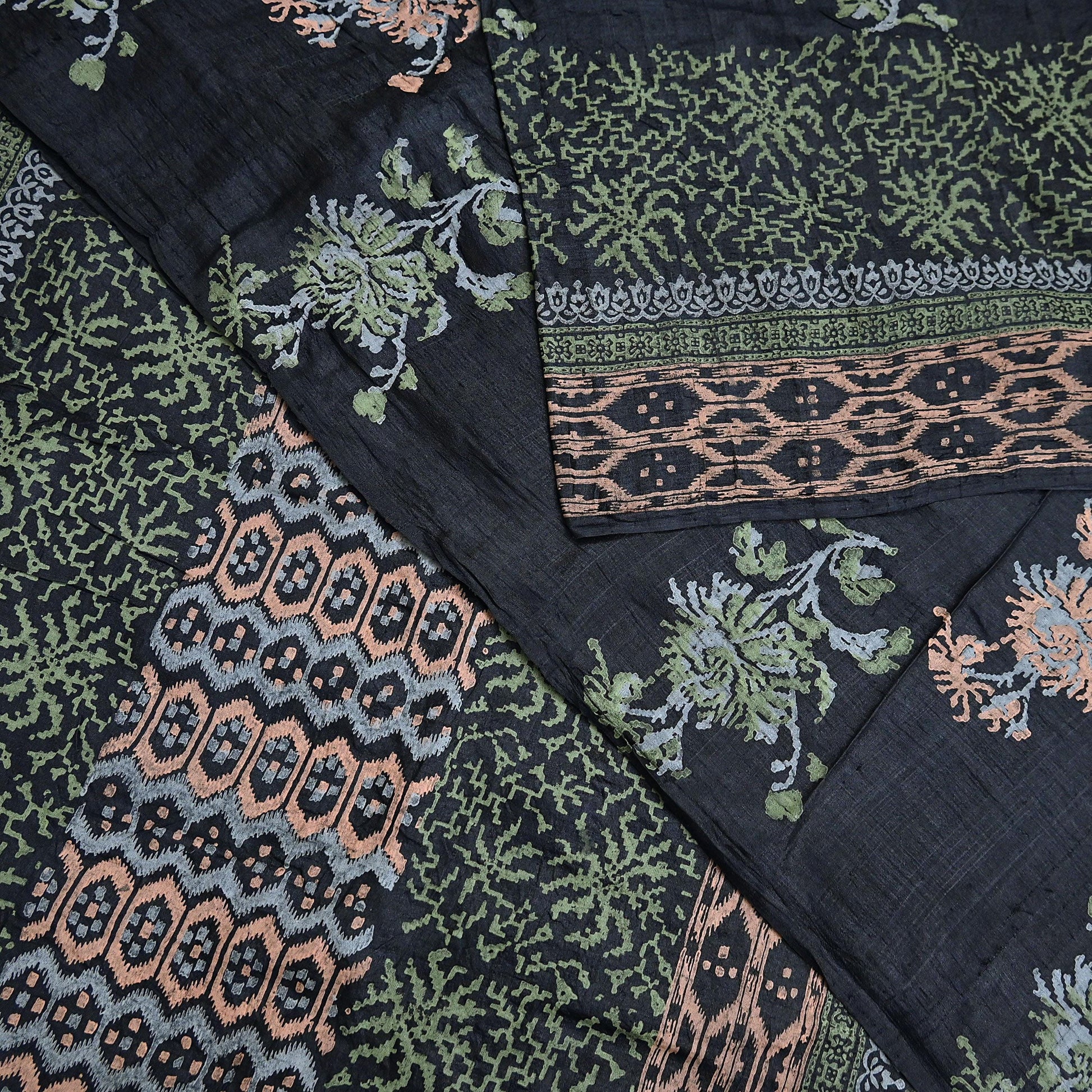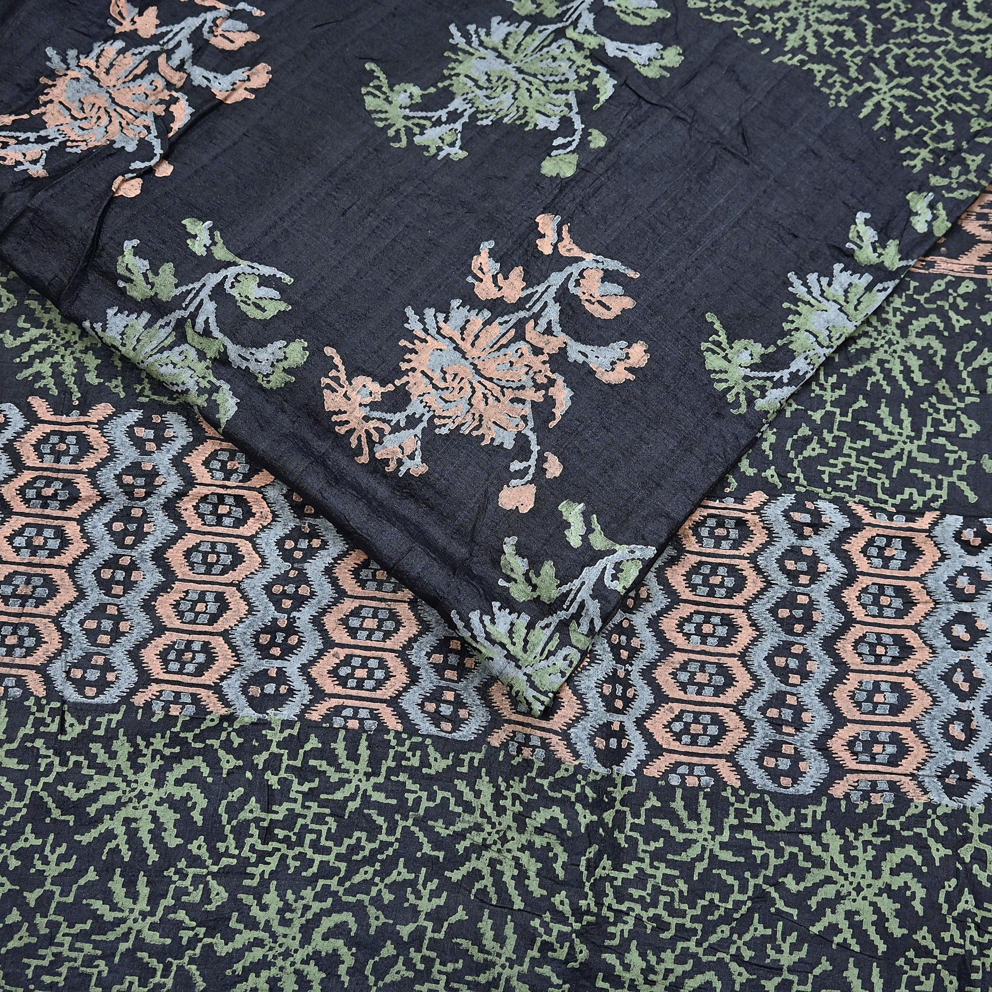 Indian Vintage Sari Black 100% Pure Tussar Silk Hand Painted Sarees 5yd Sewing Craft Fabric Dress Making Soft Woven Border Upcycle Quilting