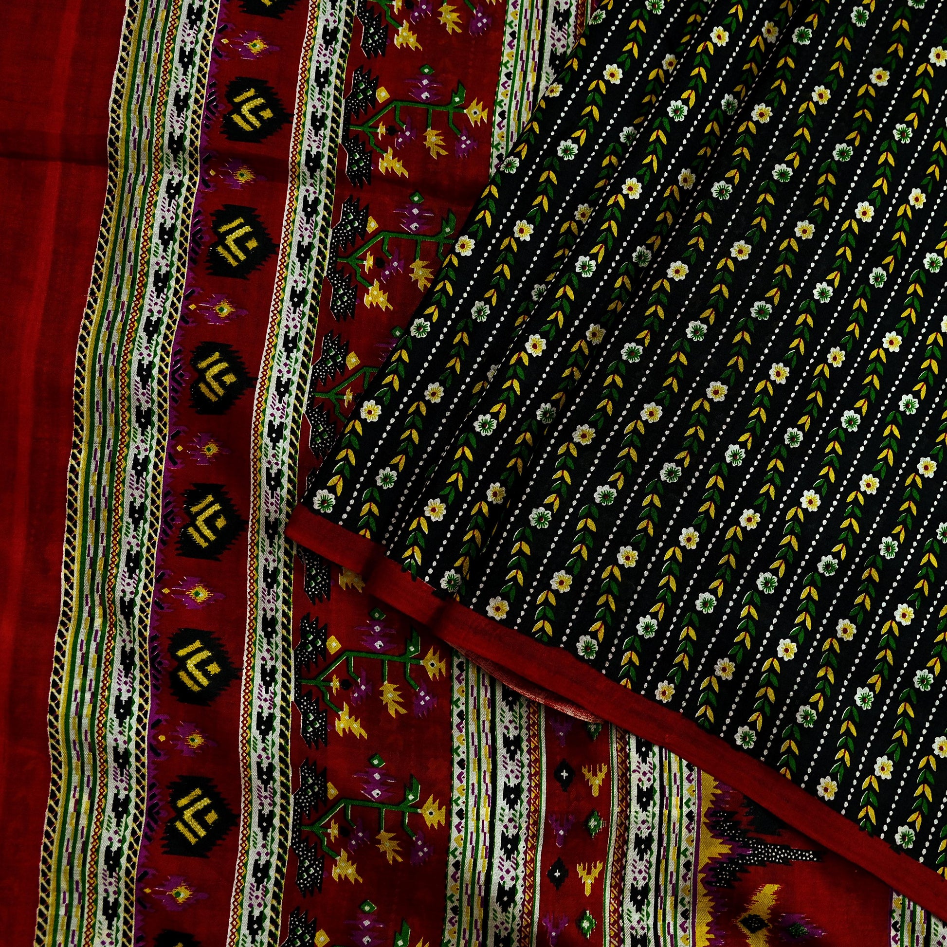 Nice Floral Design With Printed Work On Black & Red Color Base Fabric Is Really Enhancing The Beauty Of The Saree.