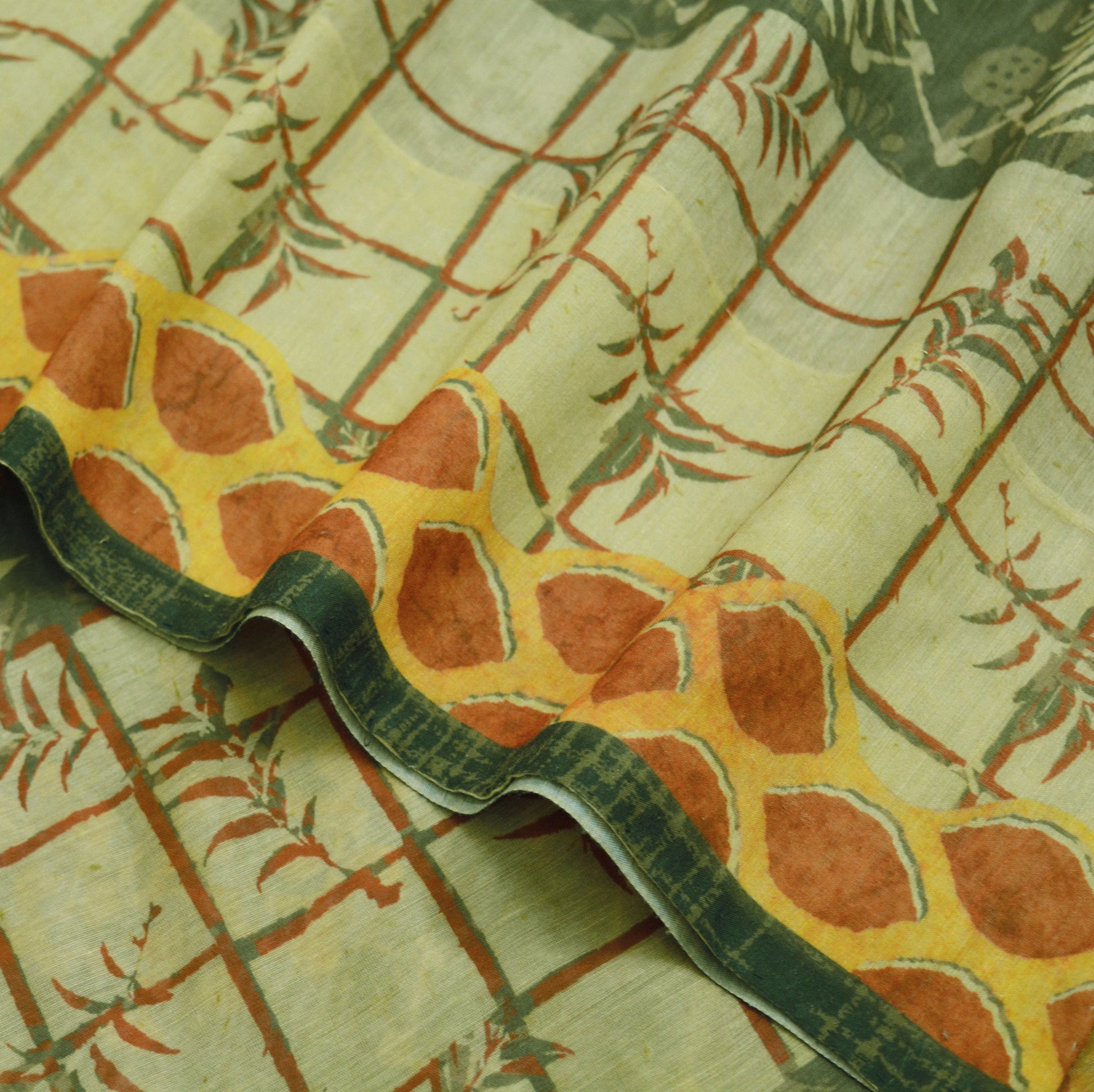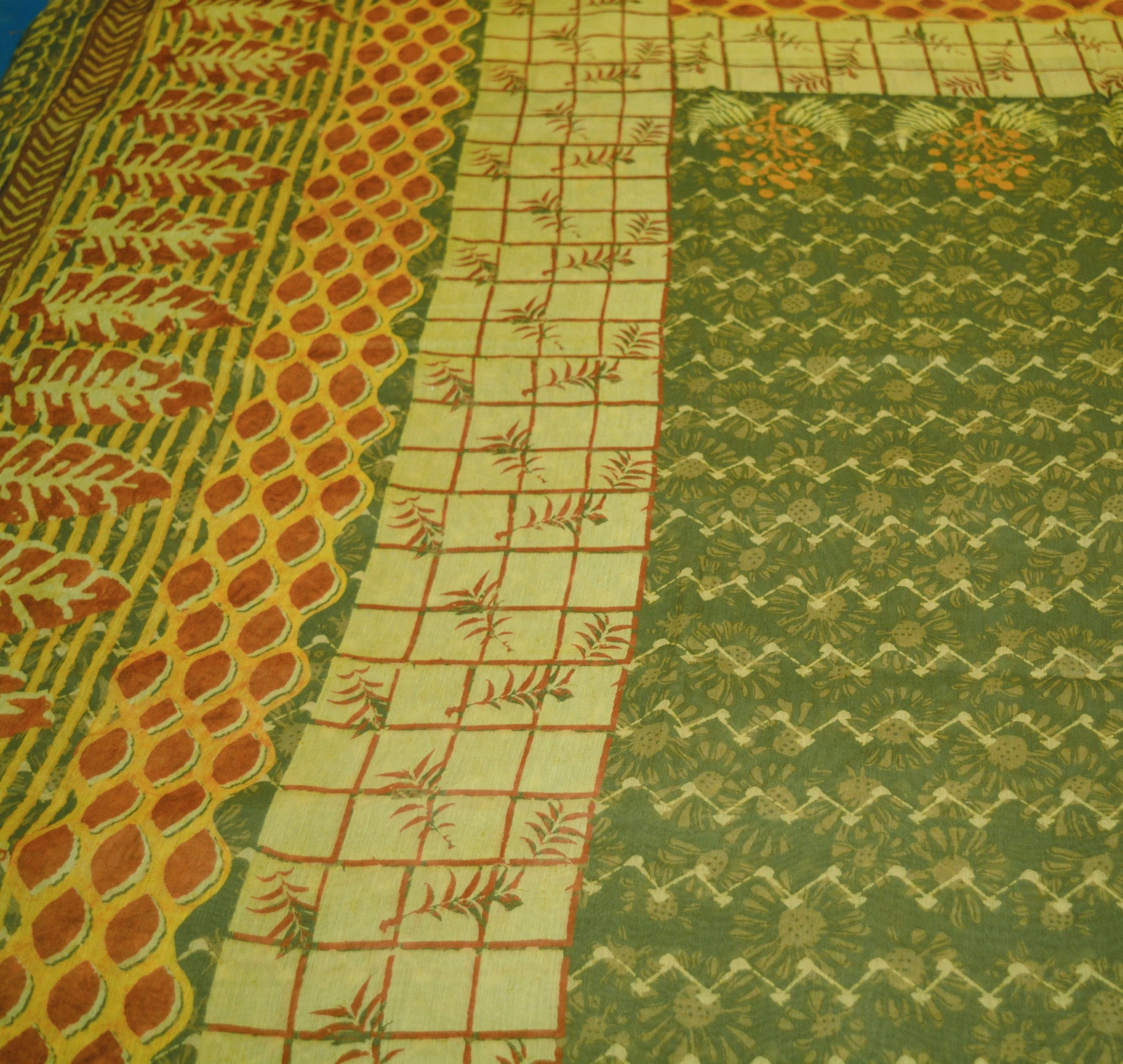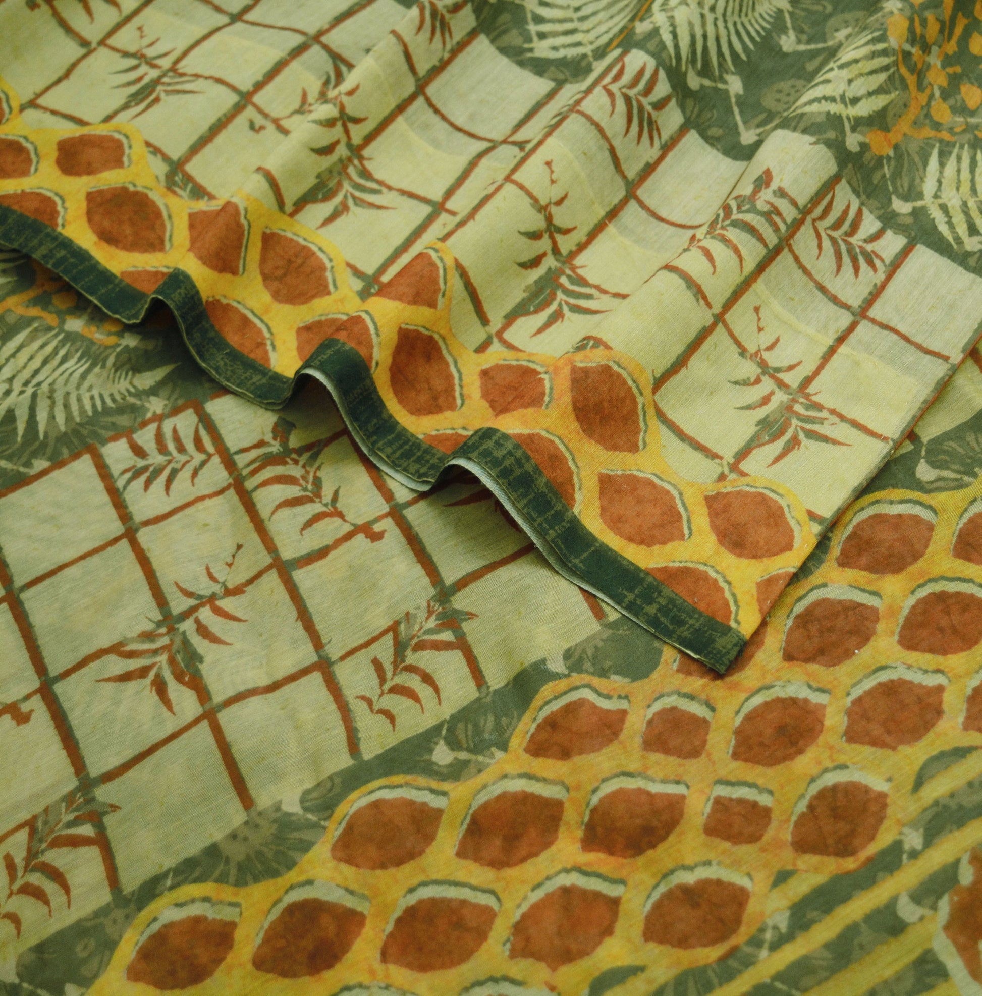 Indian Vintage Sari Block Printed Sari Chanderi Cotton Green & Ivory Fabric 5Yard Floral Soft Fringes