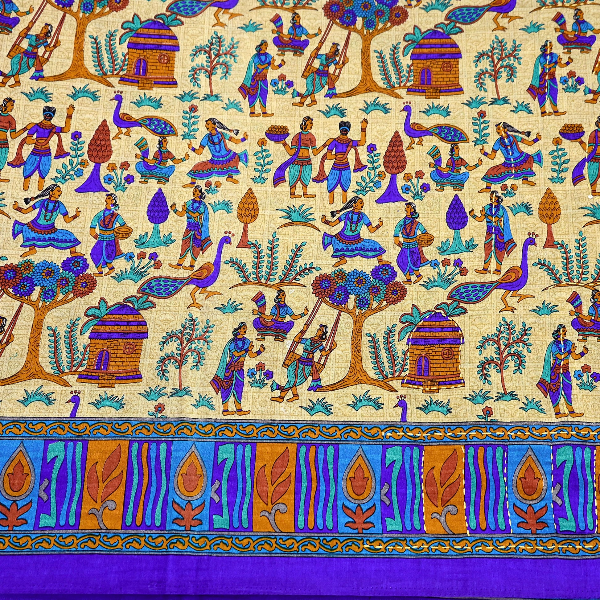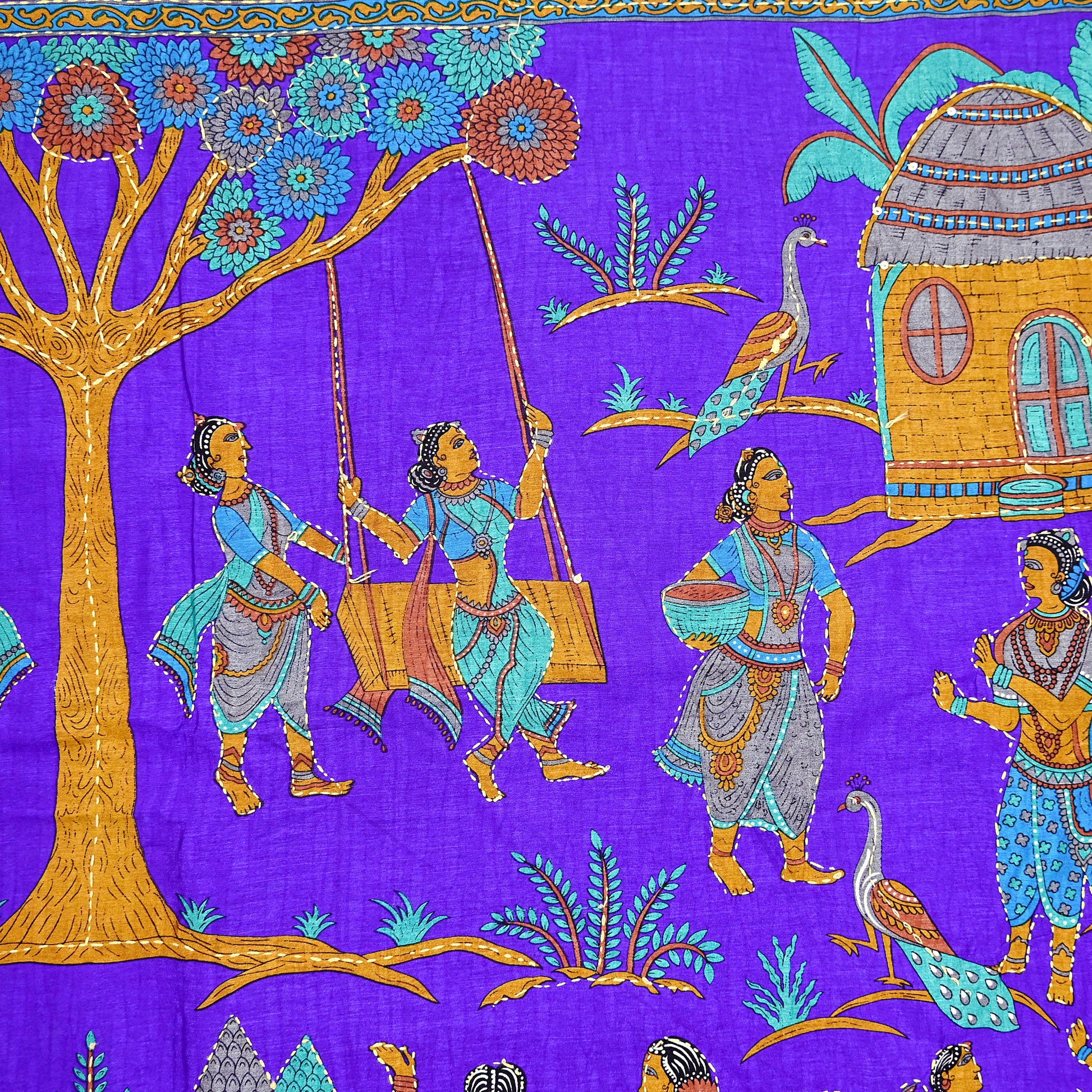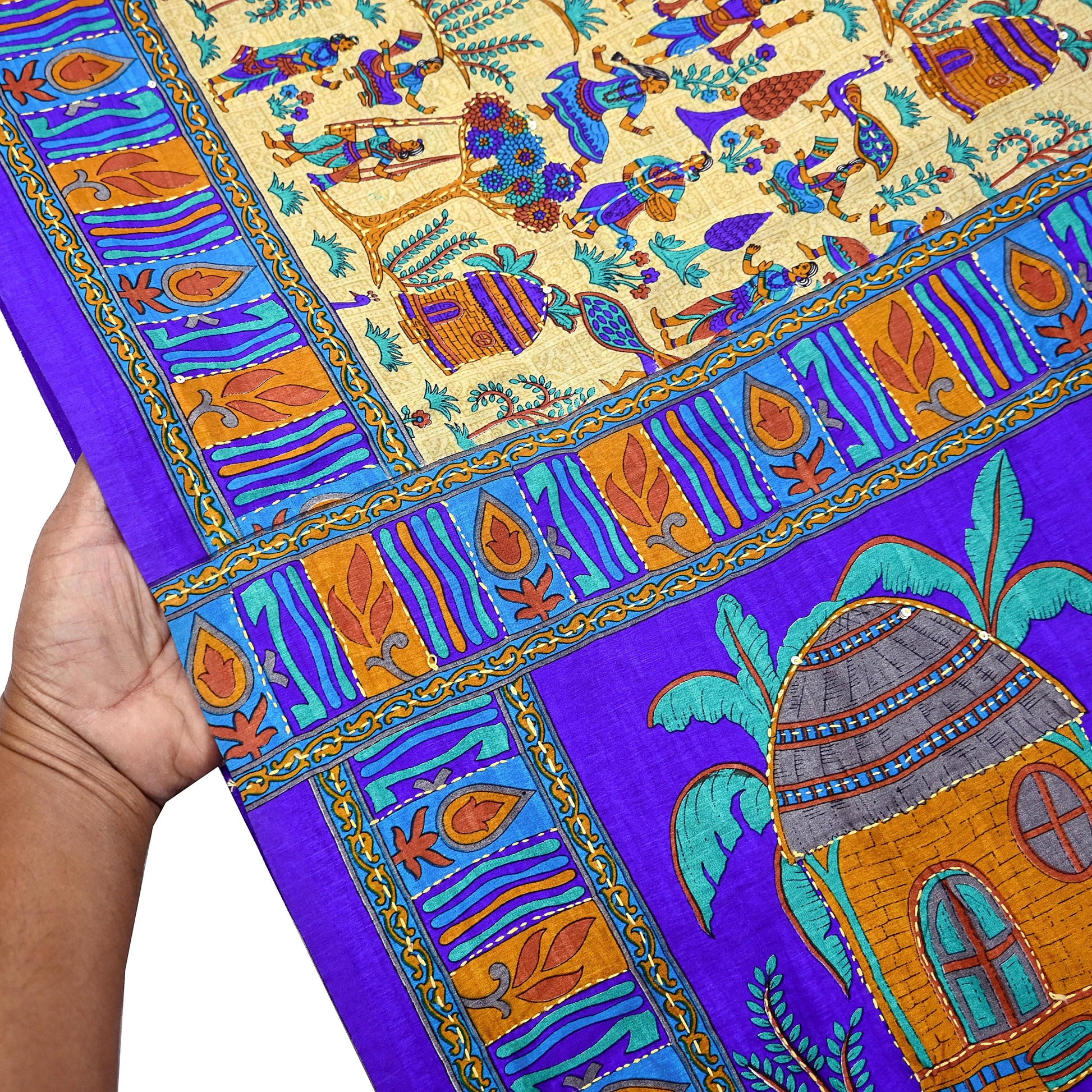 Embrace traditional charm with this beautiful vintage saree featuring intricate hand-embroidered Kantha work on a vibrant Blue & Beige artificial silk base. The sari showcases a delightful all-over VillageTheme pattern, intricately done in Green & Maroon thread, Golden sequins, Golden Zari—making it a stunning, one-of-a-kind piece for collectors, creators, or connoisseurs of Indian textile heritage.