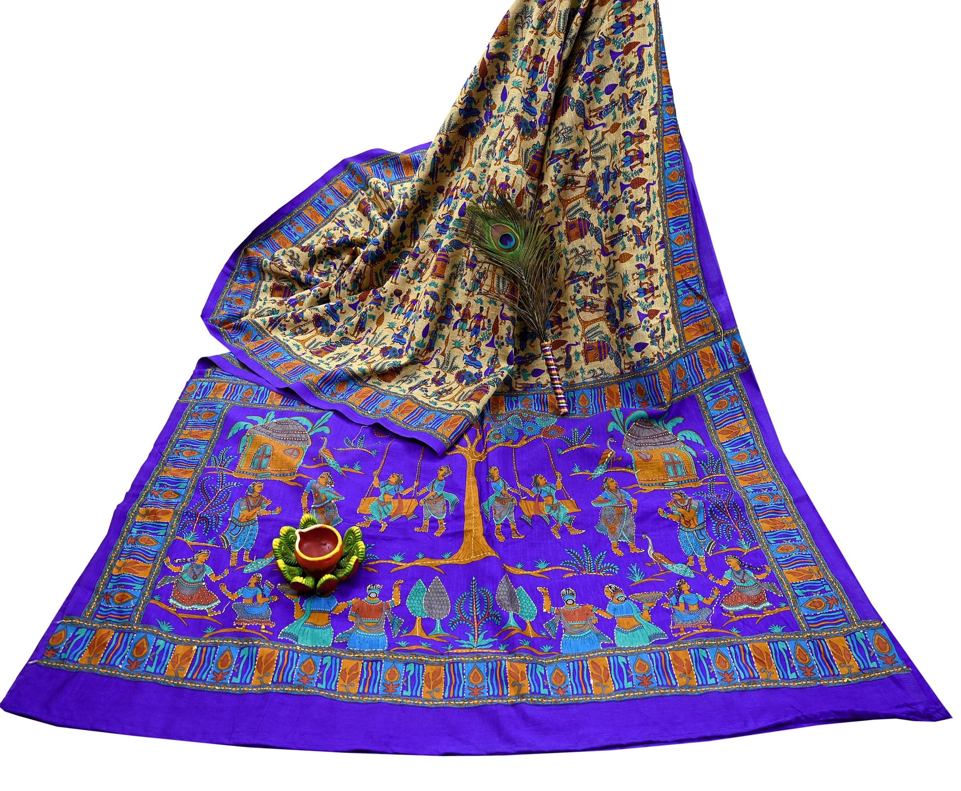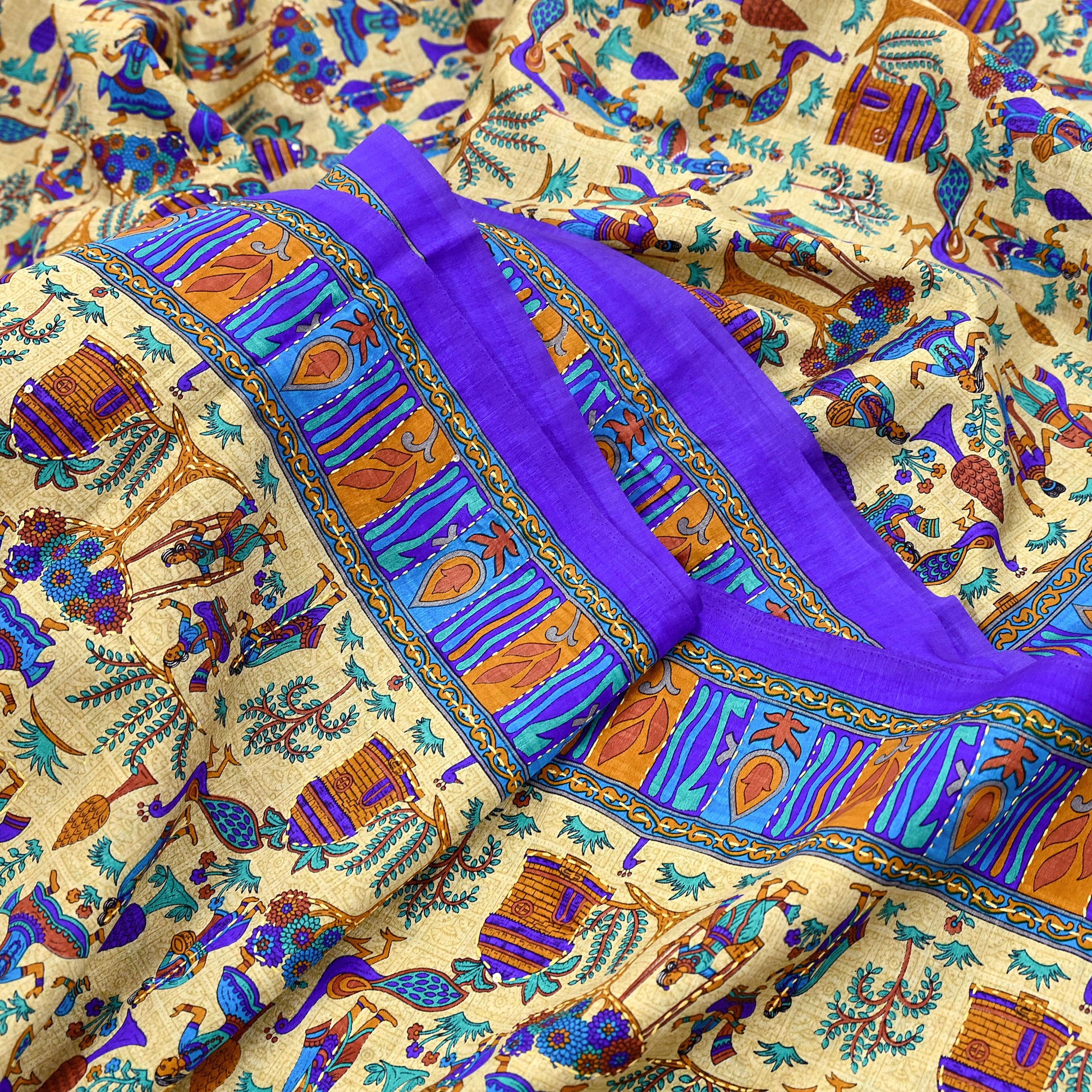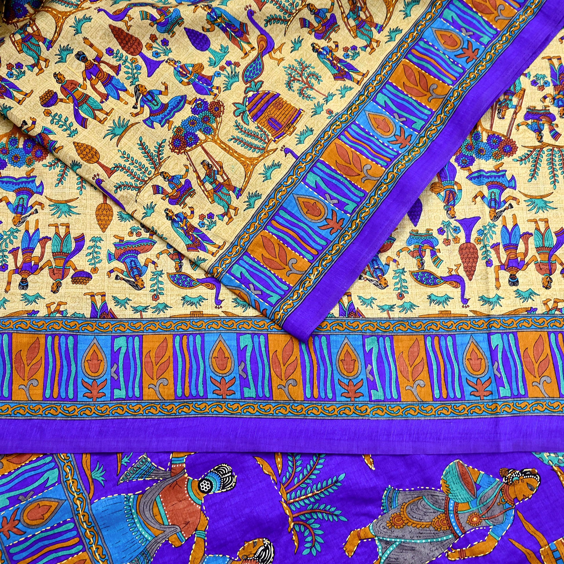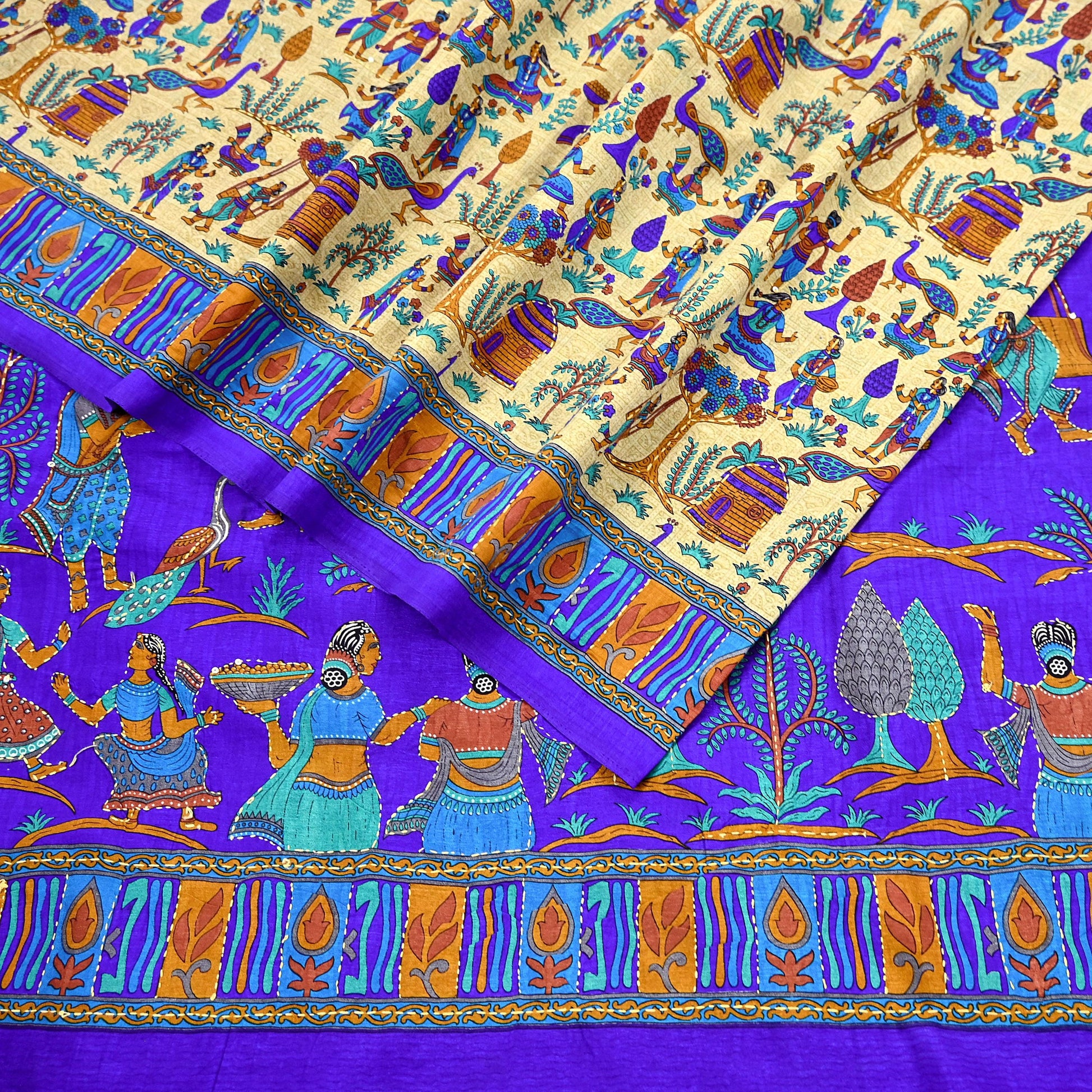 Embrace traditional charm with this beautiful vintage saree featuring intricate hand-embroidered Kantha work on a vibrant Blue & Beige artificial silk base. The sari showcases a delightful all-over VillageTheme pattern, intricately done in Green & Maroon thread, Golden sequins, Golden Zari—making it a stunning, one-of-a-kind piece for collectors, creators, or connoisseurs of Indian textile heritage.