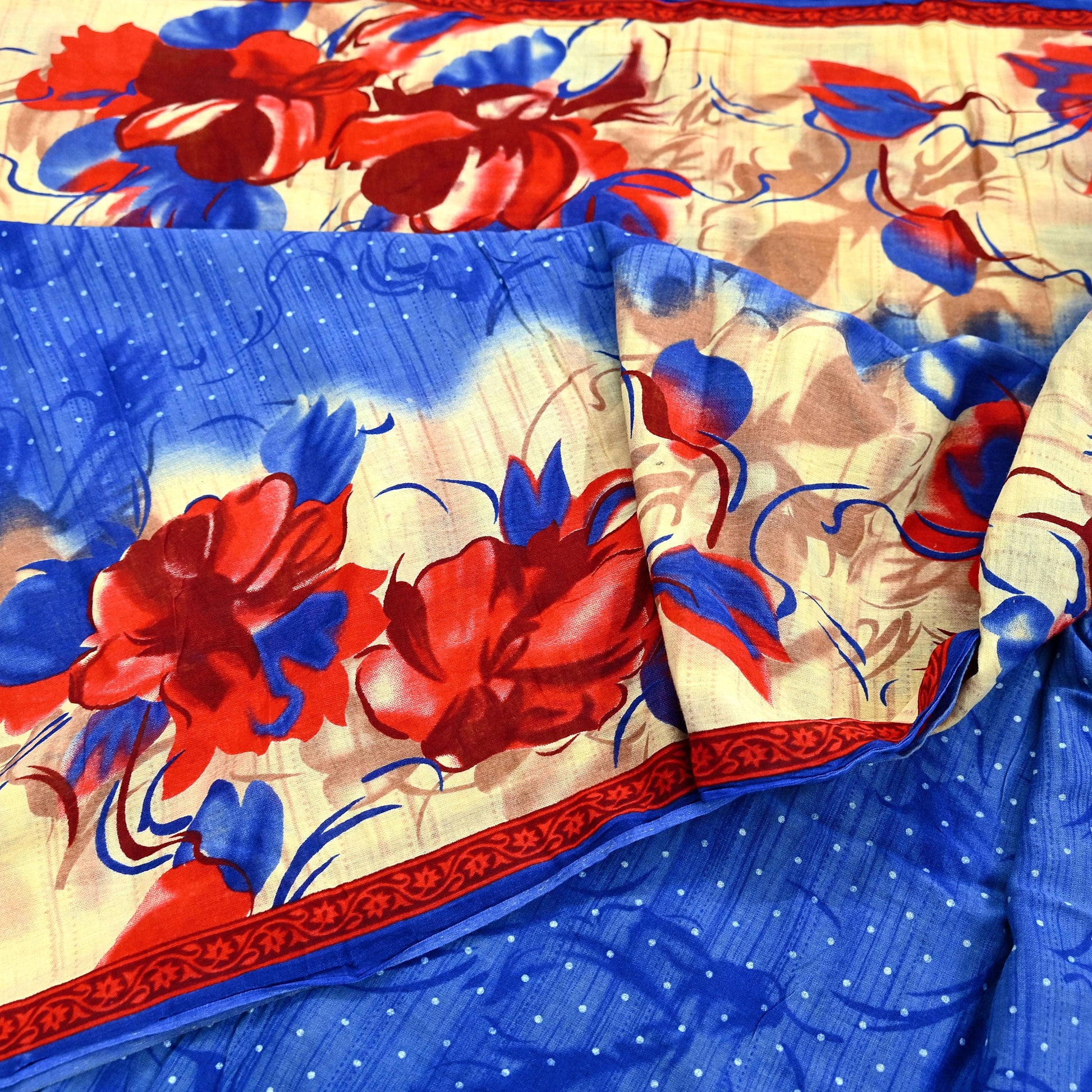 Indian Vintage Sari Blue & Beige Printed 100% Pure Cotton Sarees Craft Fabric 5Yd Sewing Soft Sarong Wrap Floral Dress Making Shrug Quilting