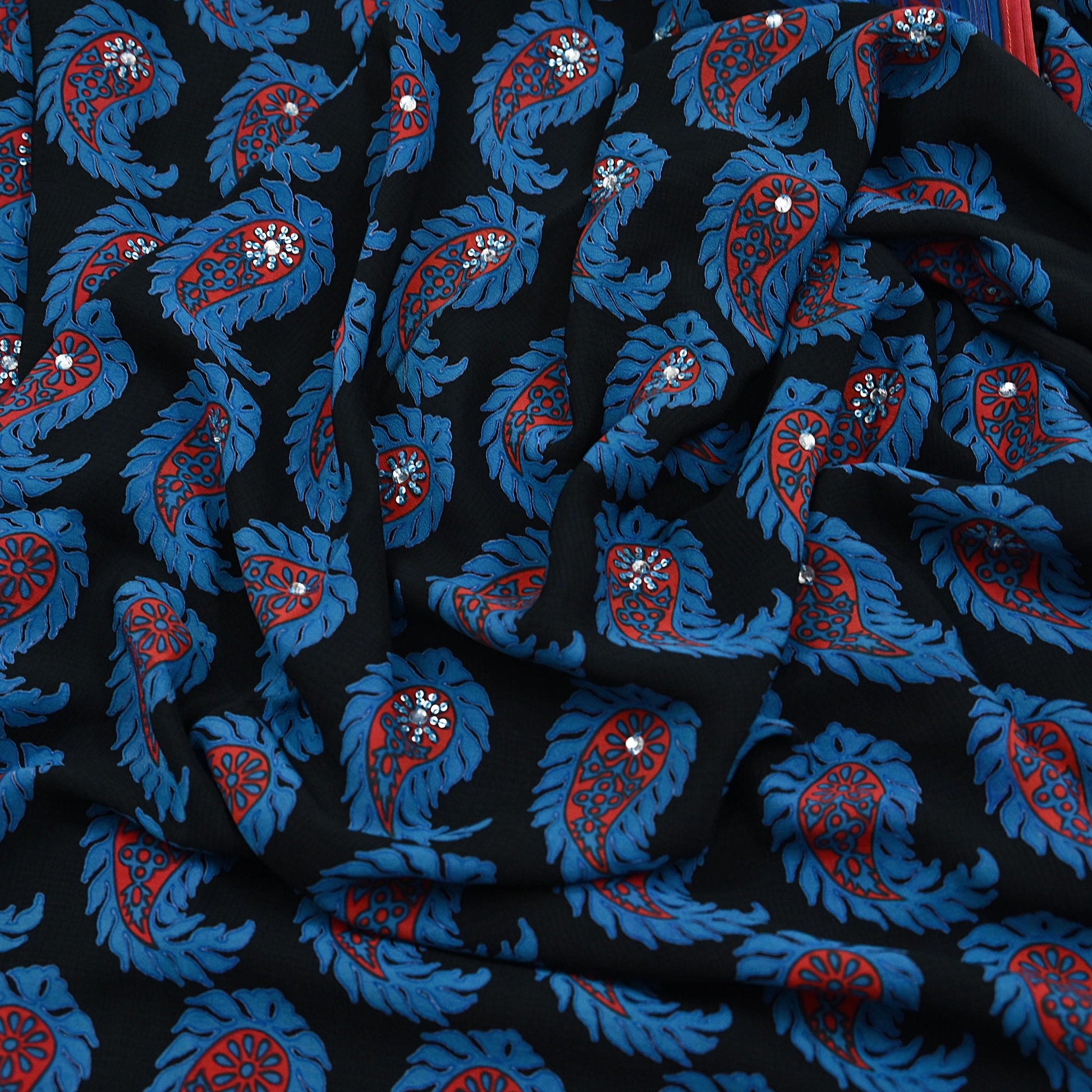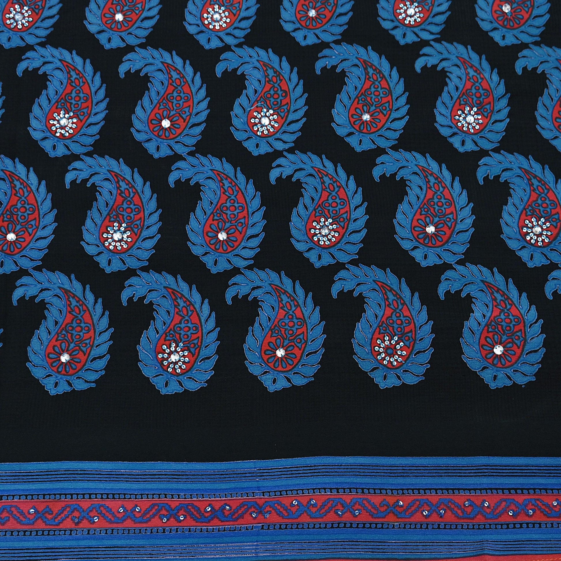 Nice Sequins Work With Printed Saree On Blue & Black Color Base Fabric Is Really Enhancing The Beauty Of The Saree.
