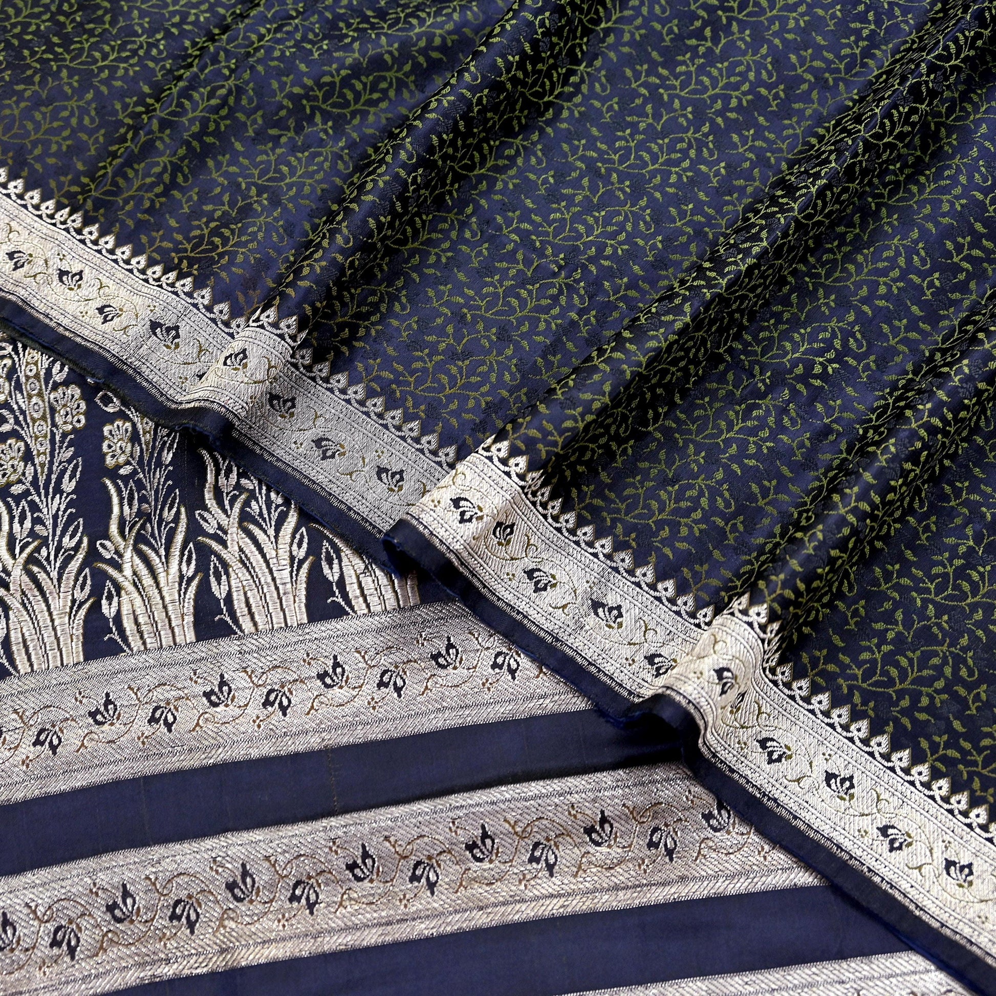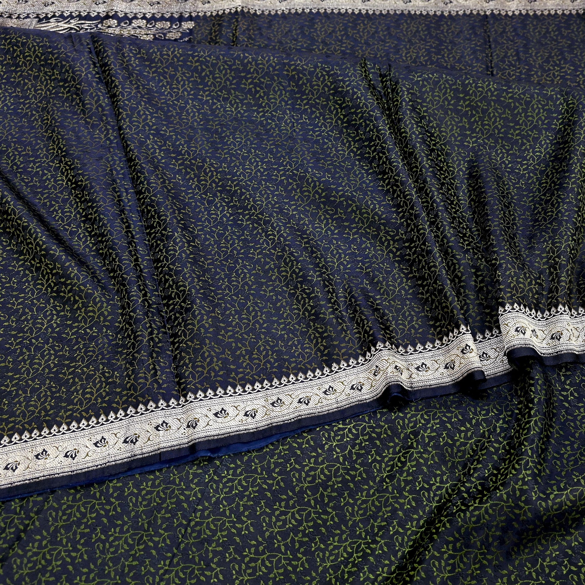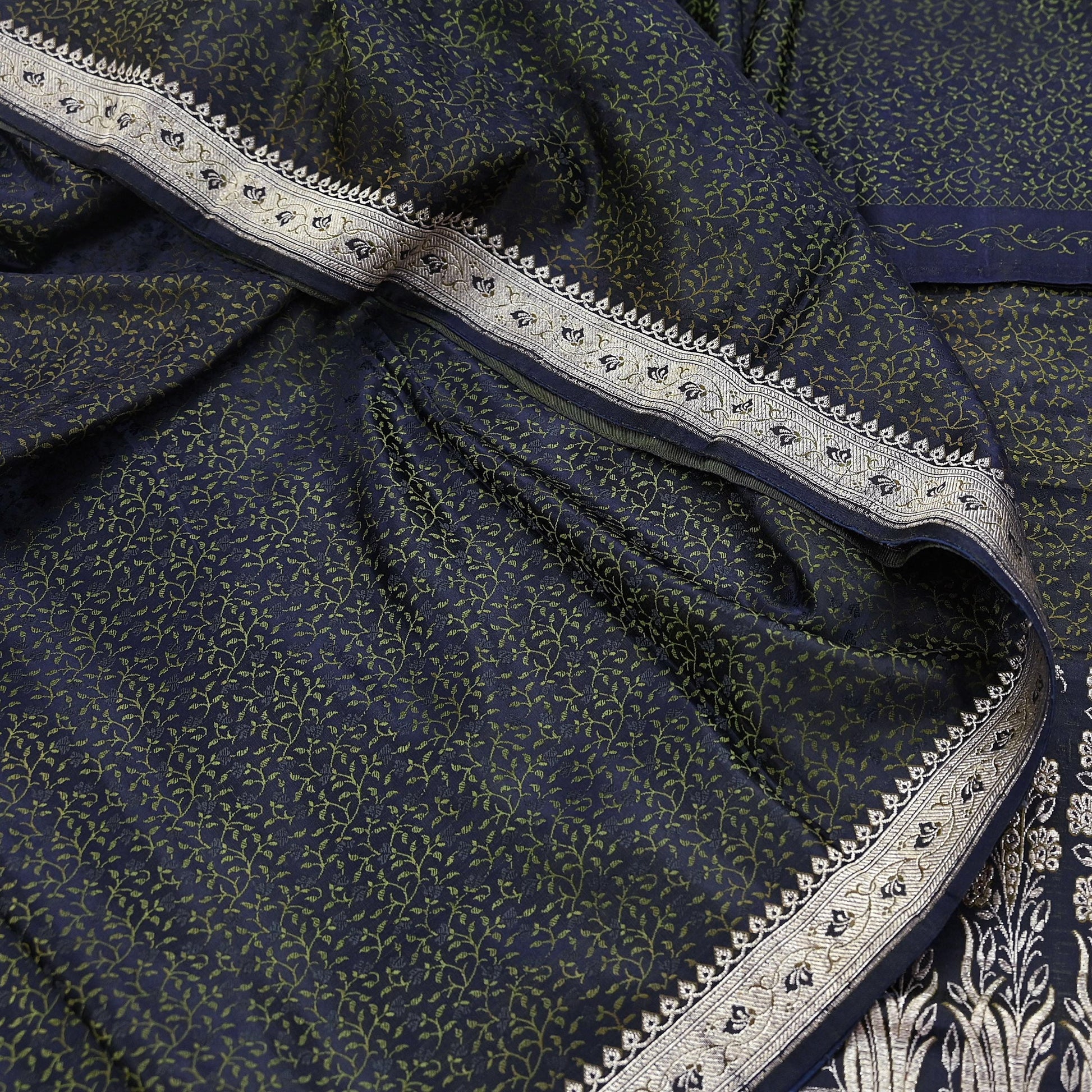 Beautiful Vintage Blue Color Color Woven Tanchoi (Banarasi Jamawar) Heavy Saree Which Is Crafted With 100% Pure Satin Silk Base Fabric The pallu & border sari features Paisley & Floral design embellished with Green, Blue Colored Woven Thread Work. Also you can see similar work with floral & Paisley pattern in center part adds to its beauty. Golden Woven zari work is giving a fabulous look to the sari. Awesome one !!!