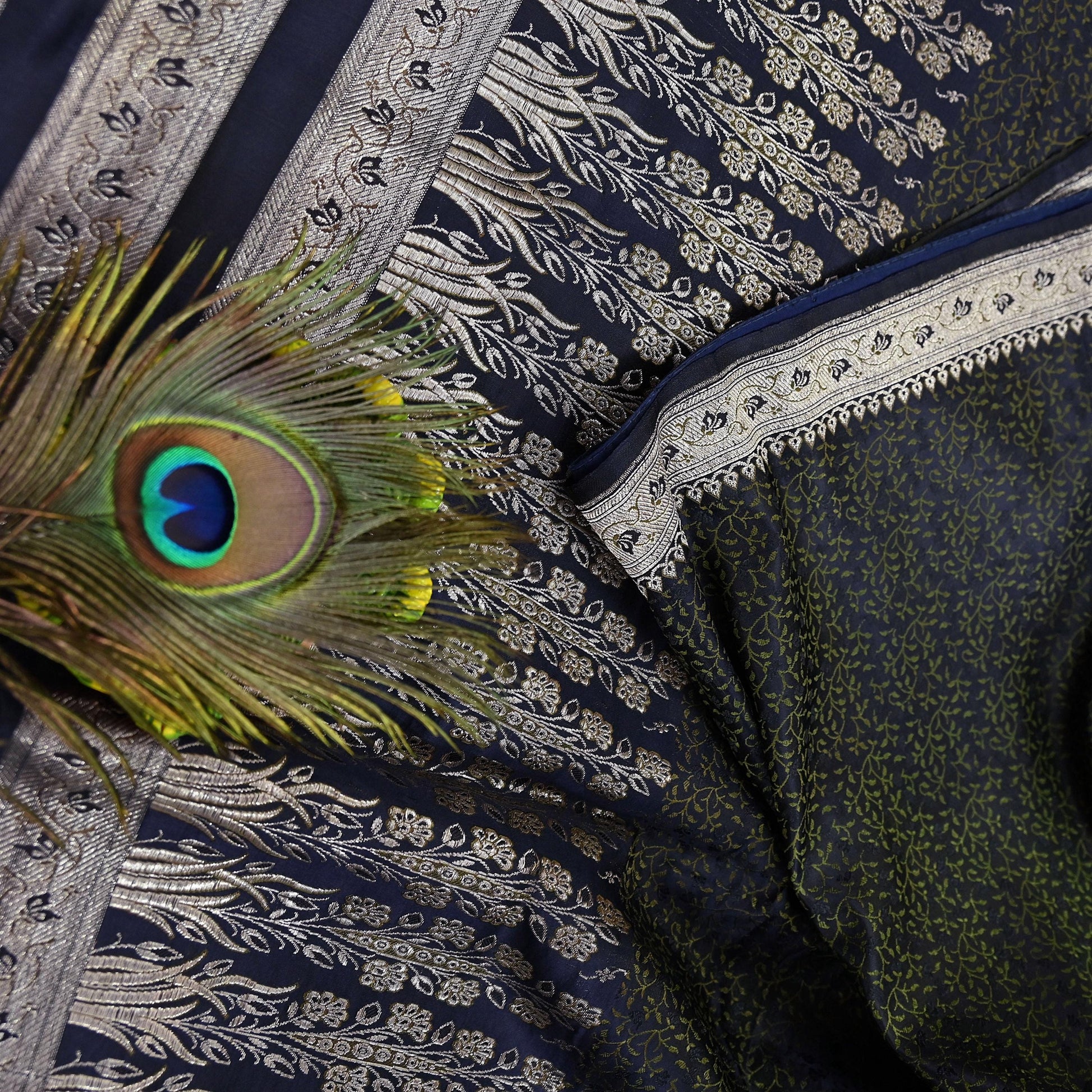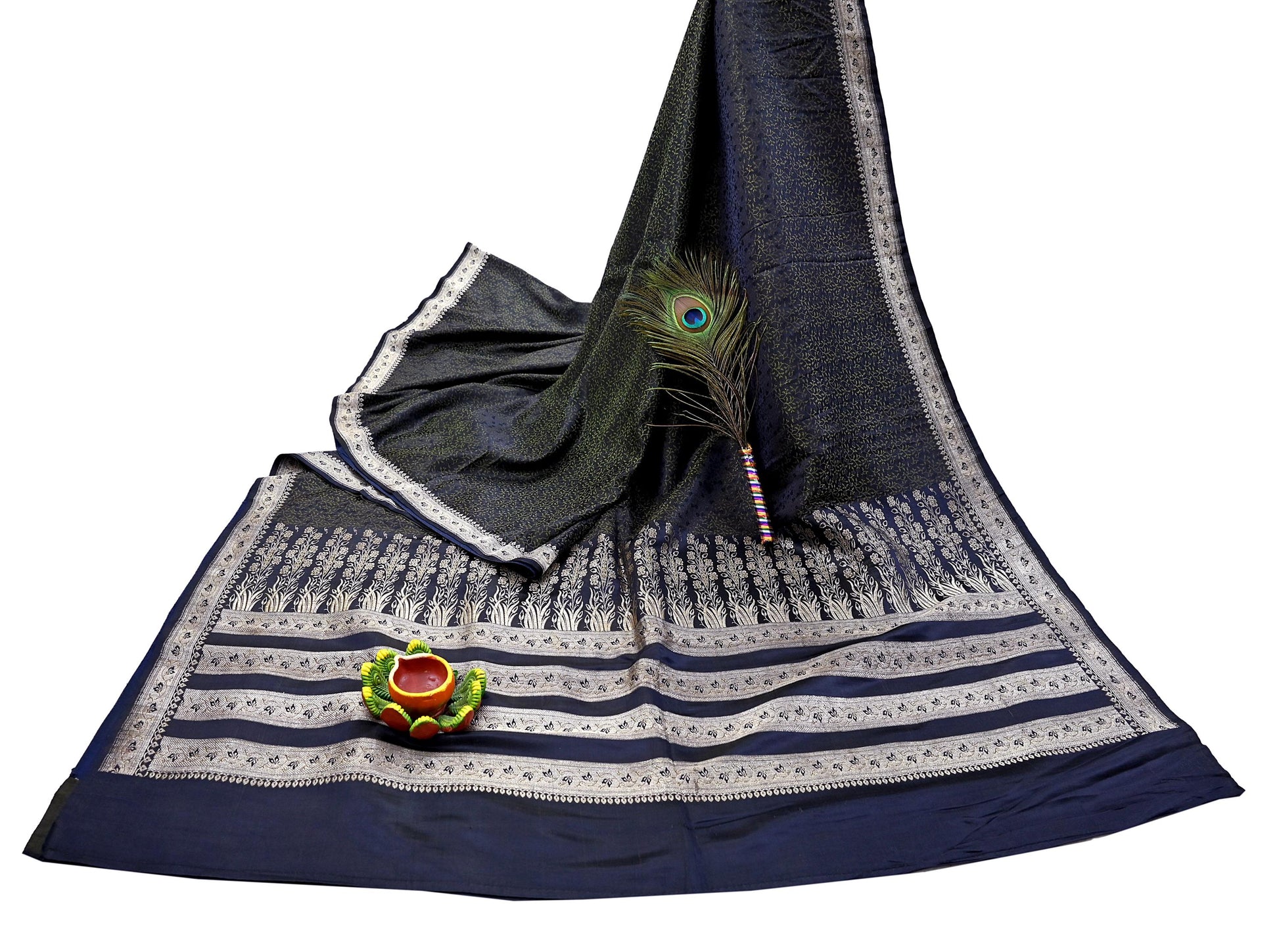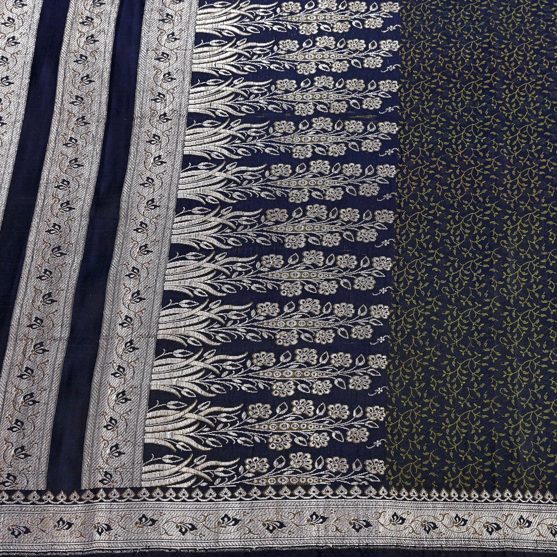 Beautiful Vintage Blue Color Color Woven Tanchoi (Banarasi Jamawar) Heavy Saree Which Is Crafted With 100% Pure Satin Silk Base Fabric The pallu & border sari features Paisley & Floral design embellished with Green, Blue Colored Woven Thread Work. Also you can see similar work with floral & Paisley pattern in center part adds to its beauty. Golden Woven zari work is giving a fabulous look to the sari. Awesome one !!!
