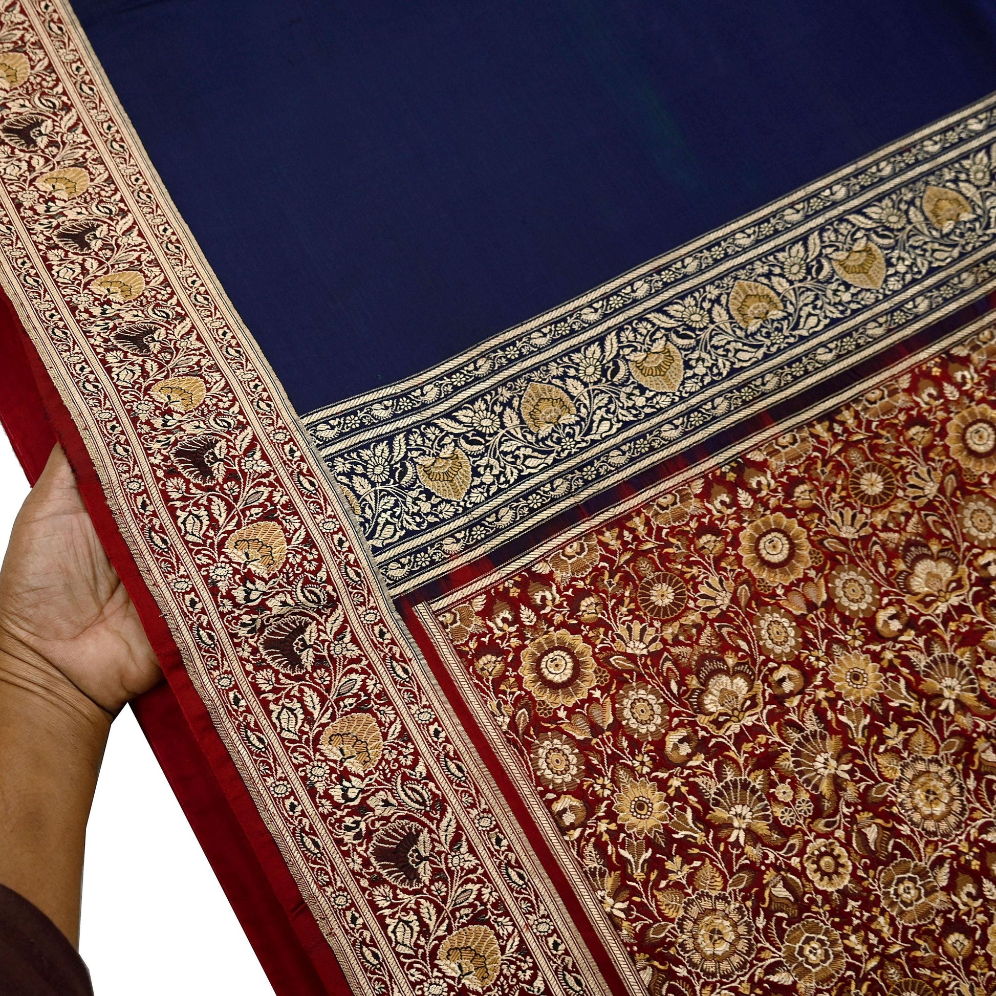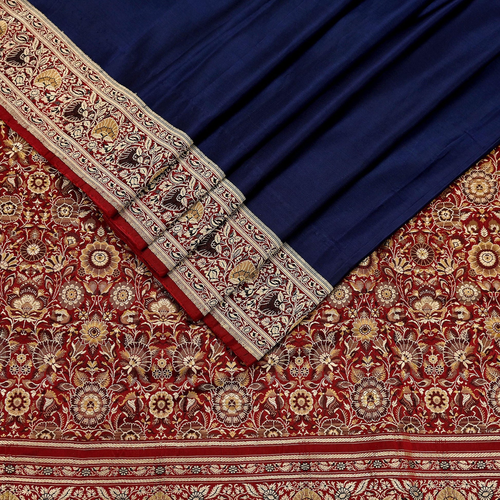 Beautiful Vintage Blue & Maroon Color Color Woven Tanchoi (Banarasi Jamawar) Heavy Saree Which Is Crafted With 100% Pure Satin Silk Base Fabric The pallu & border sari features floral design embellished with Biege, Brown, Black & Ivory Colored Woven Thread Work. Also you can see similar work with floral & Paisley pattern in center part adds to its beauty. Golden Woven zari work is giving a fabulous look to the sari. Awesome one !!!