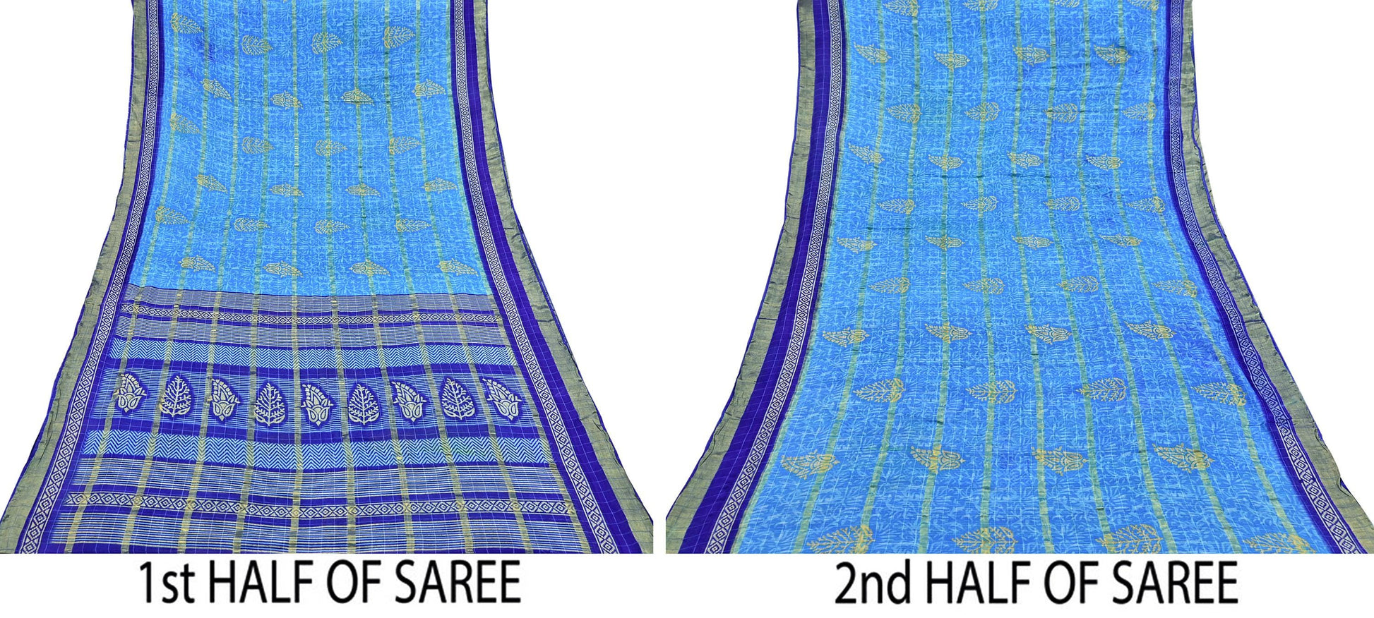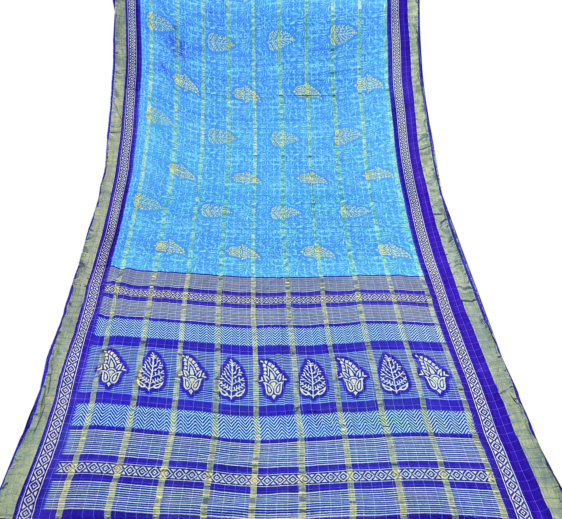 Indian Vintage Sari Blue Printed Pure Cotton Sarees Craft Fabric 5Yd Soft Sewing Sarong Wrap Boho Floral Quilting Dress making
