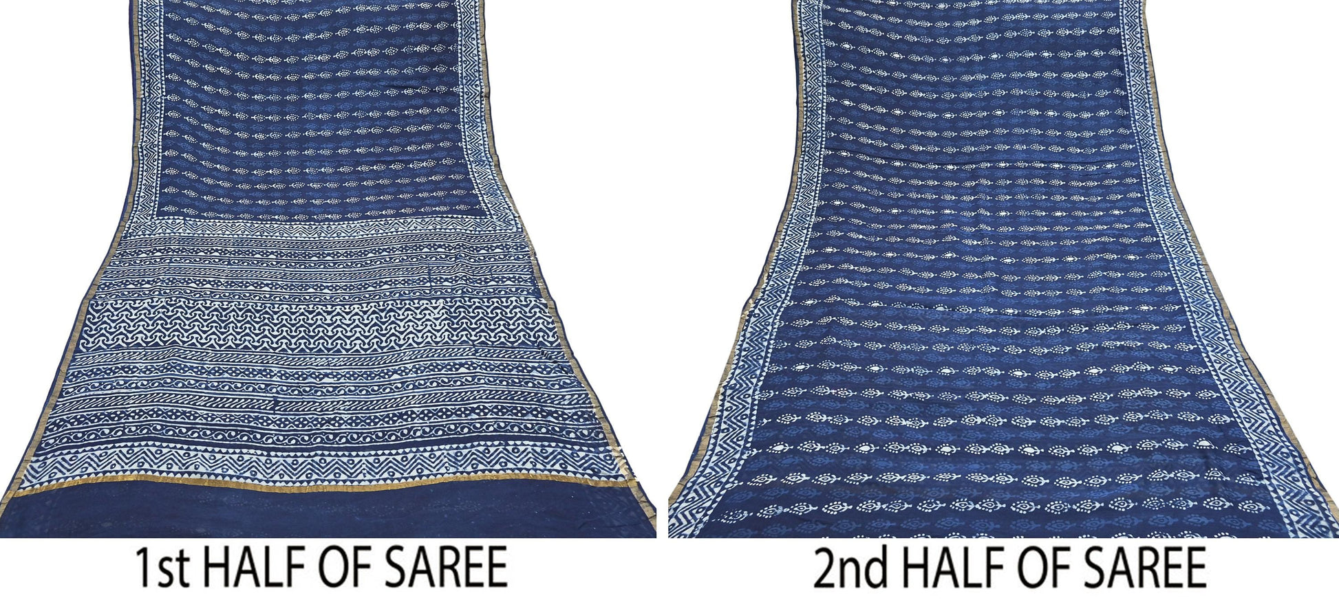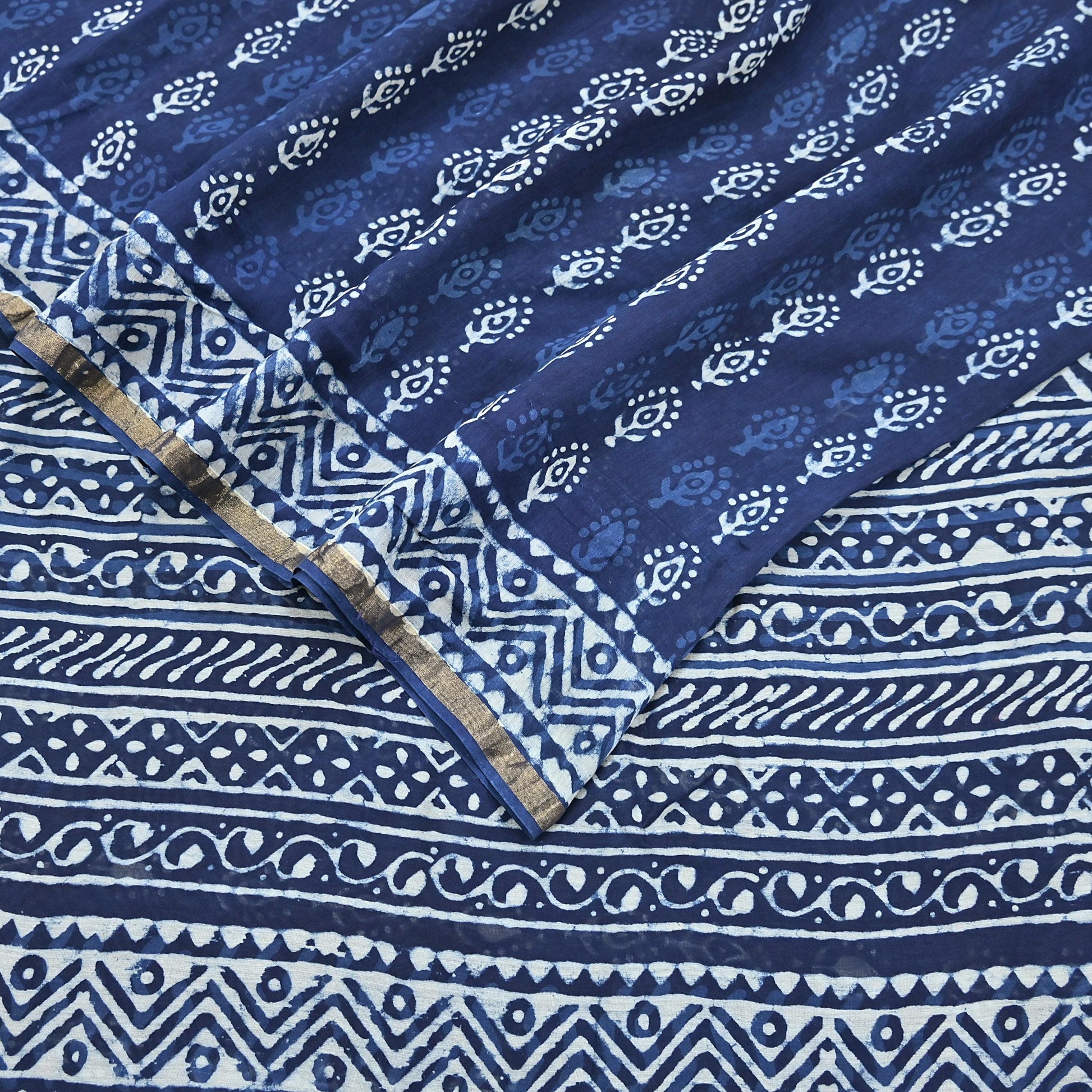 Indian Vintage Sari Blue Pure chanderi Silk Bagru Printed Sarees Fabric 5Yd Floral Soft Golden Zari Border Ethnic Dress making Upcycle