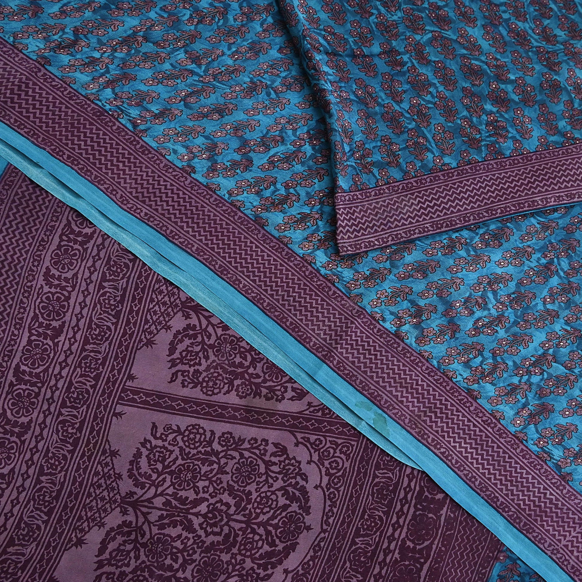 Indian Vintage Sari Blue Pure Crepe Silk Printed Saree 5yard Sewing Quilting Floral Soft Craft Fabric Wrap