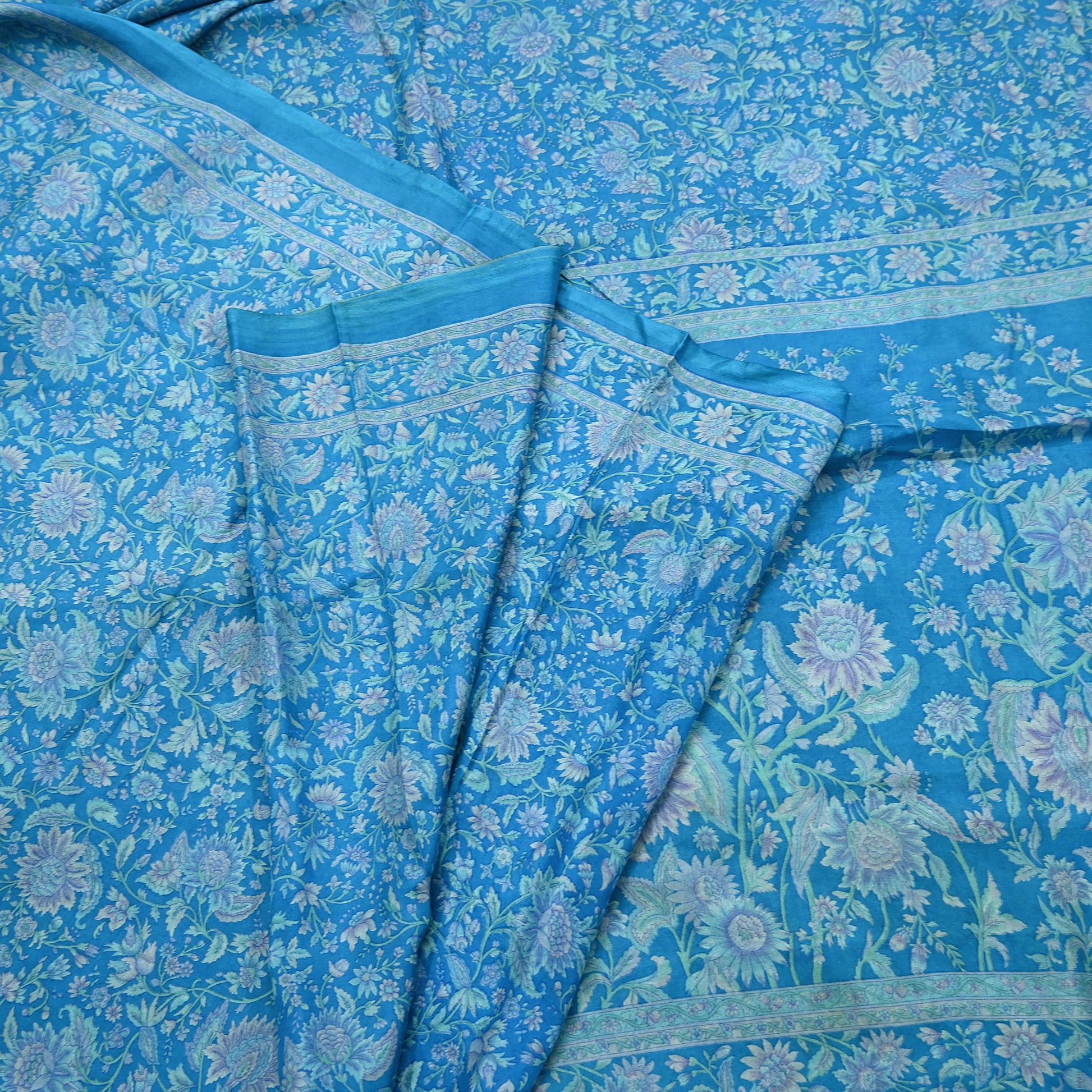 Indian Vintage Sari Blue Pure Silk Printed Saree Fabric 6yard Sewing Craft Fabric DressMaking Wrap Floral