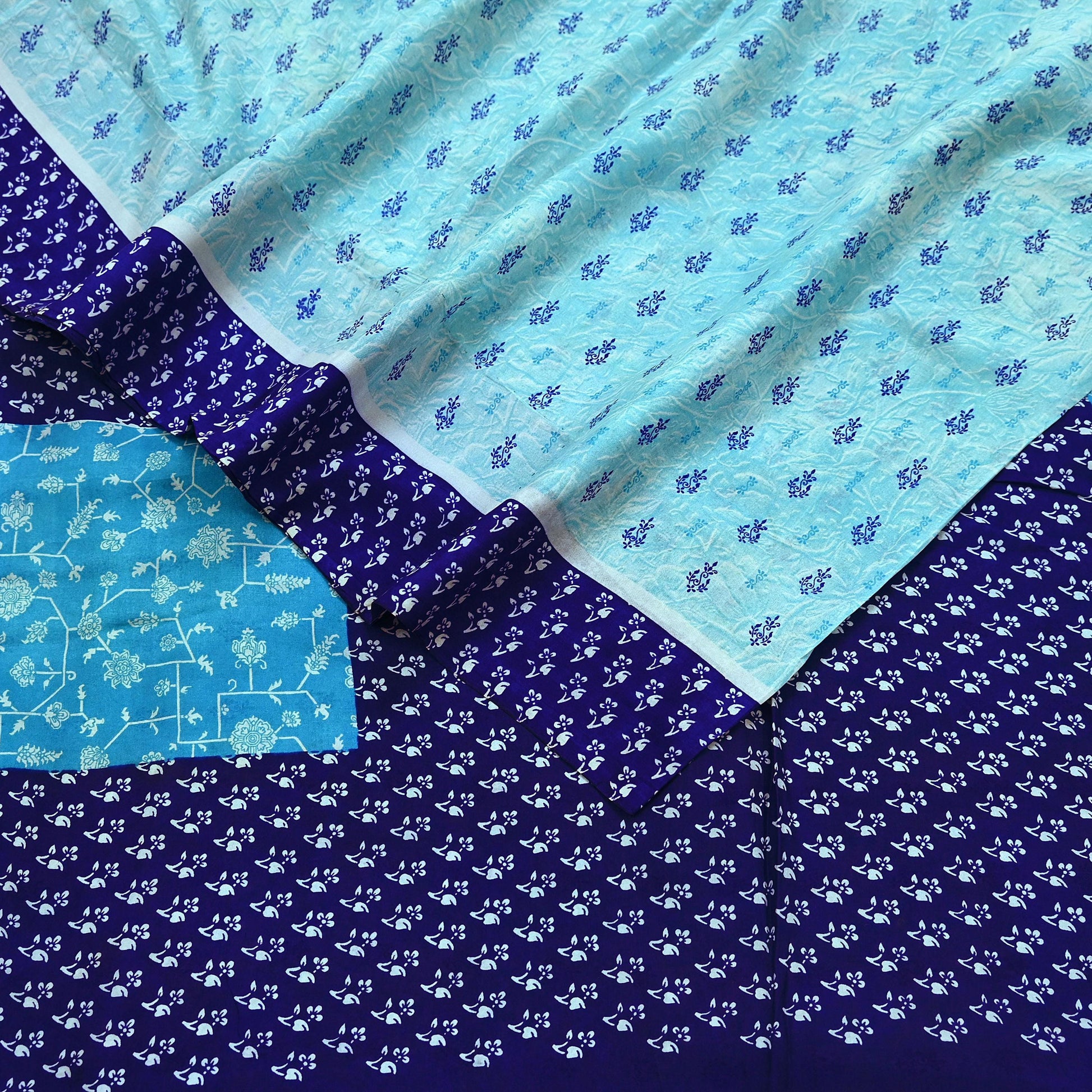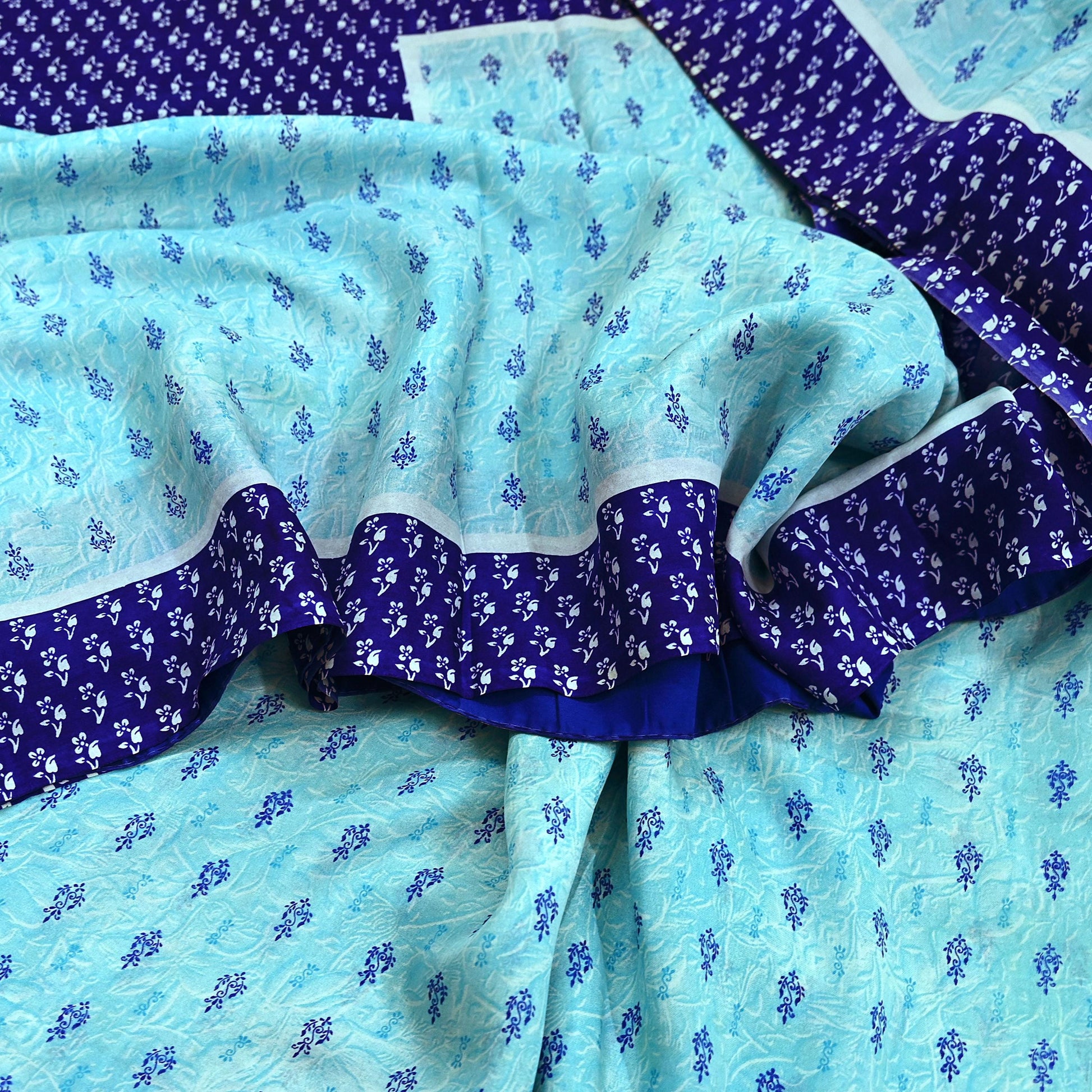 Indian Vintage Sari Blue Pure Silk Printed Sarees 6yd Sewing Craft Fabric Soft Dress Making Wrap Floral Upcycle Quilting Crafting