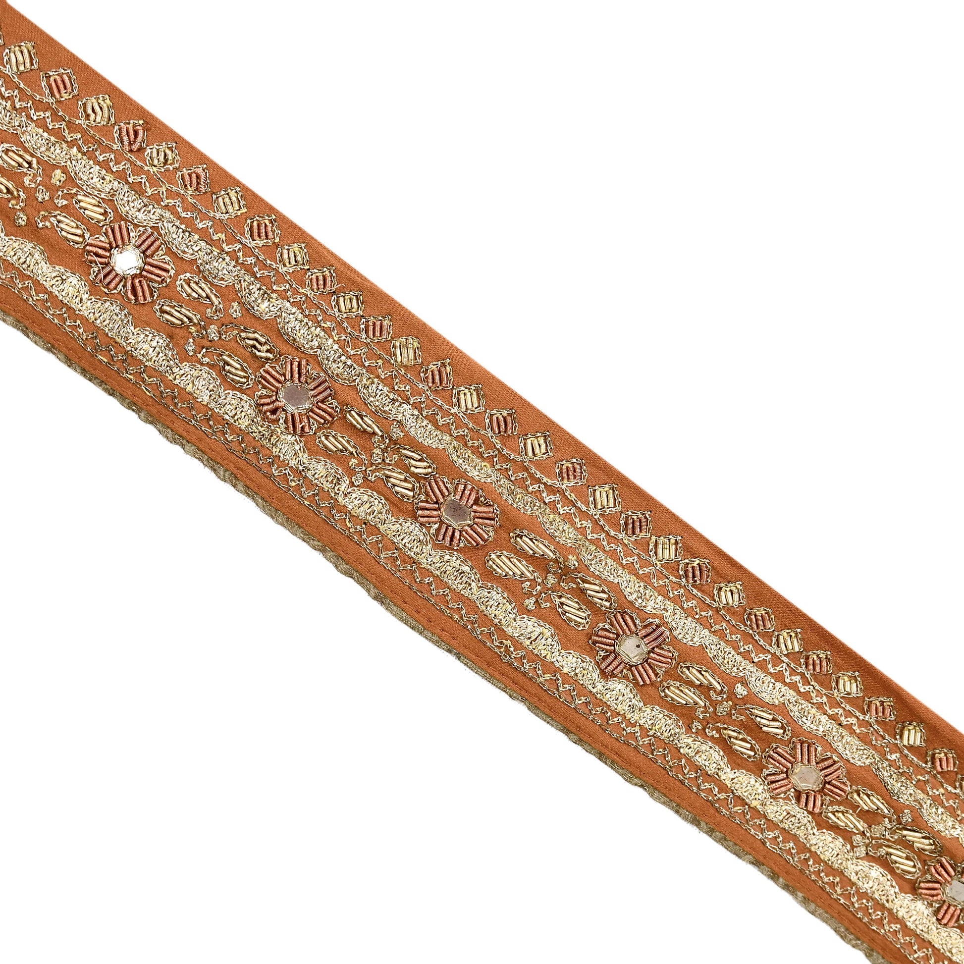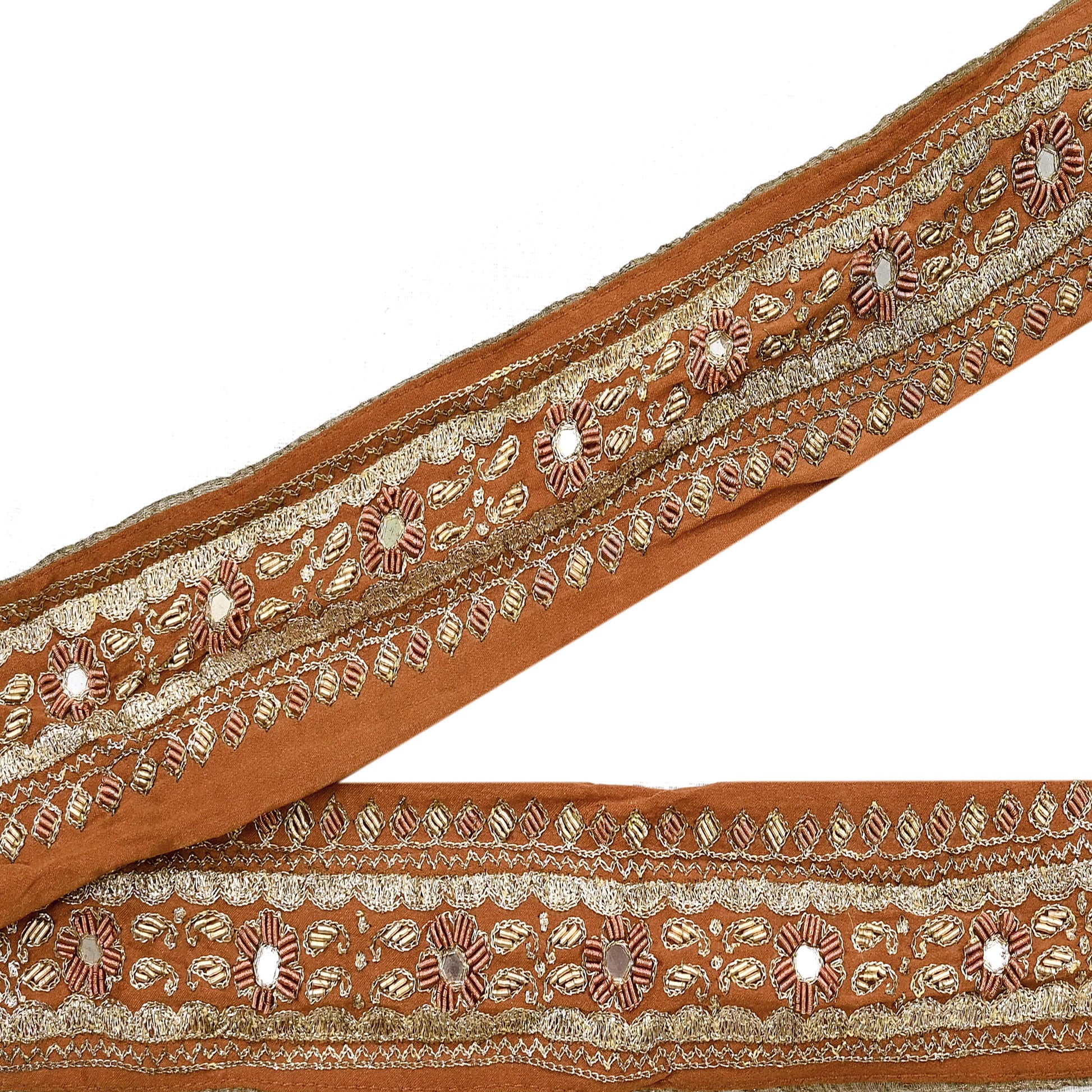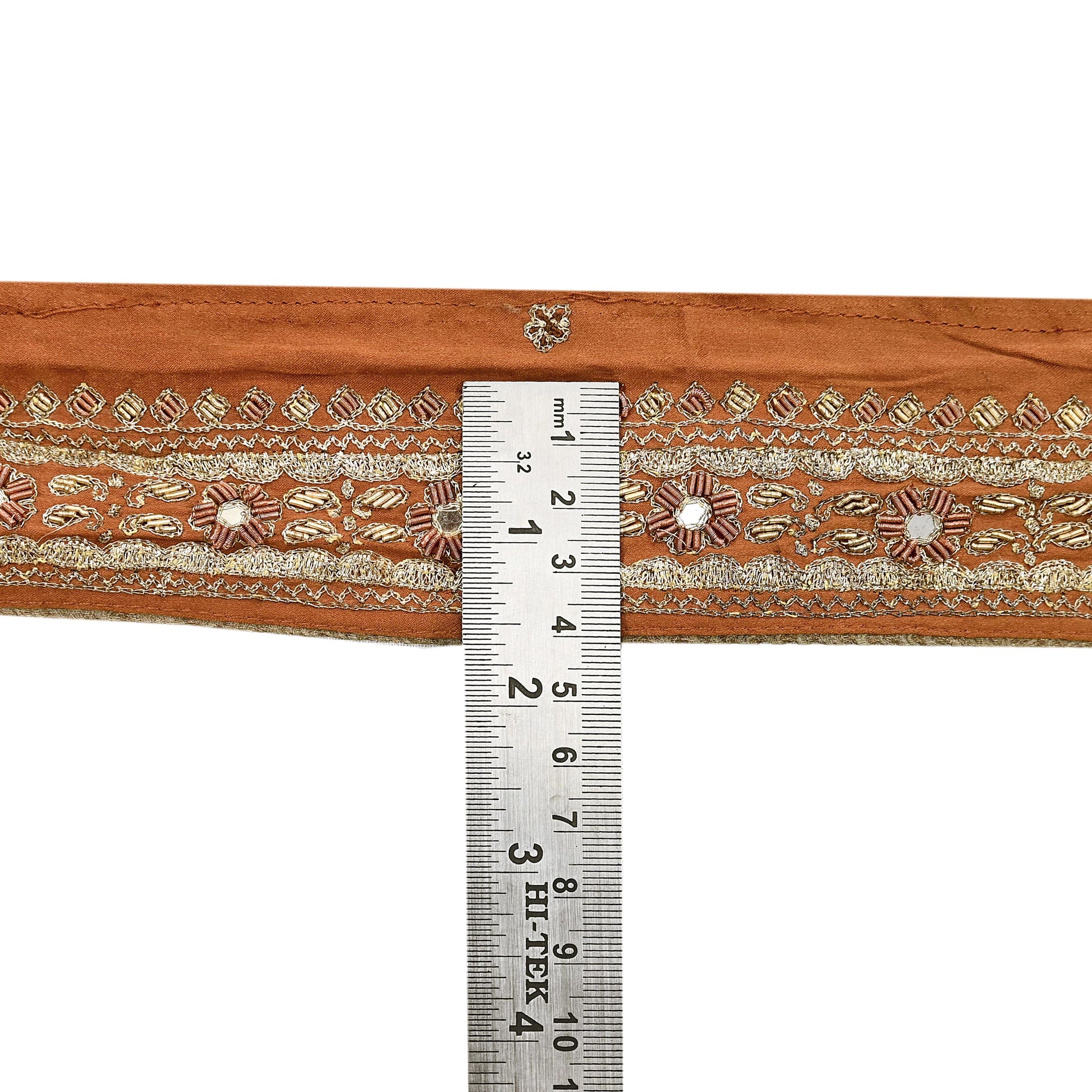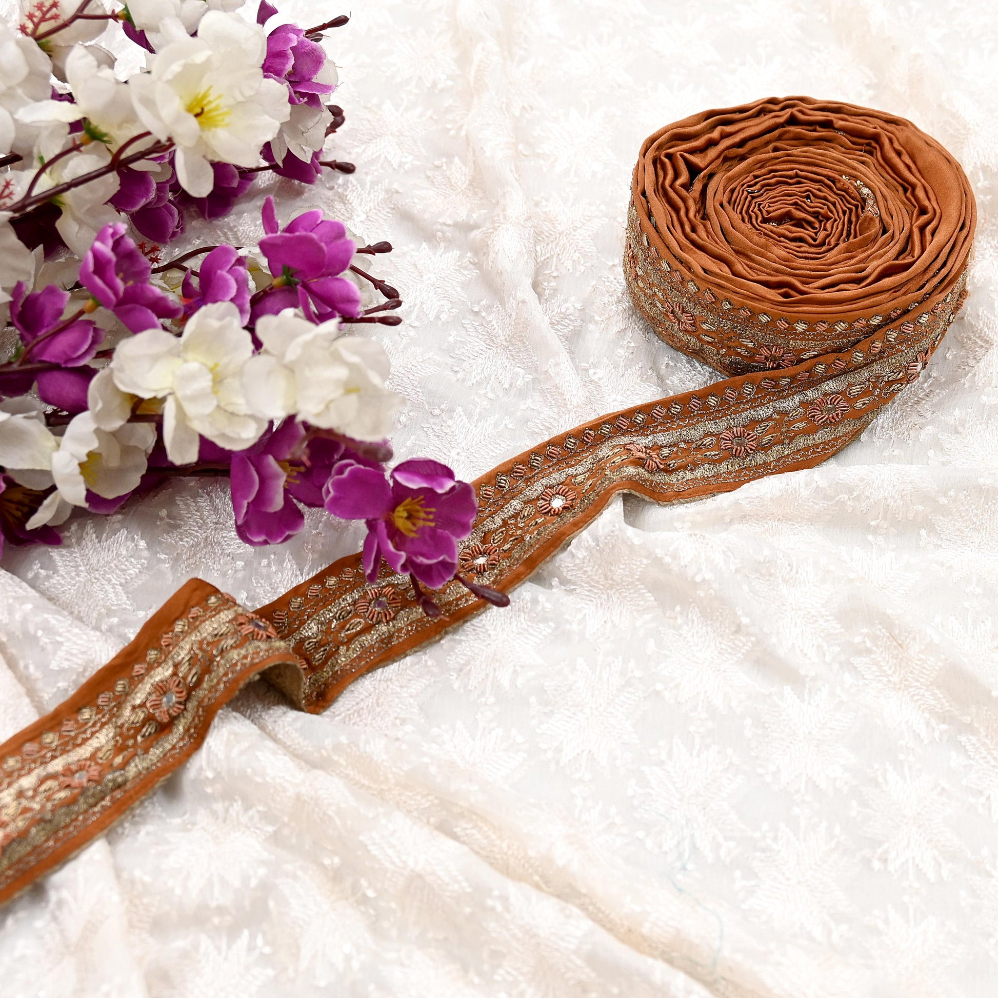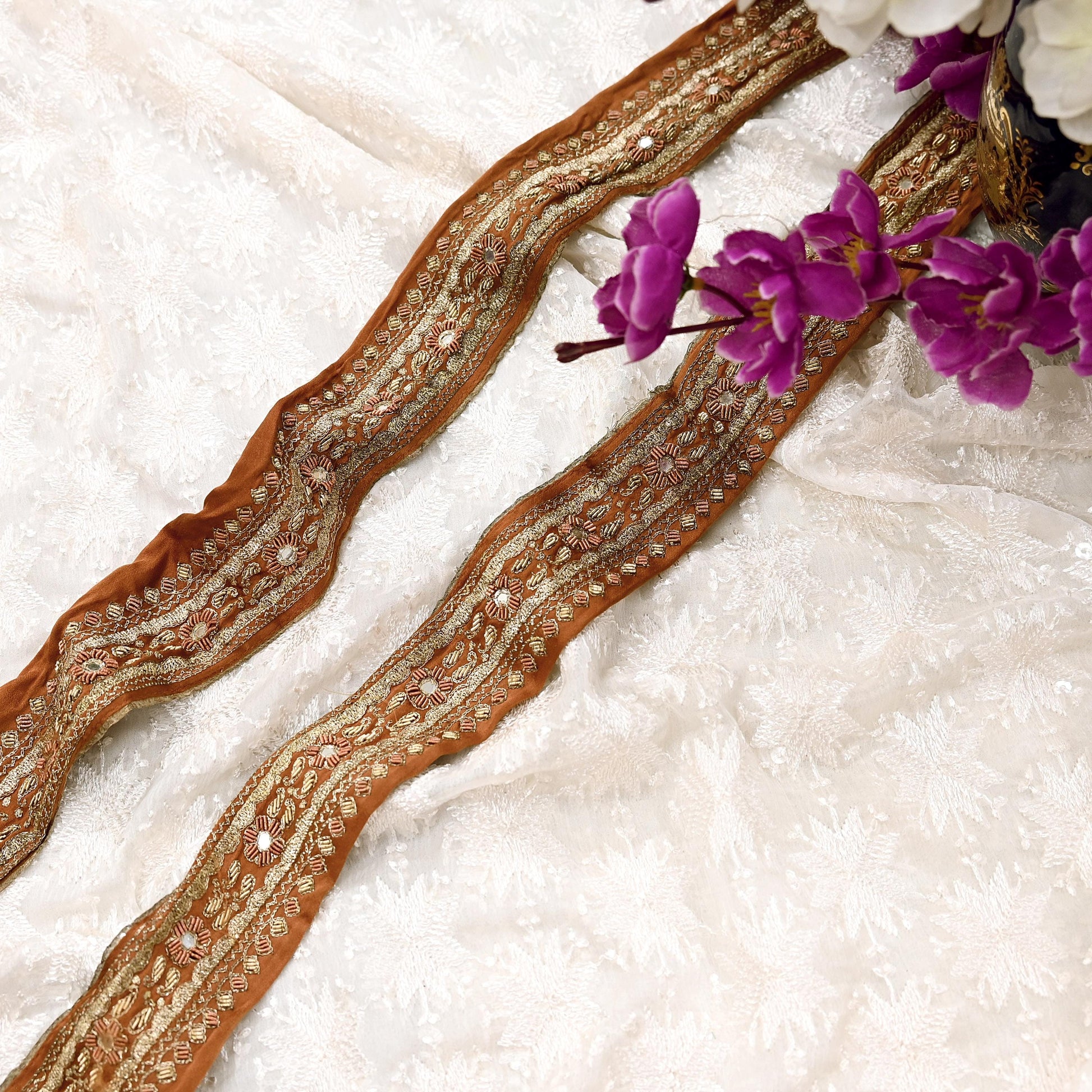 *Graceful Pure Satin silk Hand Embroidered Sari Border In Rusty orange Color Highlighting Golden Zardozi/Dabka Zari Work.