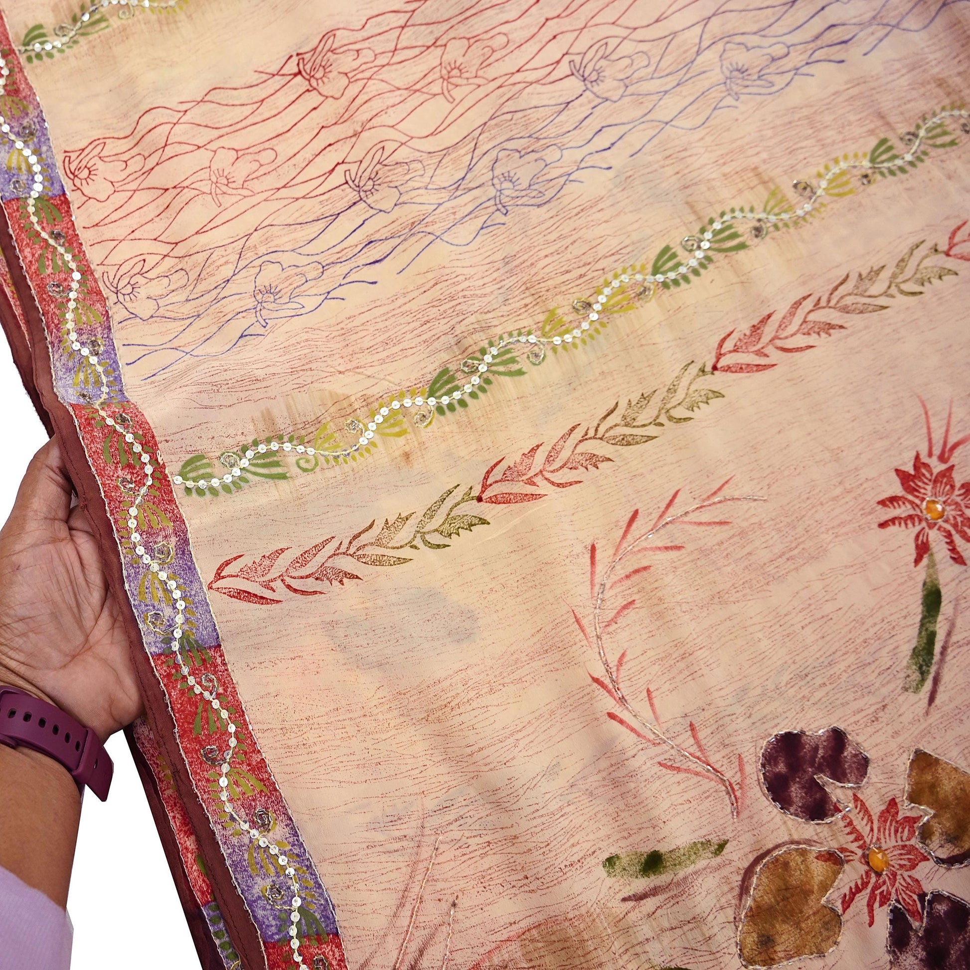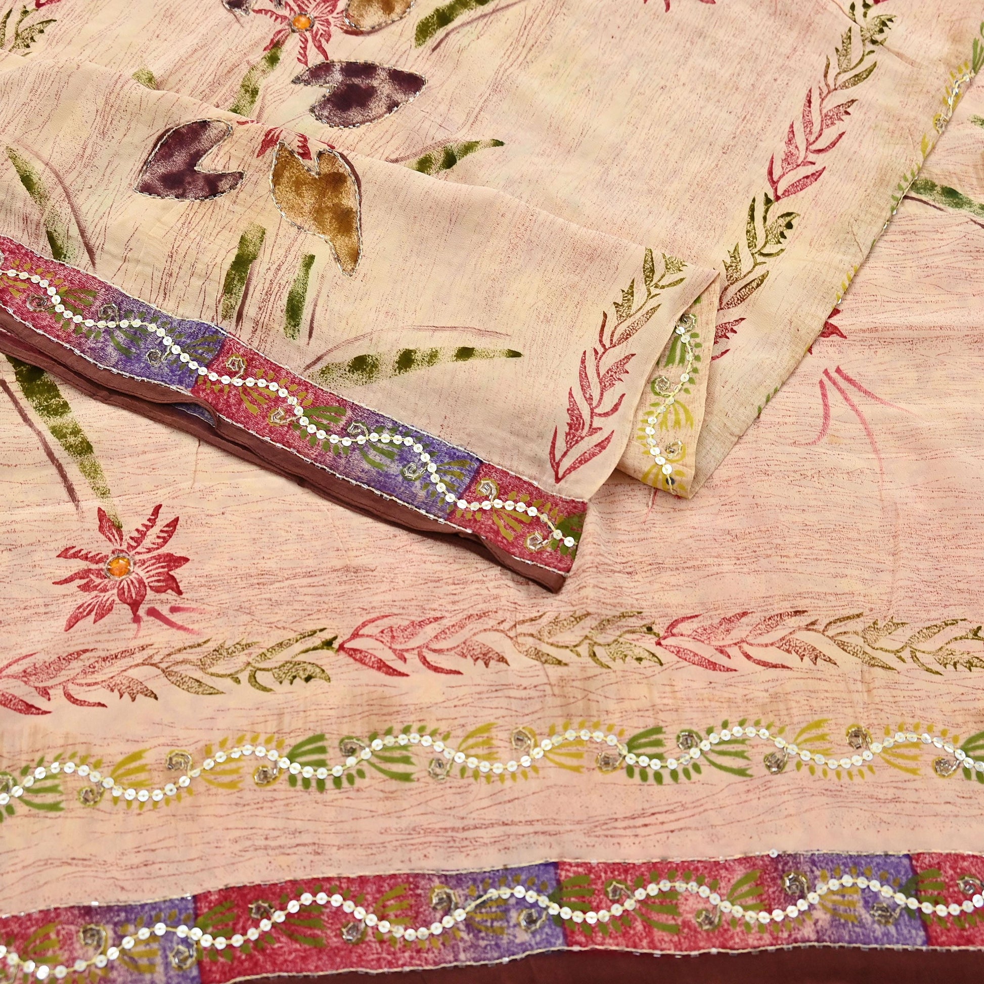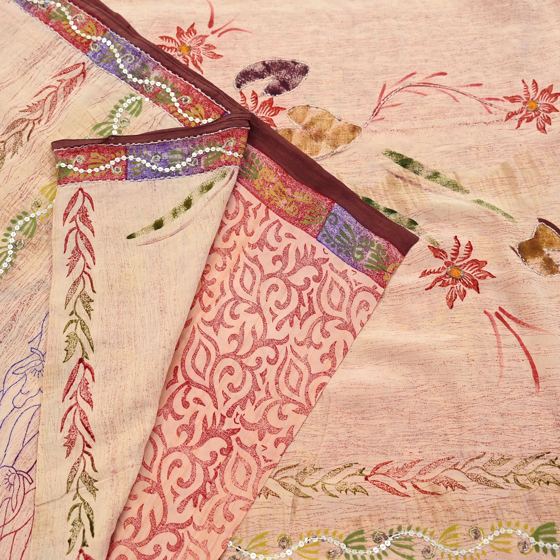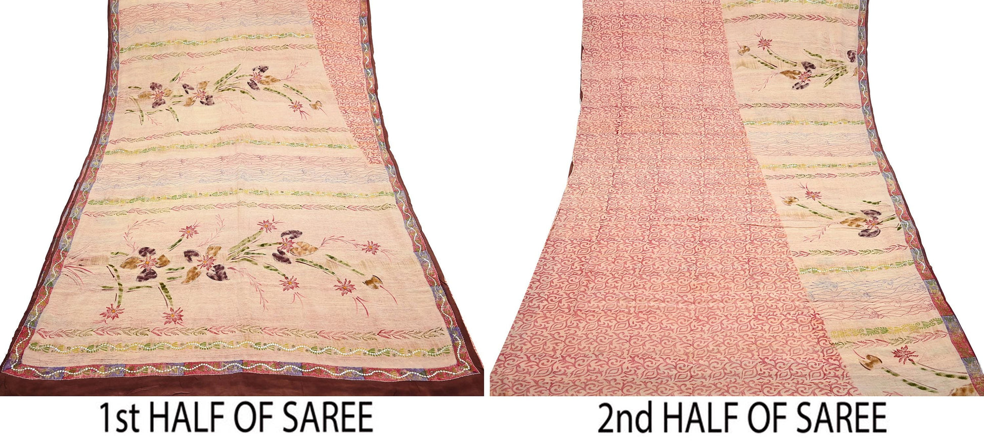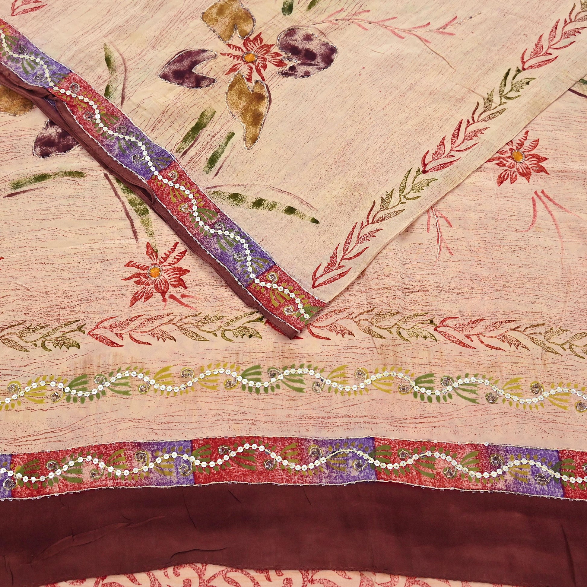 Indian Vintage Sari Brown & Beige Pure Crepe Silk Hand Embroidered Saree 5yd Sewing Floral Craft Sequins Dress making Crafting Quilting
