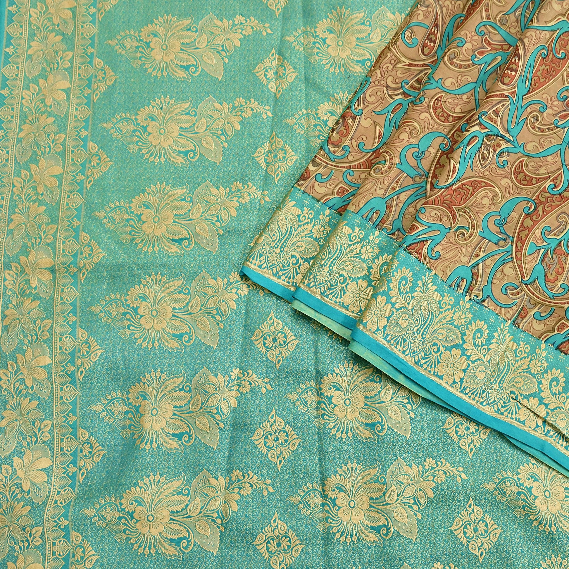Vibrant Brown & Green Colored Printed Pure Silk Saree.
