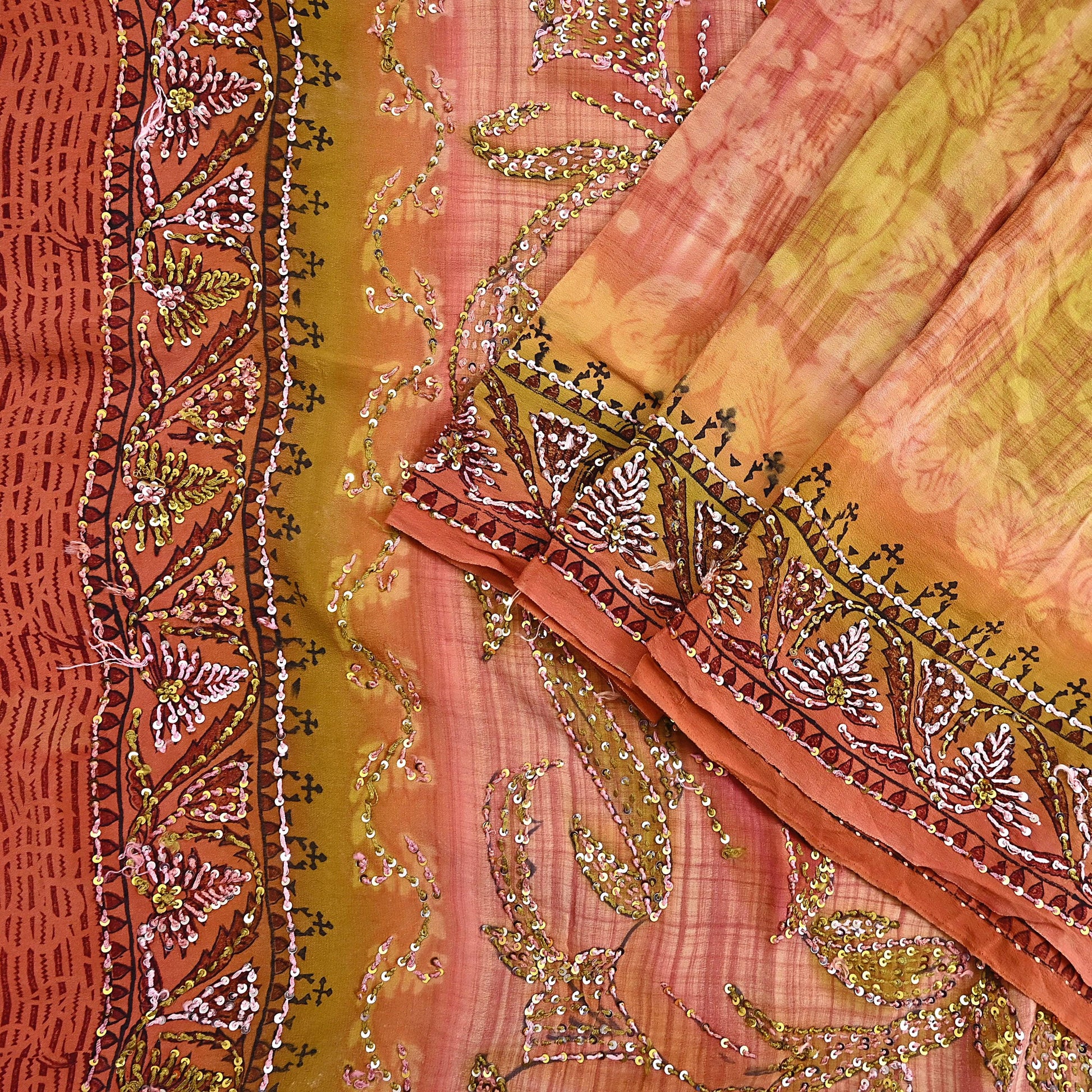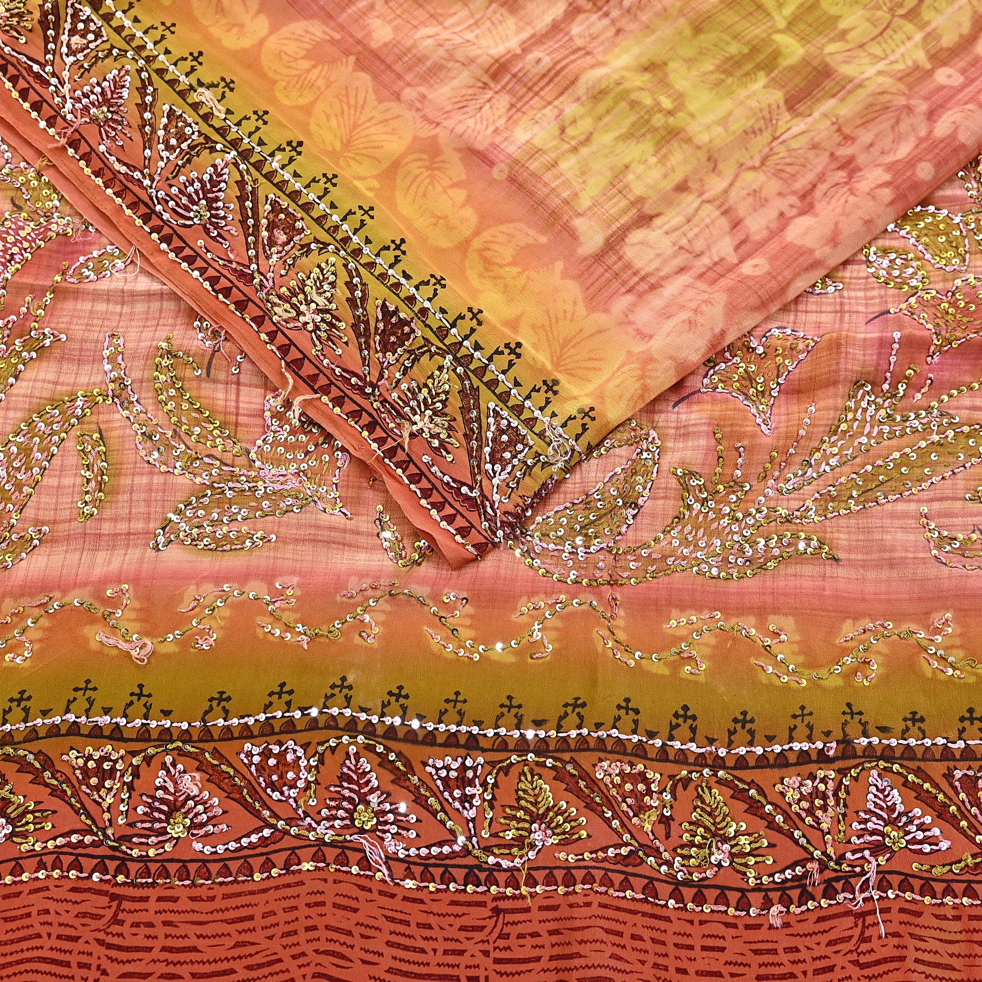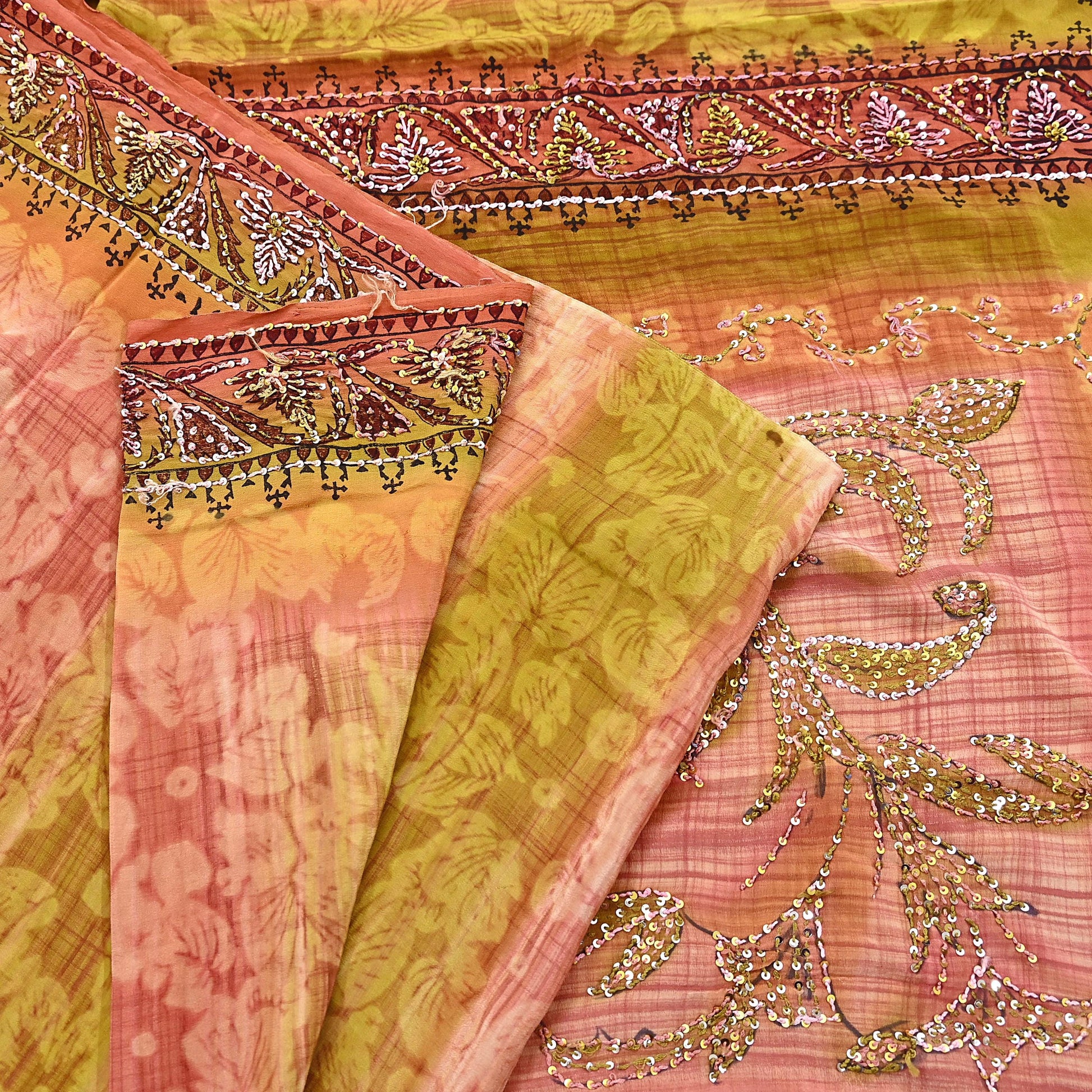 Indian Vintage Sari Brown & Green Pure Crepe Silk Hand Embroidered Saree 5yd Sewing Floral Craft Sequins Dress making Crafting Quilting