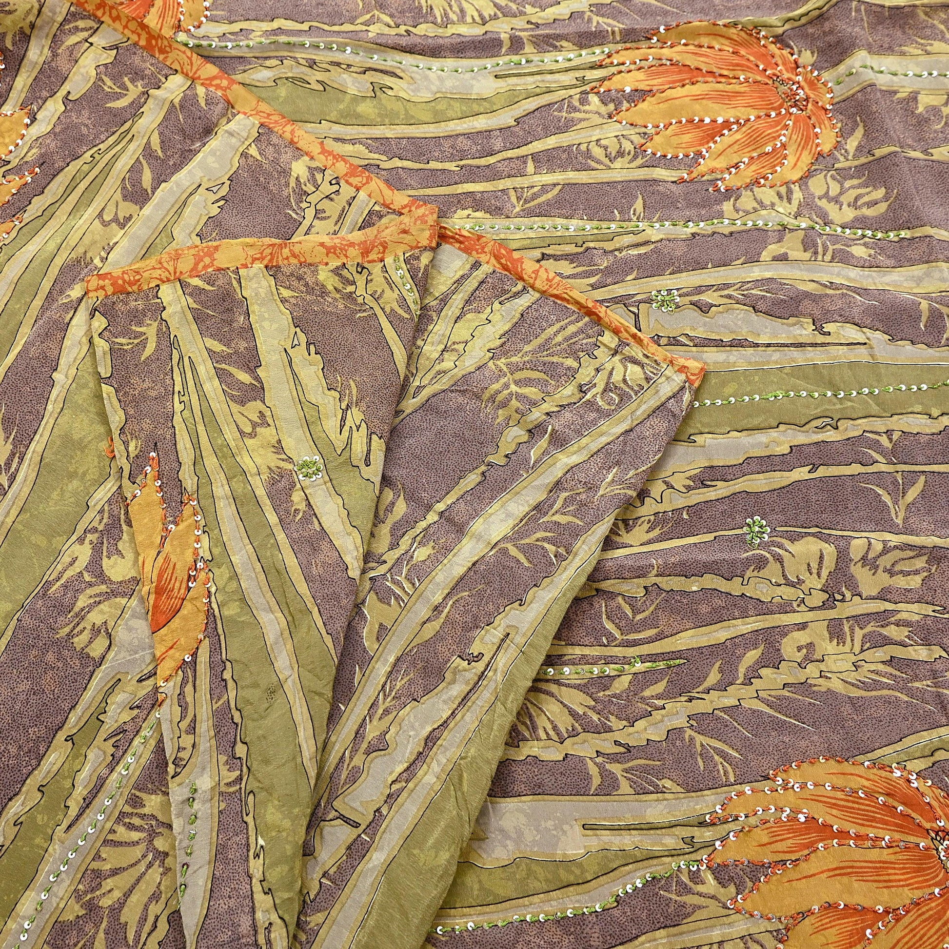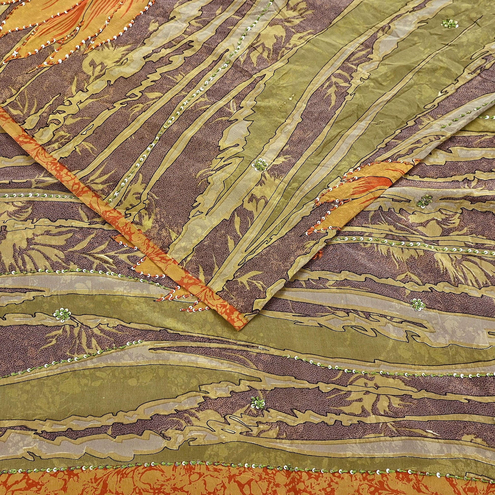 Indian Vintage Sari Brown & Green Pure Crepe Silk Hand Embroidered Saree 5yd Sewing Floral Craft Sequins Dress making Crafting Quilting