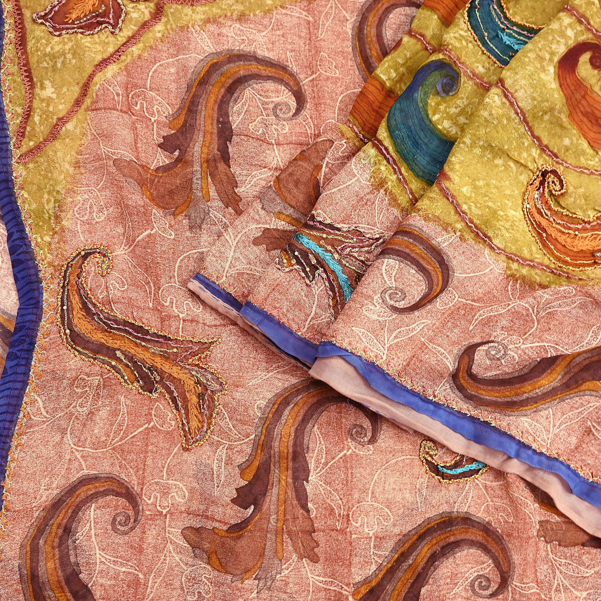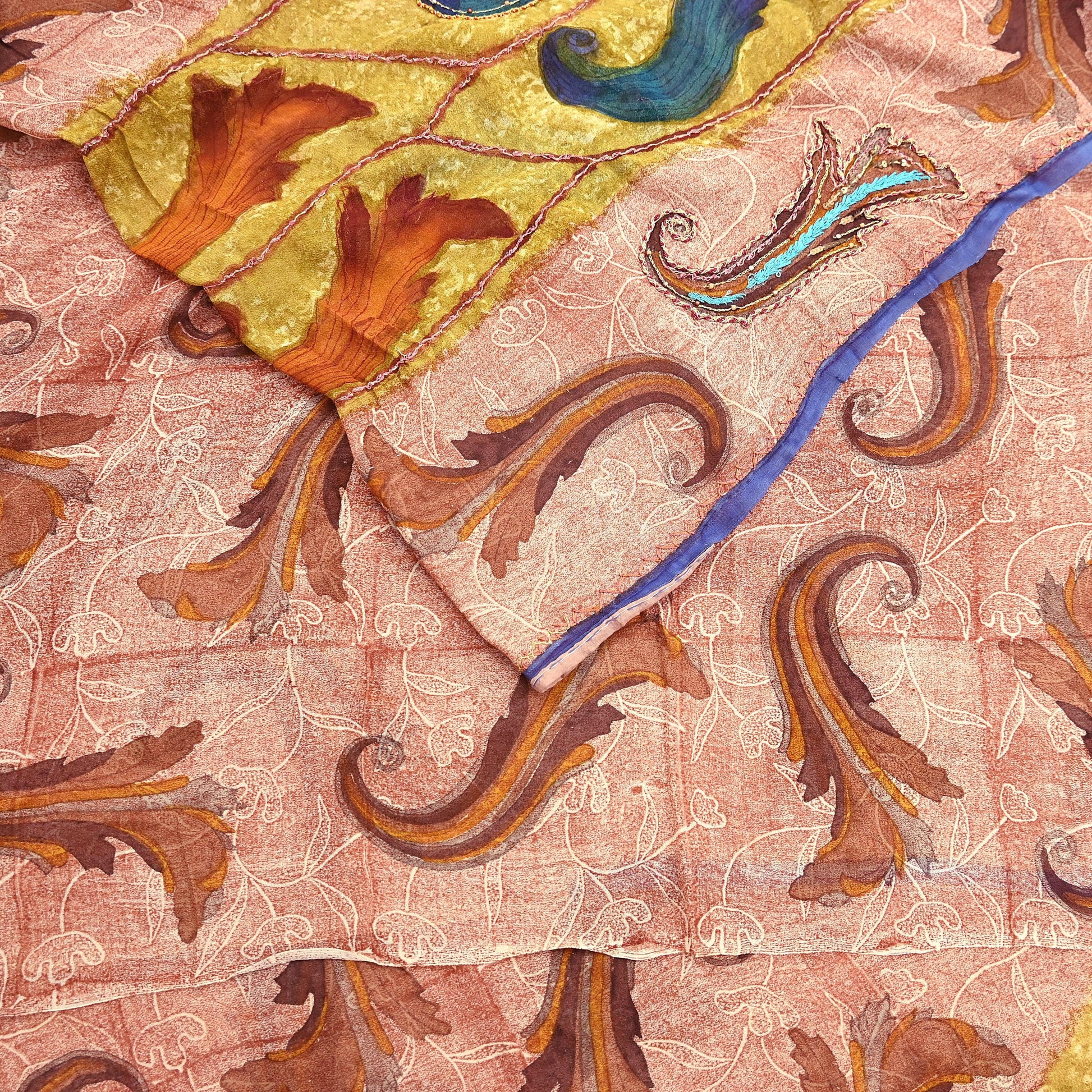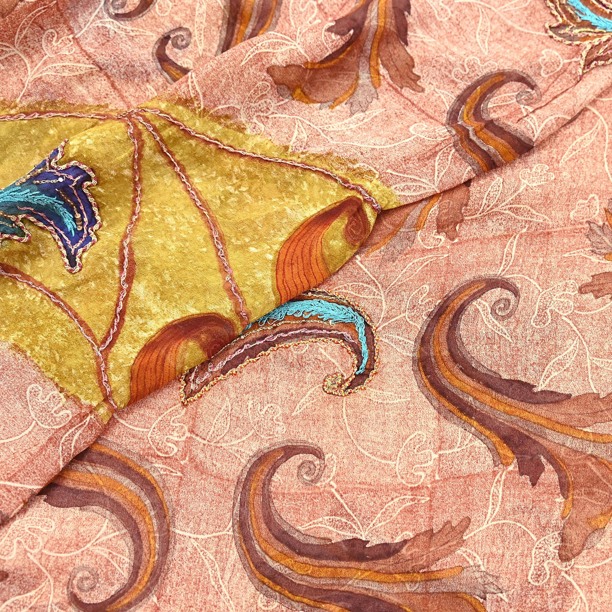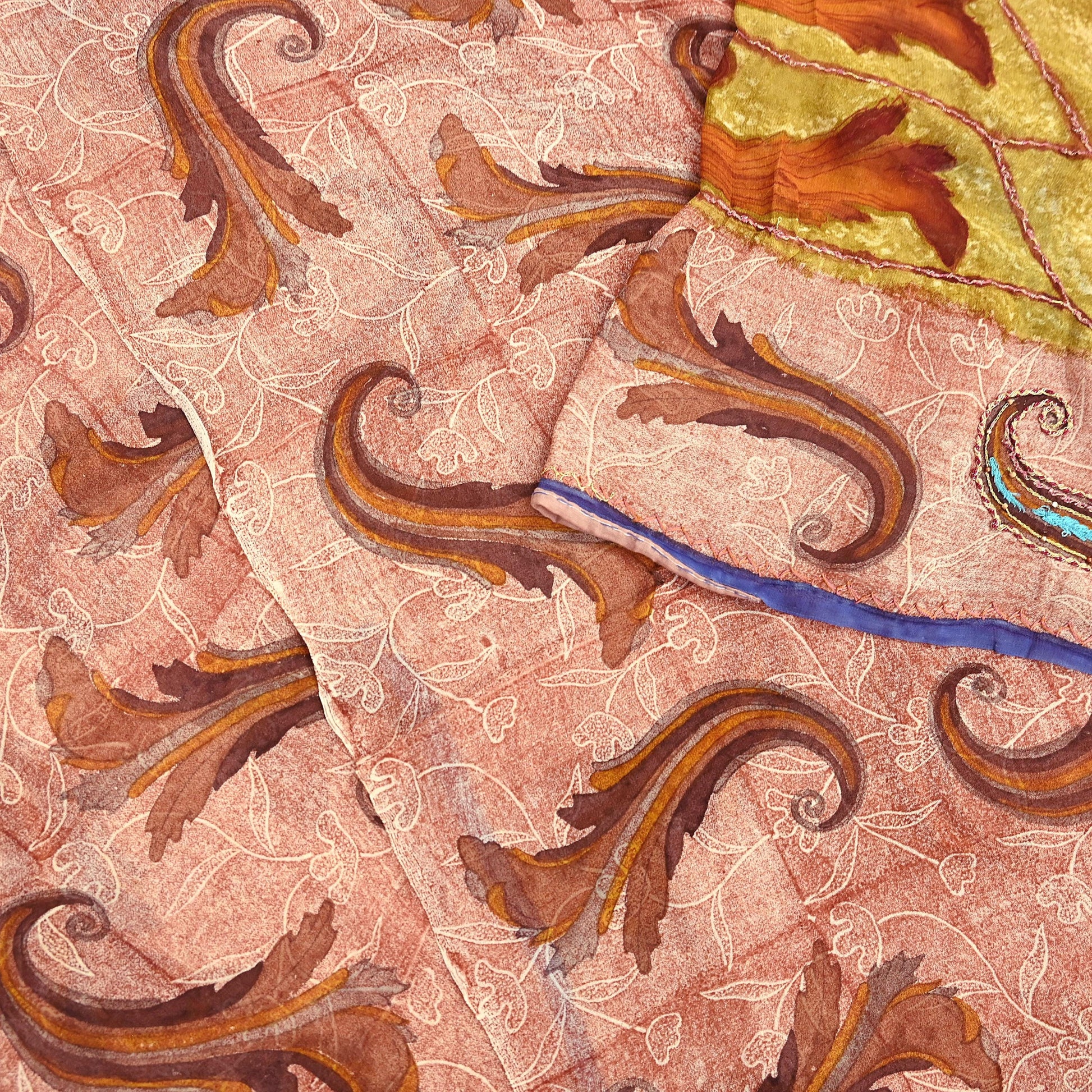 Indian Vintage Sari Brown & Ivory Hand Embroidered Printed Pure Georgette Silk Sari Saree Fabric 5Yd Zari Dressmaking Crafting Upcycle