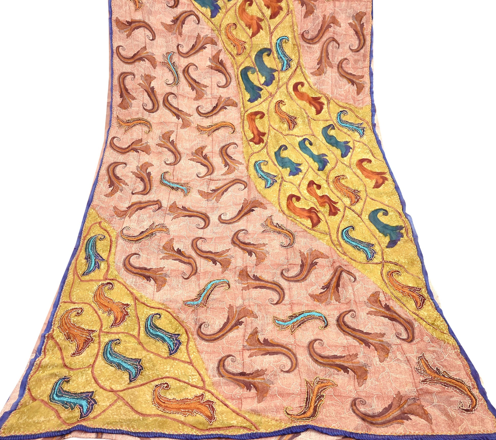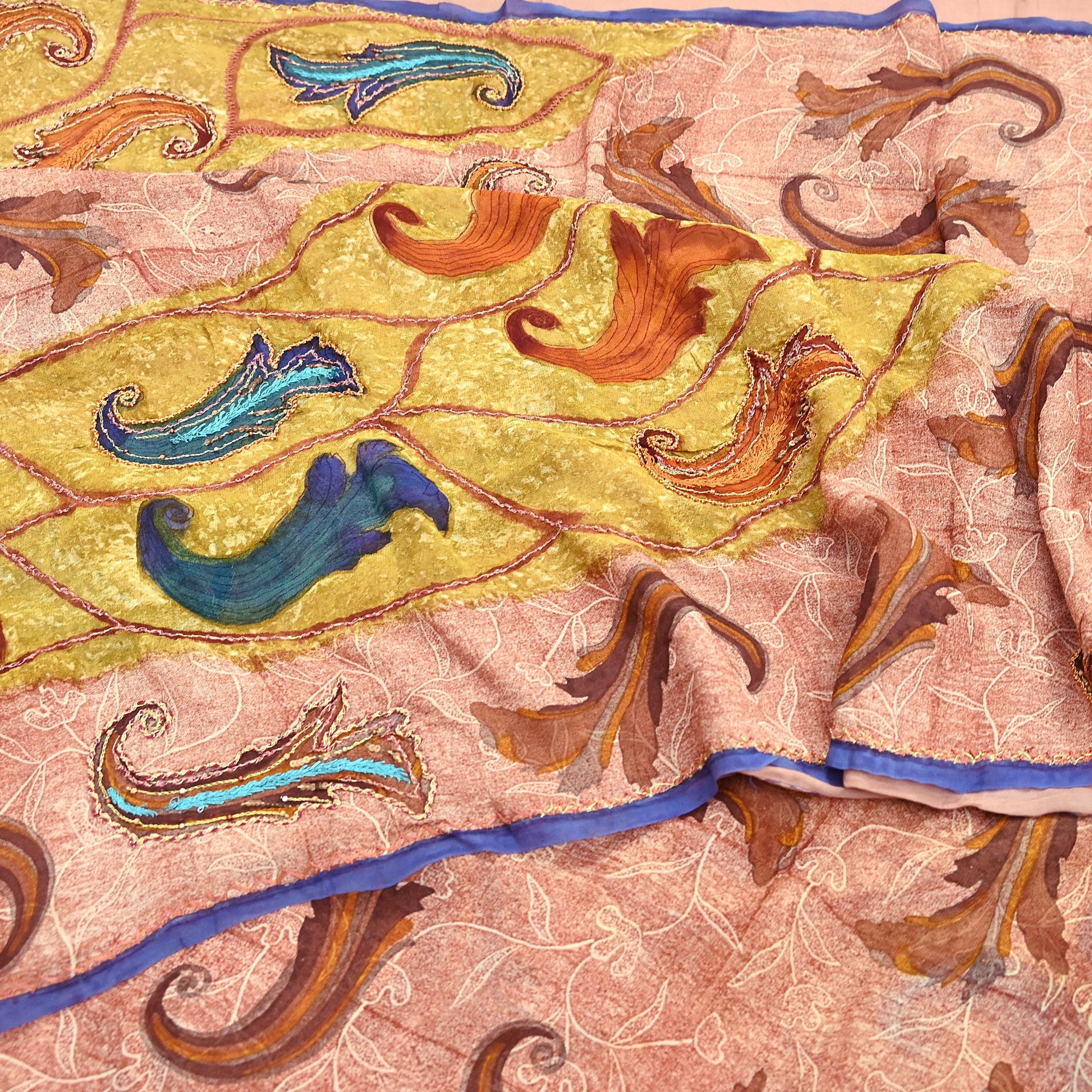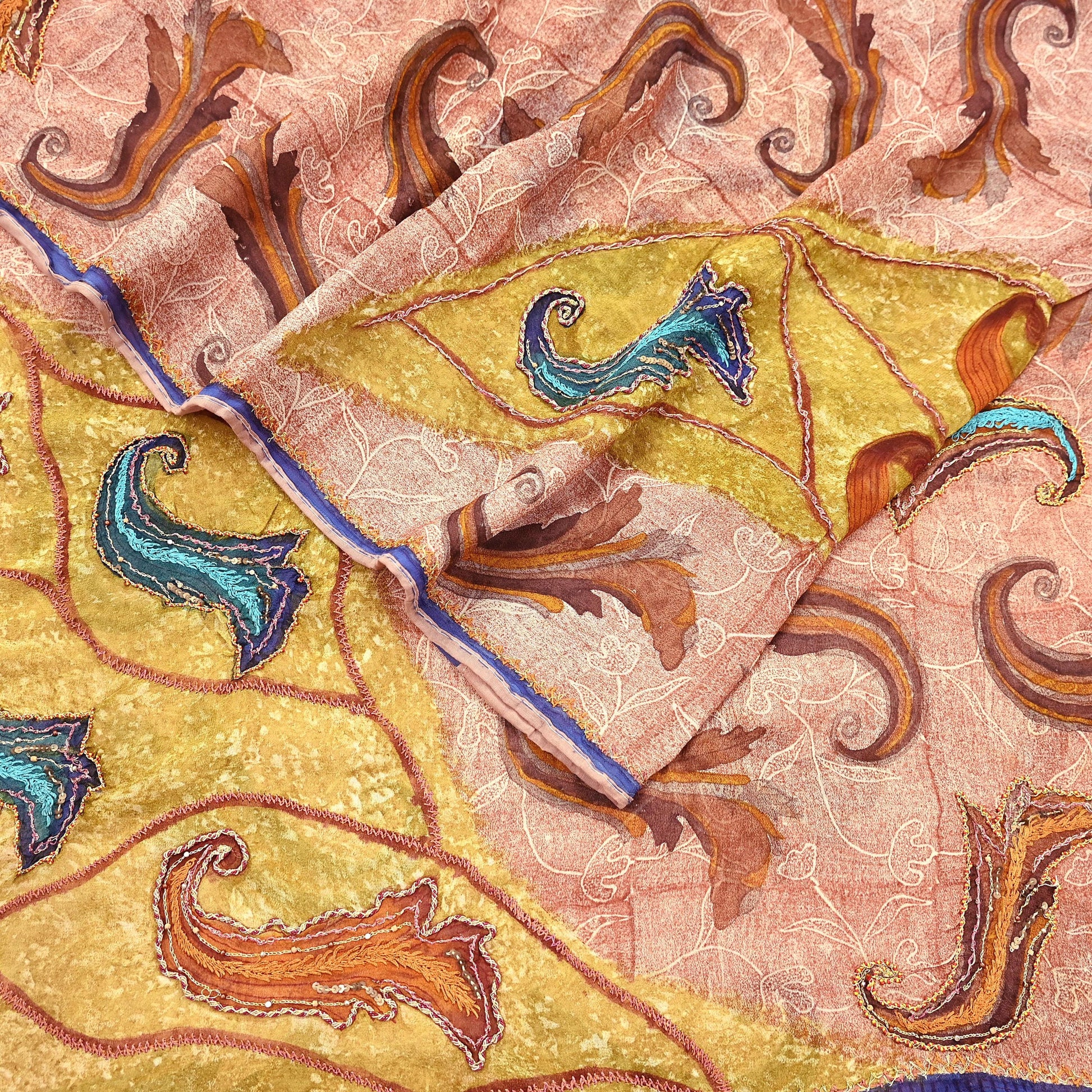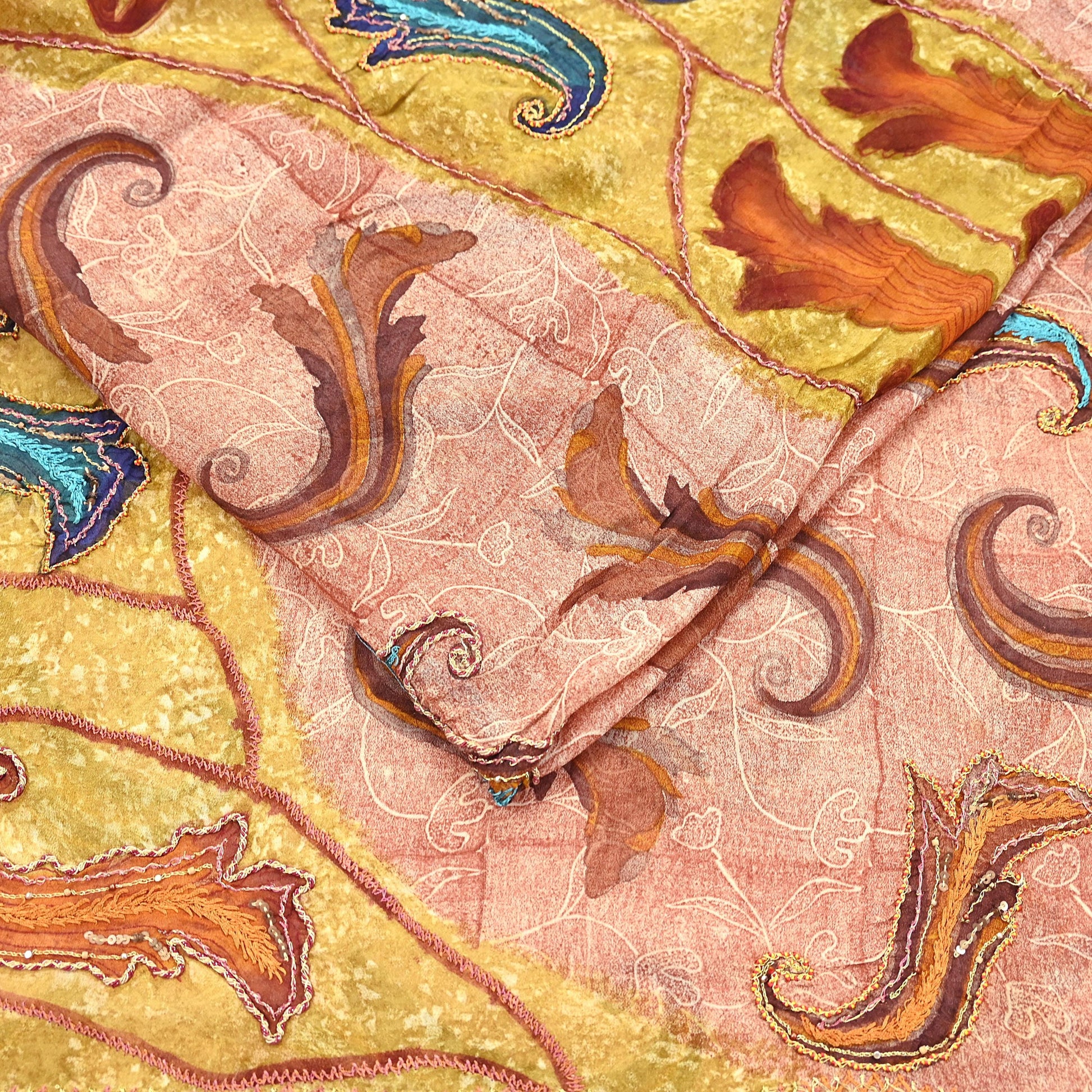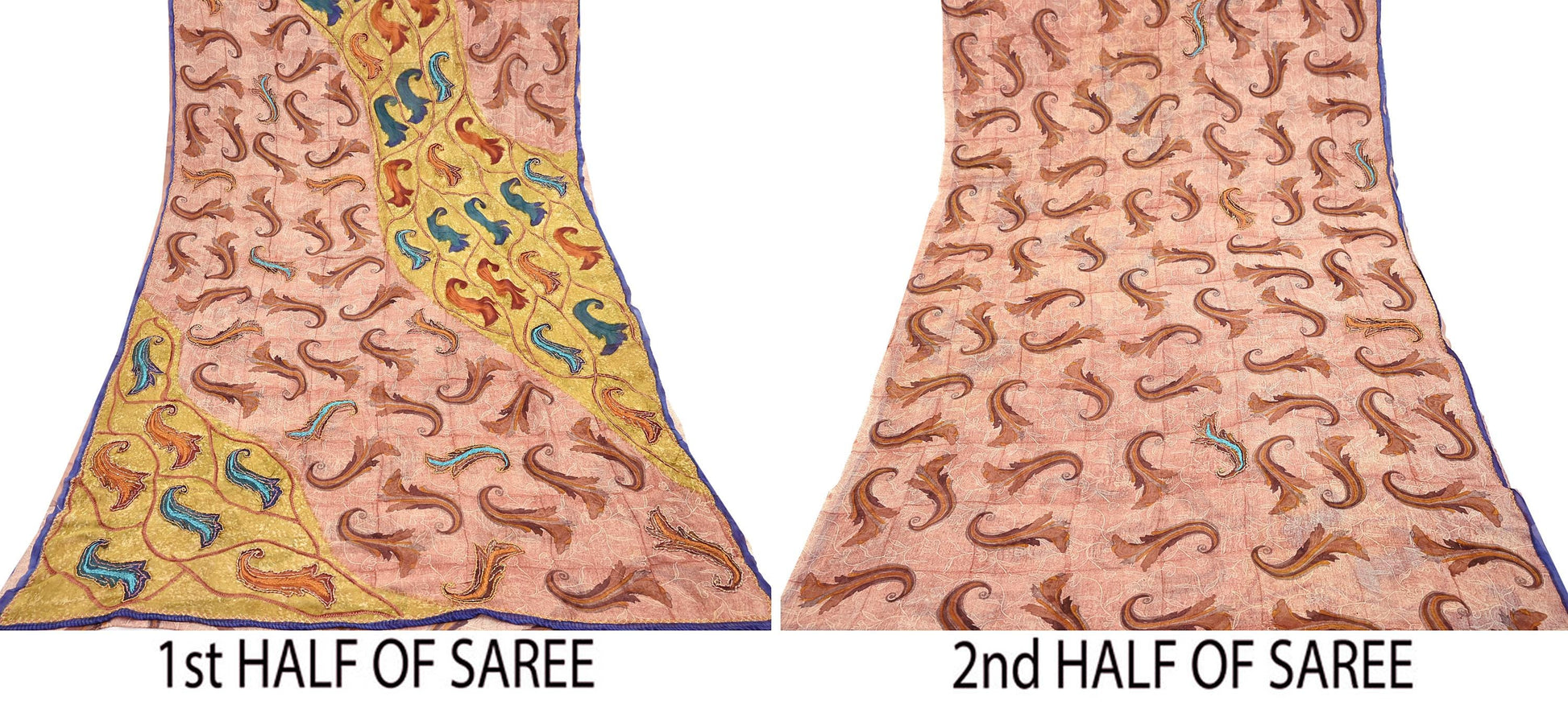 Indian Vintage Sari Brown & Ivory Hand Embroidered Printed Pure Georgette Silk Sari Saree Fabric 5Yd Zari Dressmaking Crafting Upcycle