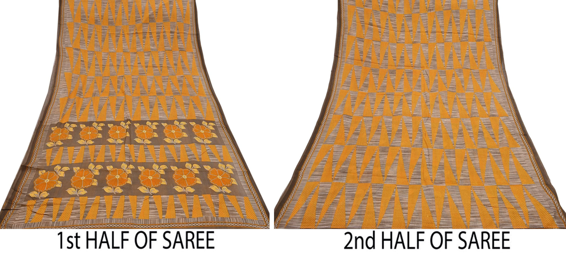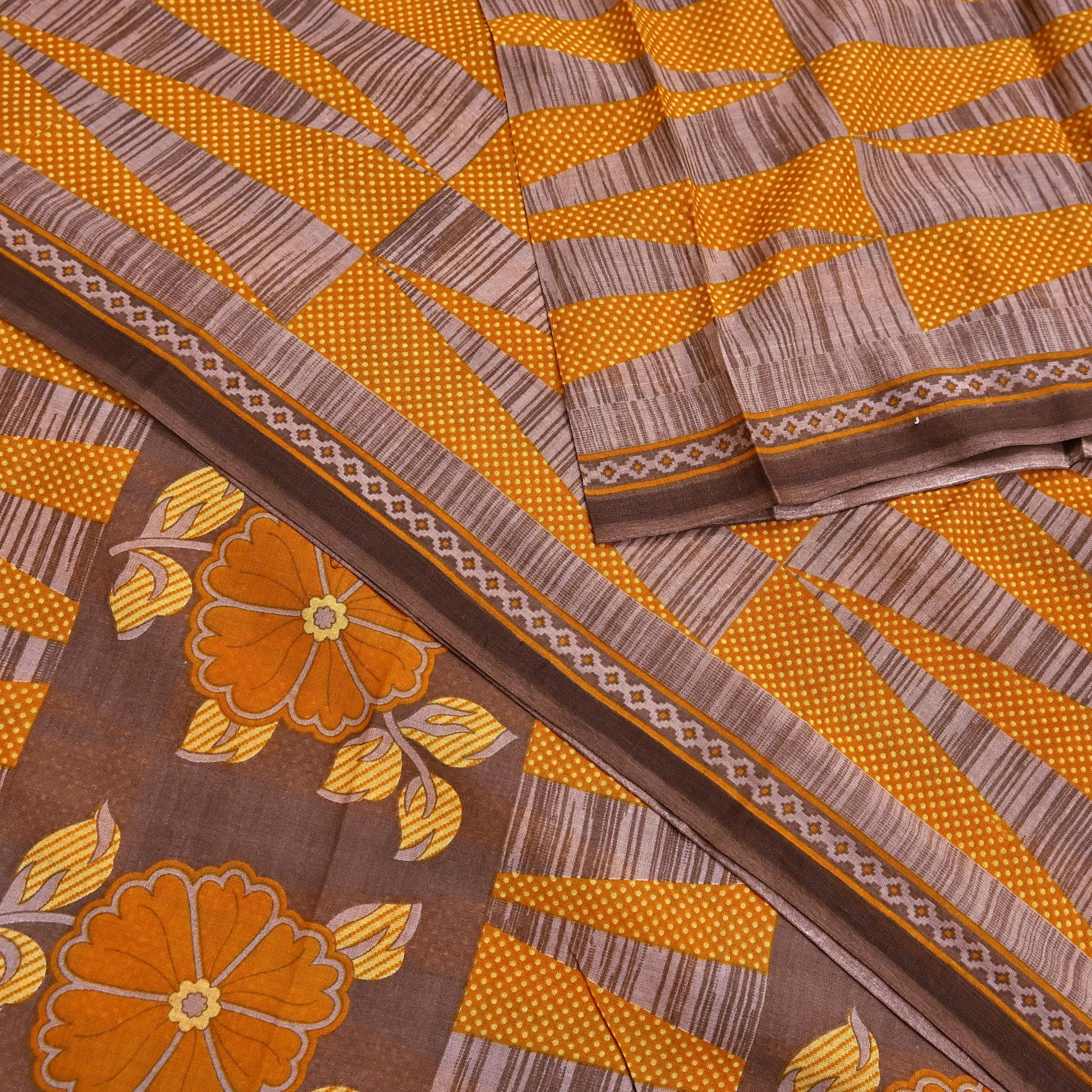 Nice Floral Design With Printed Work On Brown & Mustard Color Base Fabric Is Really Enhancing The Beauty Of The Saree.