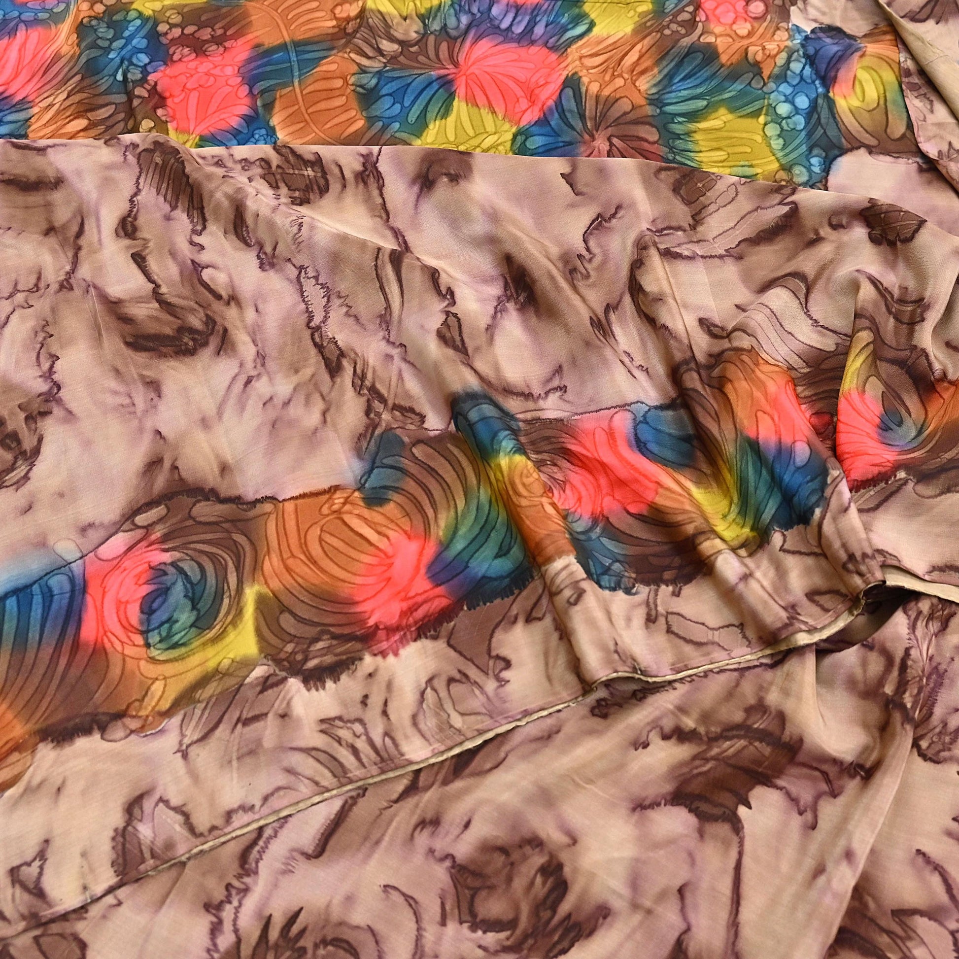 Step into timeless elegance with this vintage Brown Pure Crepe Silk Saree, featuring a vibrant fusion of bold Floral motifs. Crafted from 100% pure crepe silk, this saree offers a smooth, fluid drape and soft texture, making it a stunning piece for collectors, designers, or anyone seeking unique ethnic fabrics.