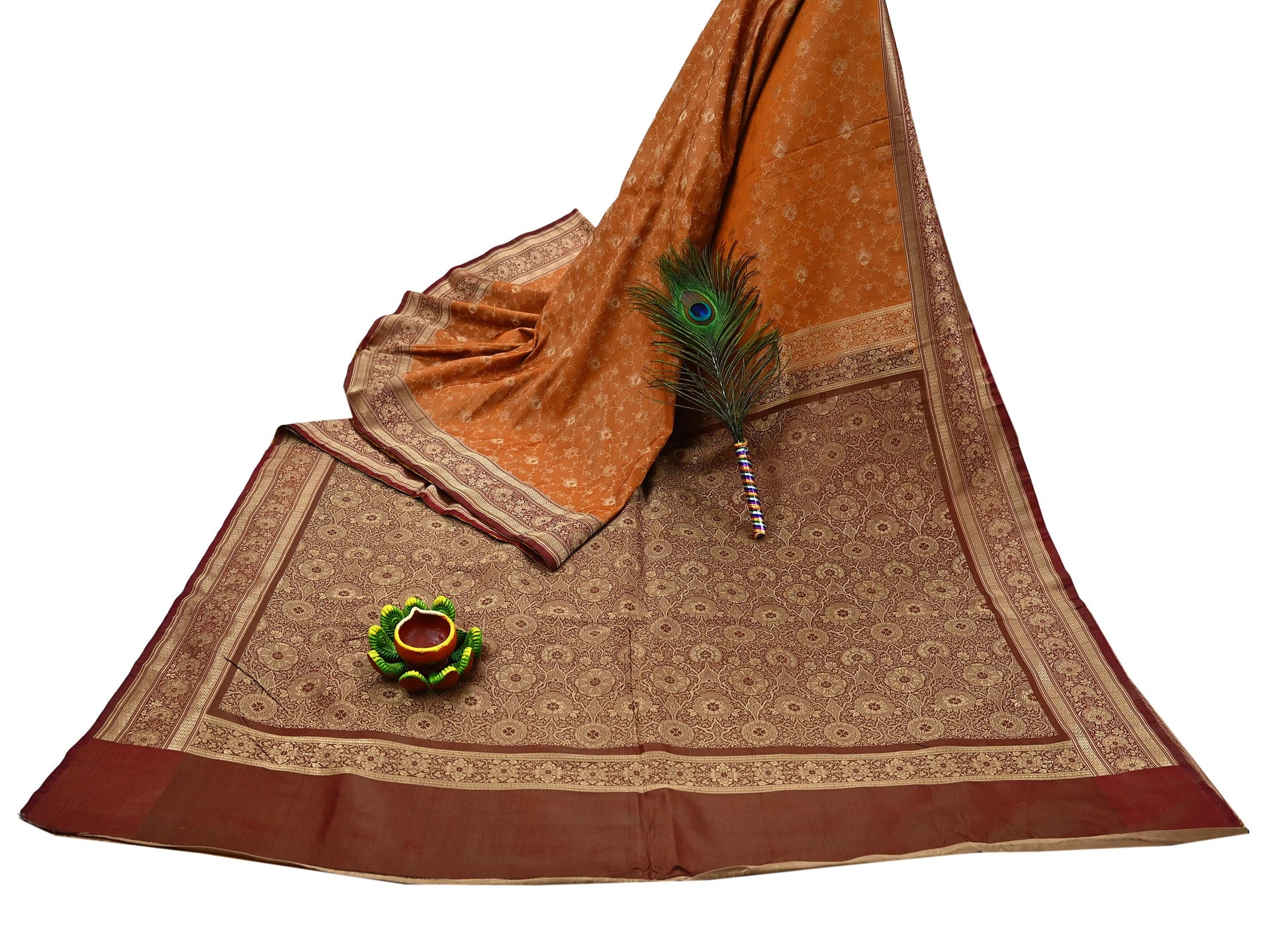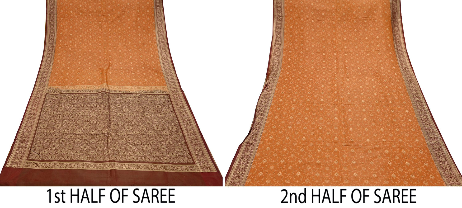 Indian Vintage Sari | Brown & Saffron | Pure Silk Woven Brocade | 5 Yards Craft Fabric Ethnic Sewing Crafting Quilting Dress making