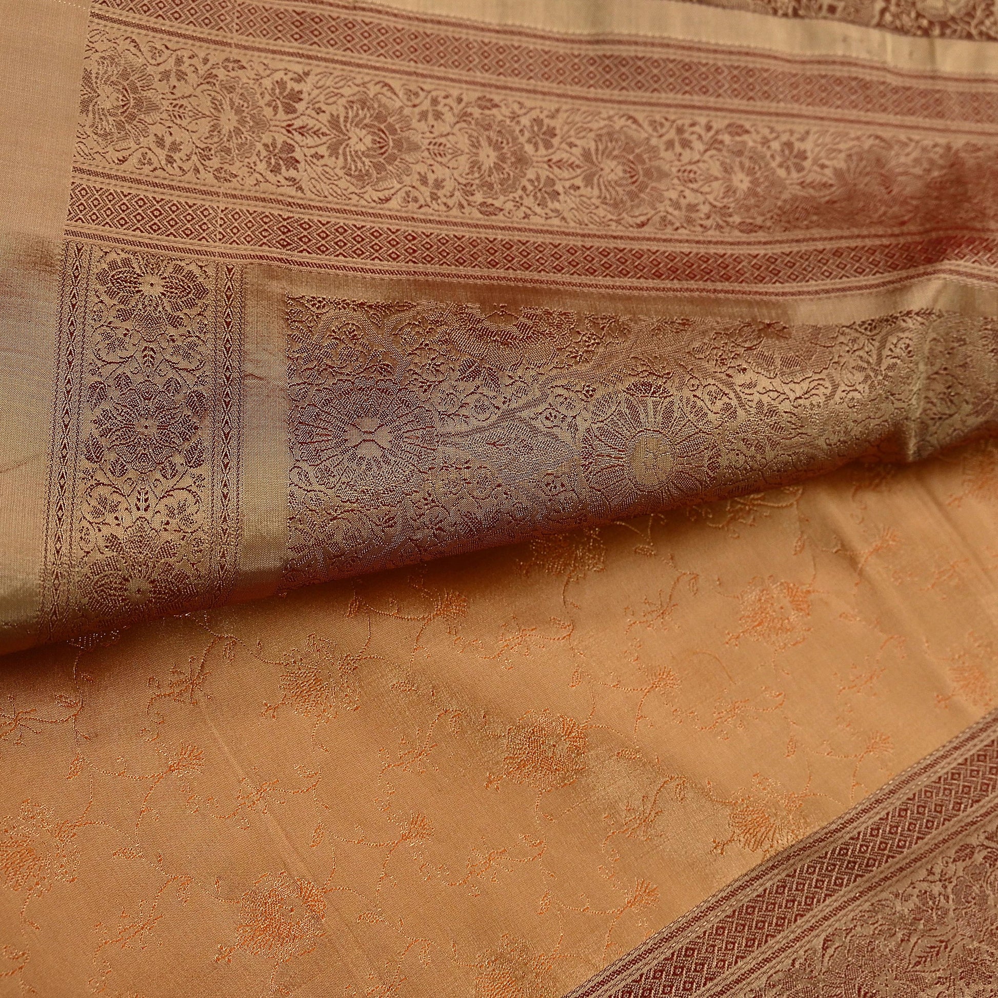 Add a regal touch to your wardrobe or creative projects with this exquisite vintage brown and saffron saree, woven from 100% pure silk. This elegant piece features a rich brocade weave, with delicate beige floral motifs adorning the pallu and border—offering a timeless blend of heritage and luxury.