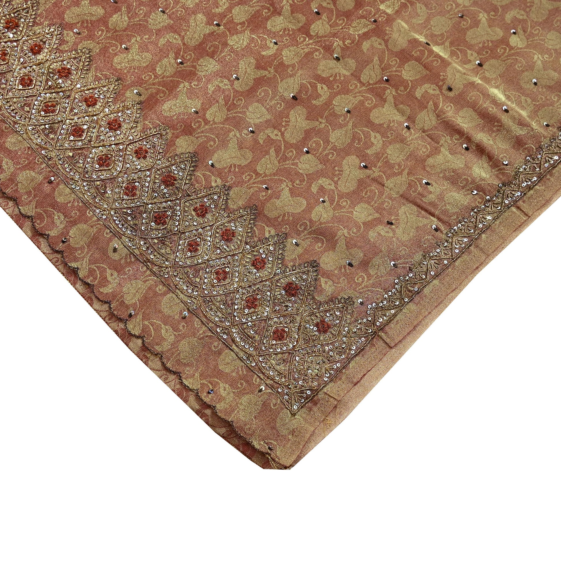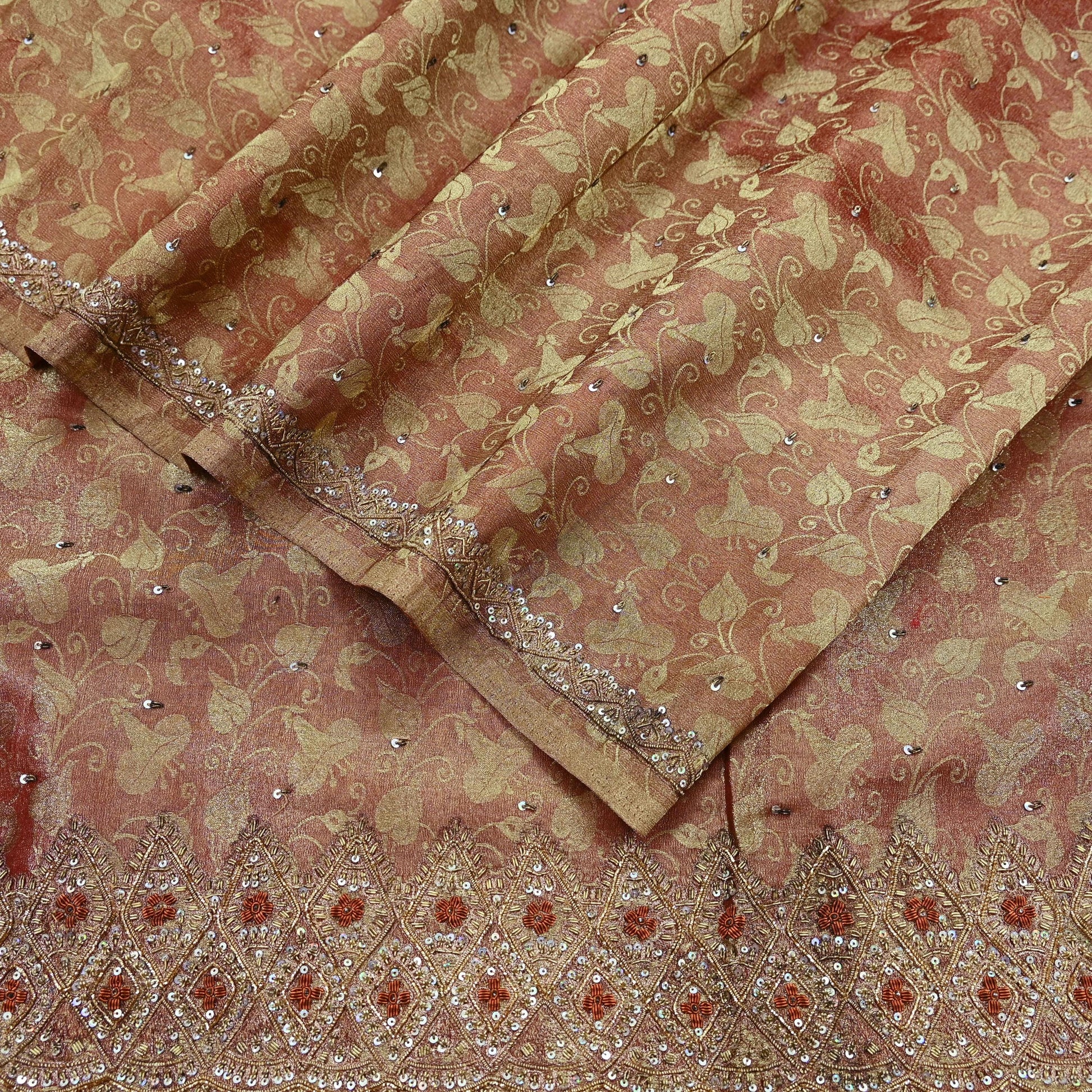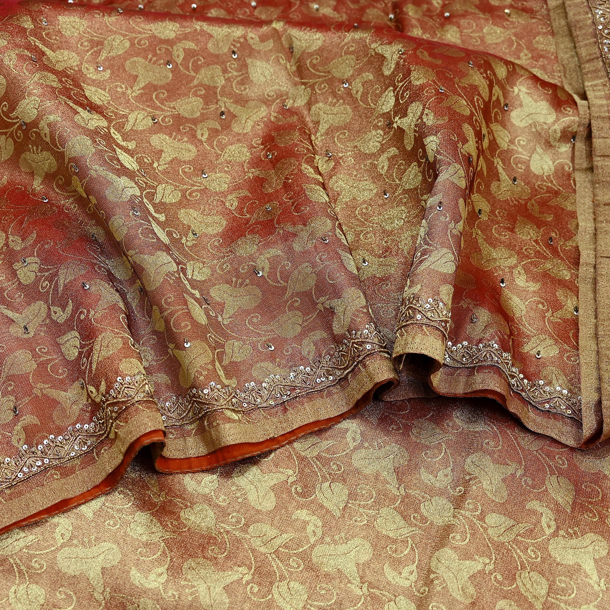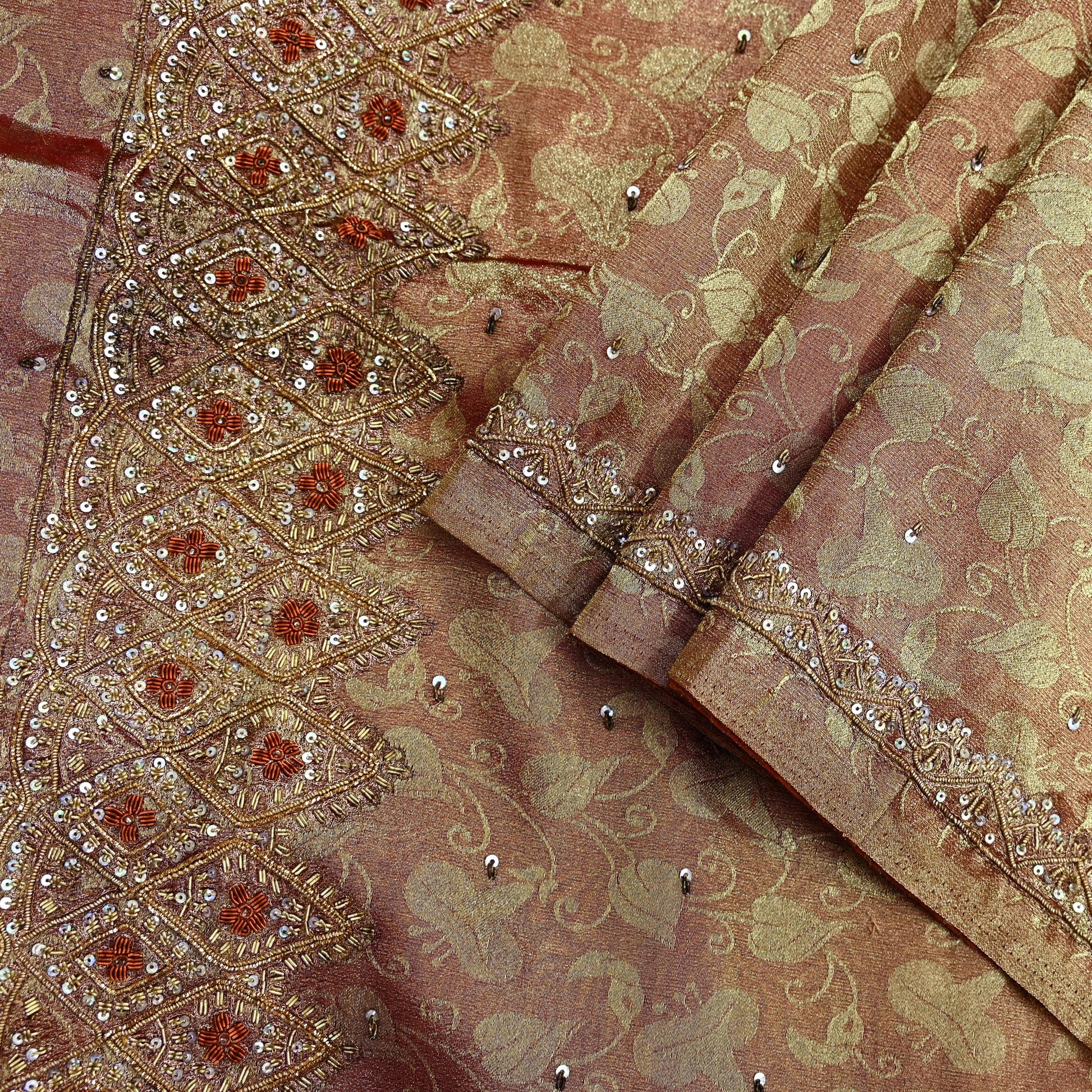 Make a statement with this stunning vintage tissue saree in rich shades of golden and maroon, lavishly adorned with intricate hand embroidery. The pallu and border feature luxurious floral motifs, embellished with golden and orange zardozi, dabka, zari, and shimmering silver sequins. Similar embroidered motifs continue across the center portion, adding depth and opulence to the entire piece.