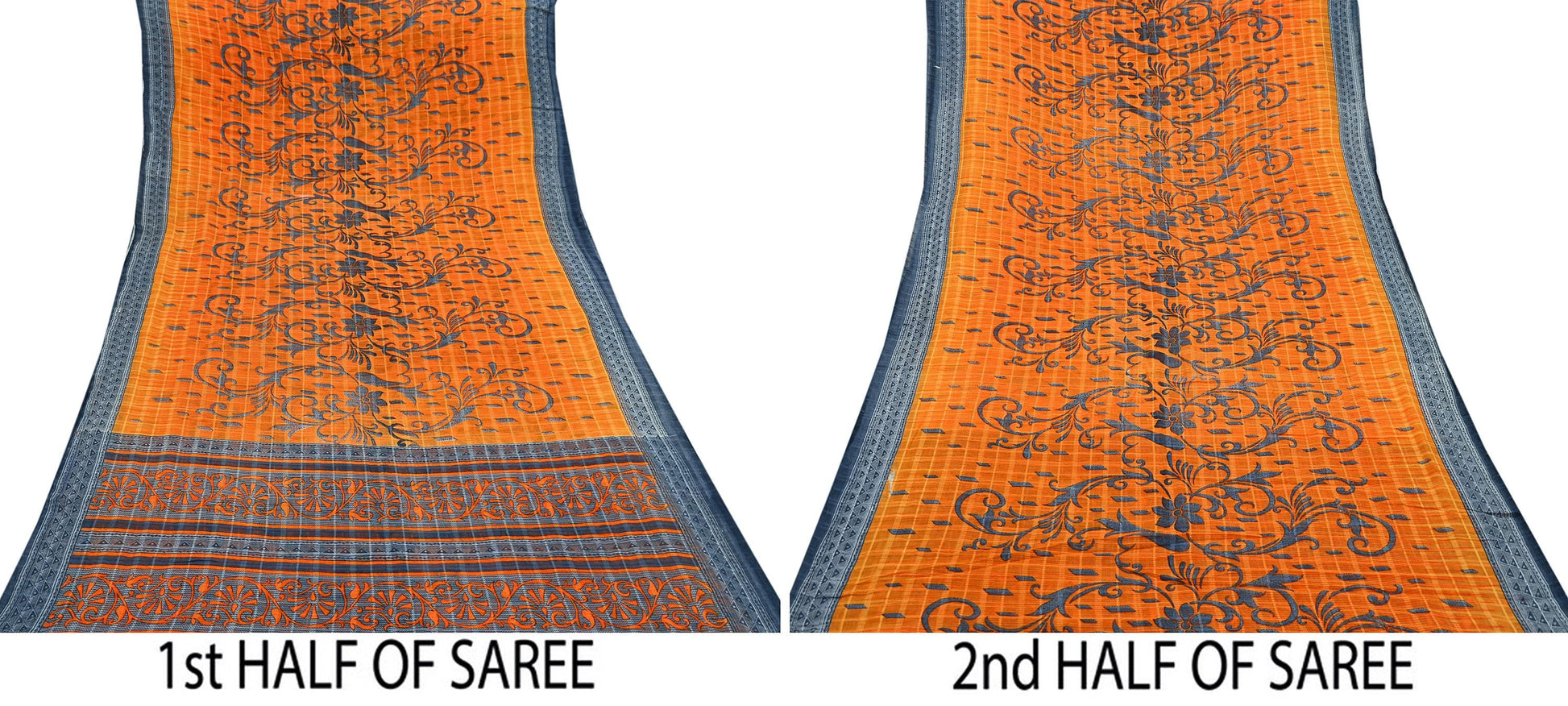 Indian Vintage Sari Gray & Orange Printed Pure Cotton Saree Craft Fabric Soft Floral 5Yd Sarong Wrap Boho Kimono Soft Dress making Quilting
