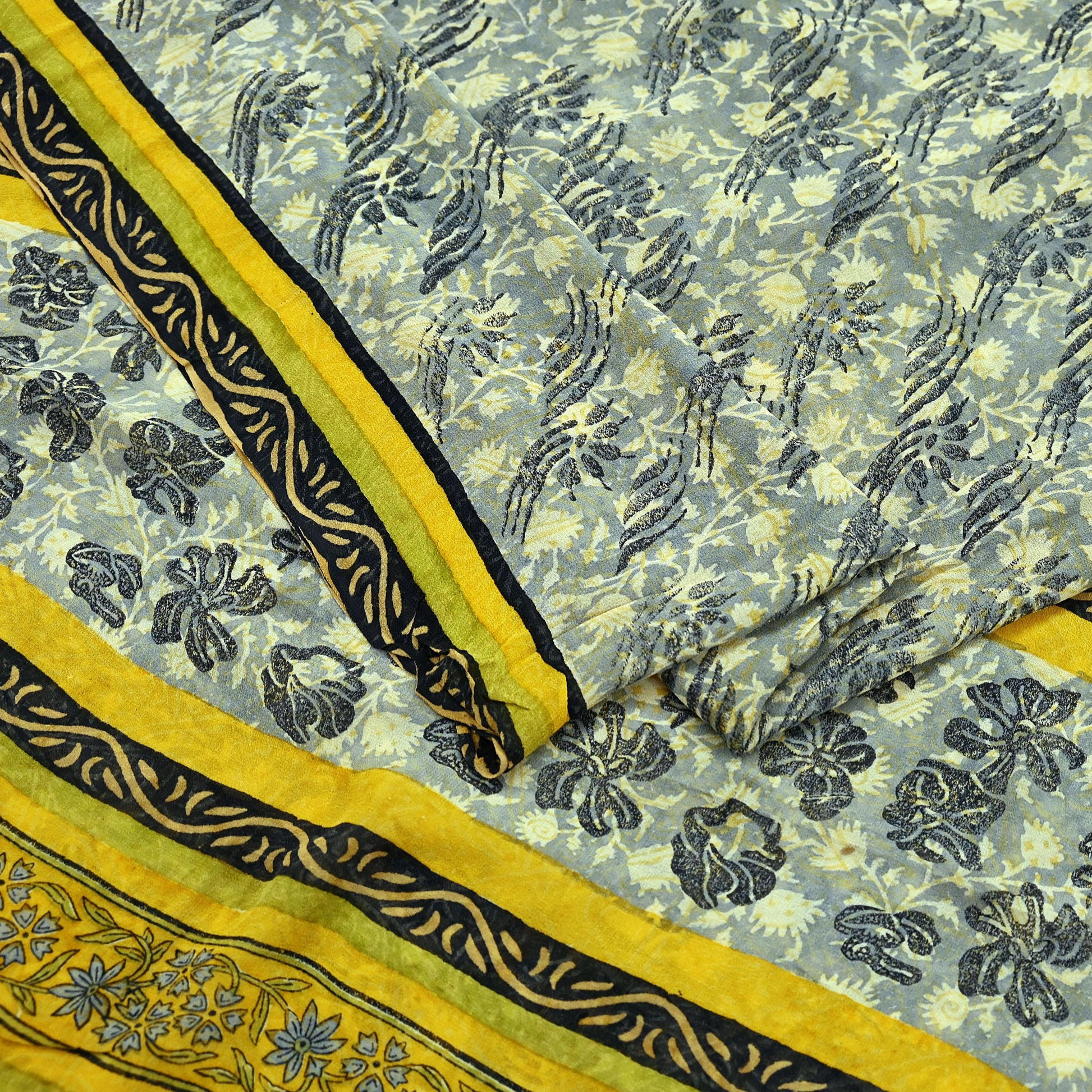 Indian Vintage Sari Gray & Yellow Pure Georgette Silk Printed Sarees 5Yd Craft Fabric Sewing Quilting Dress making Crafting Quilting Upcycle
