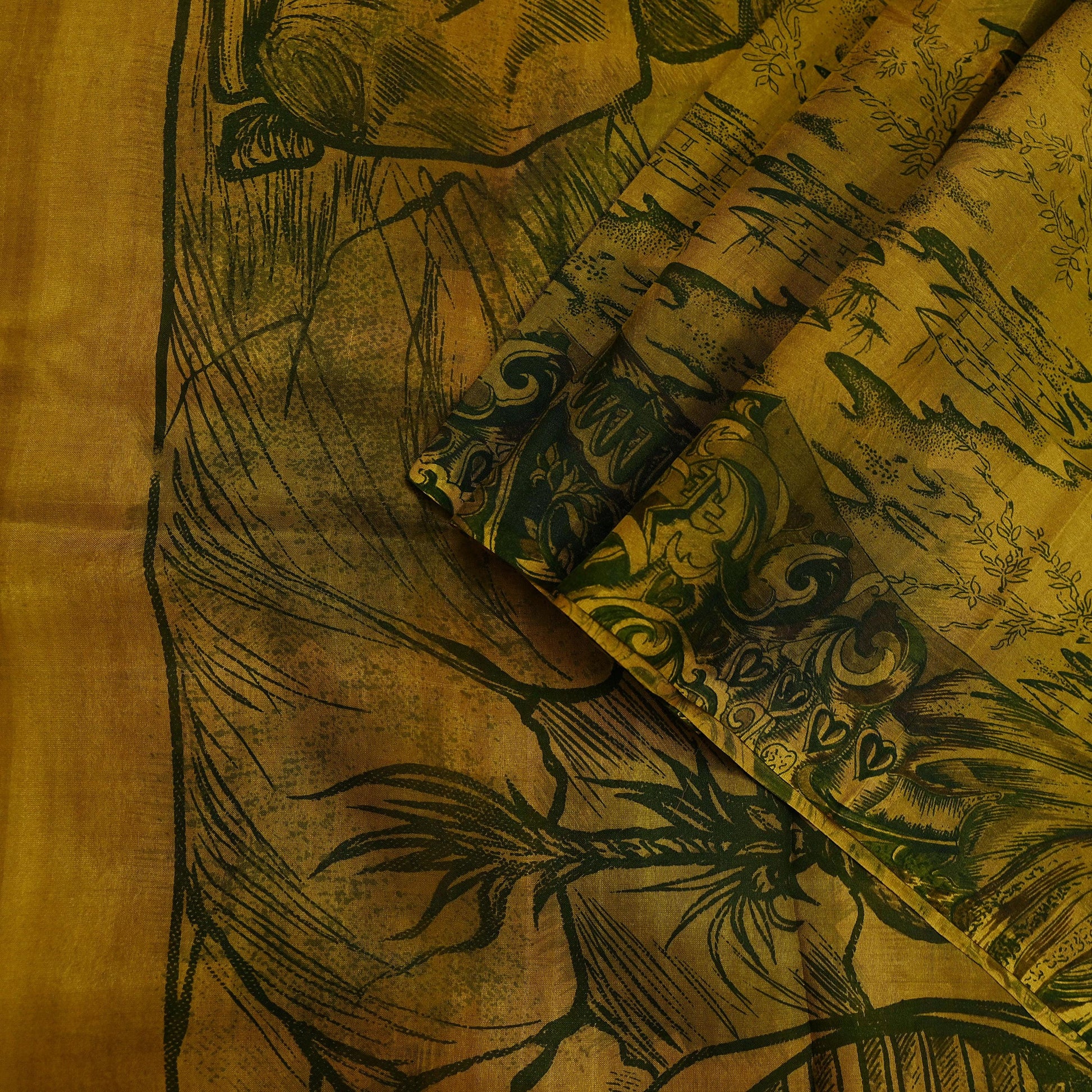 *Attractive Green & Black Colored Printed Pure Silk Saree.