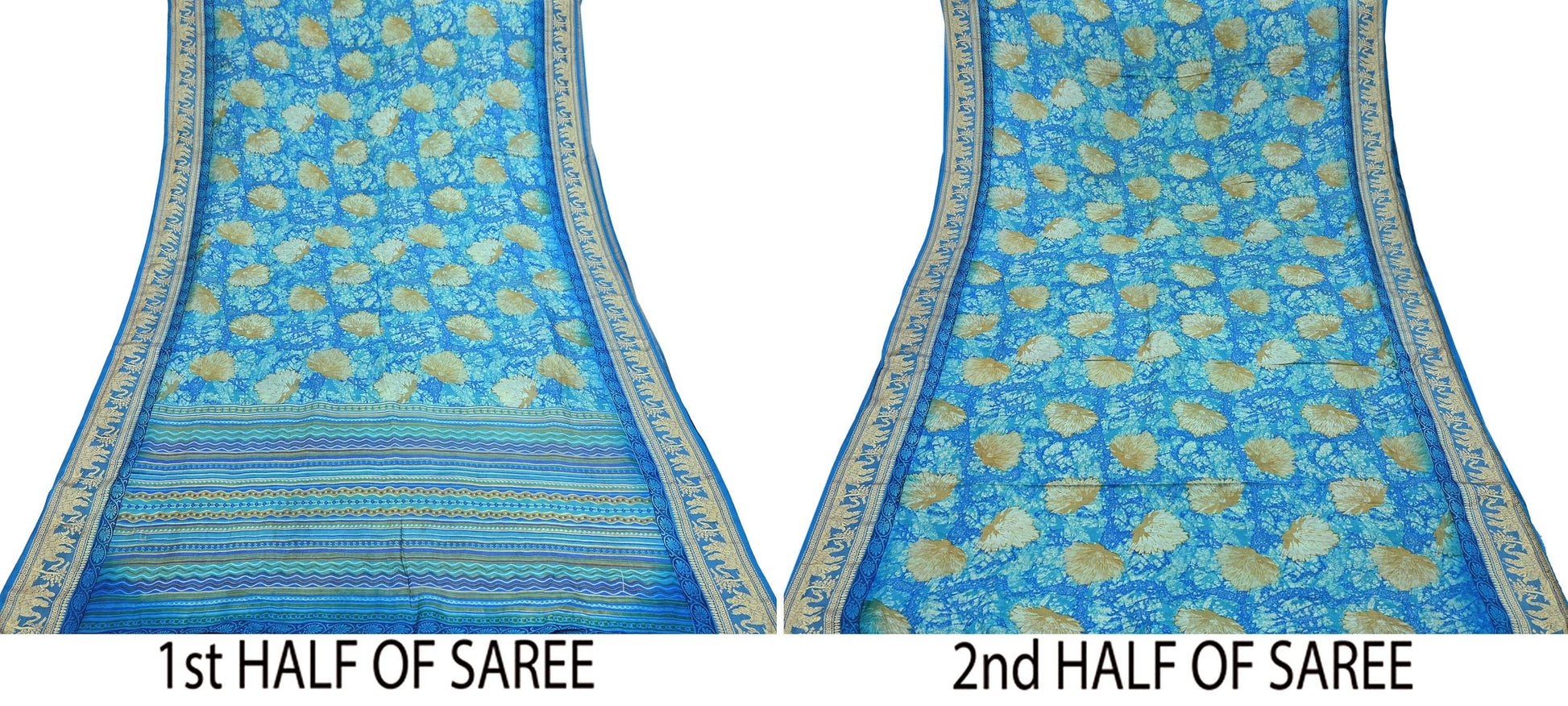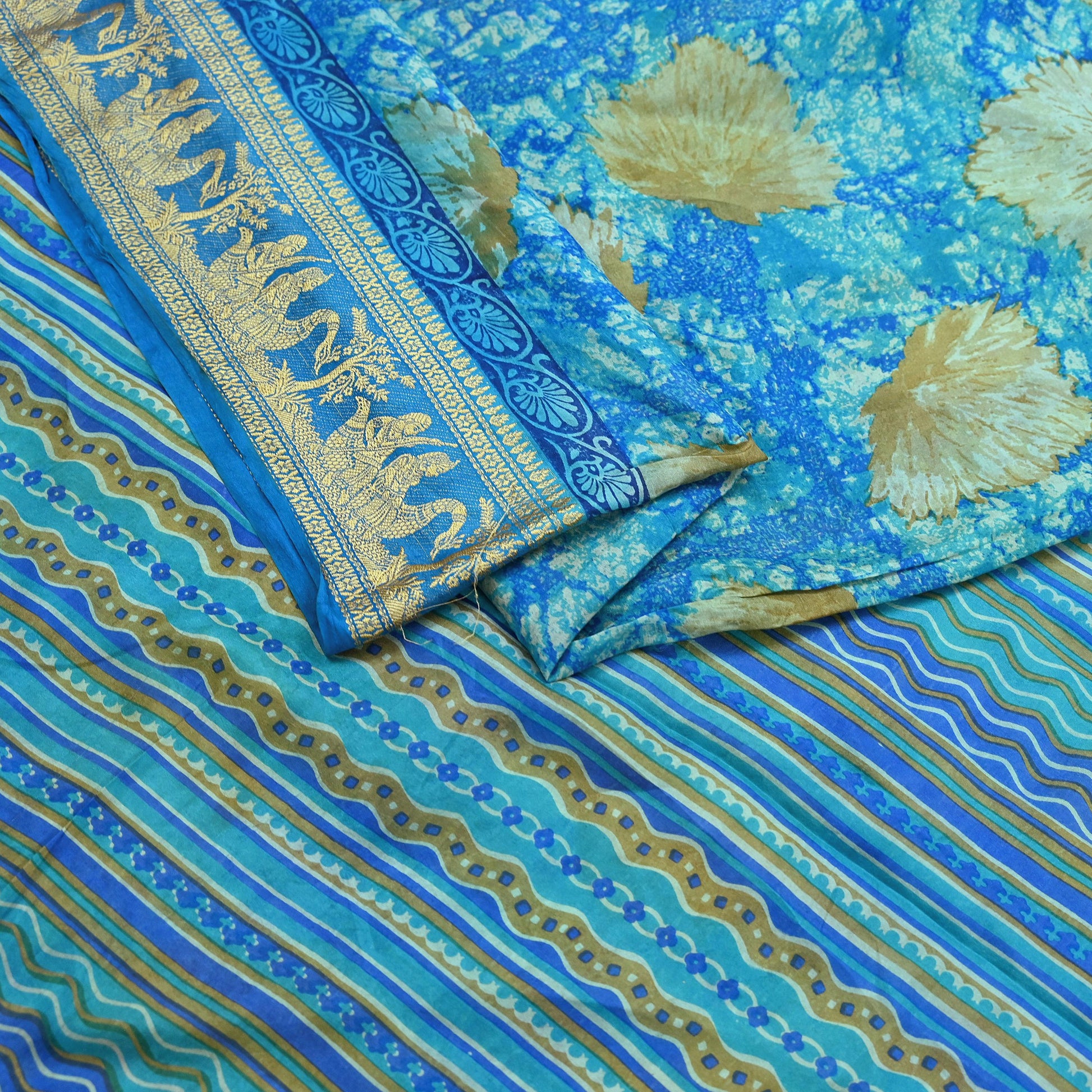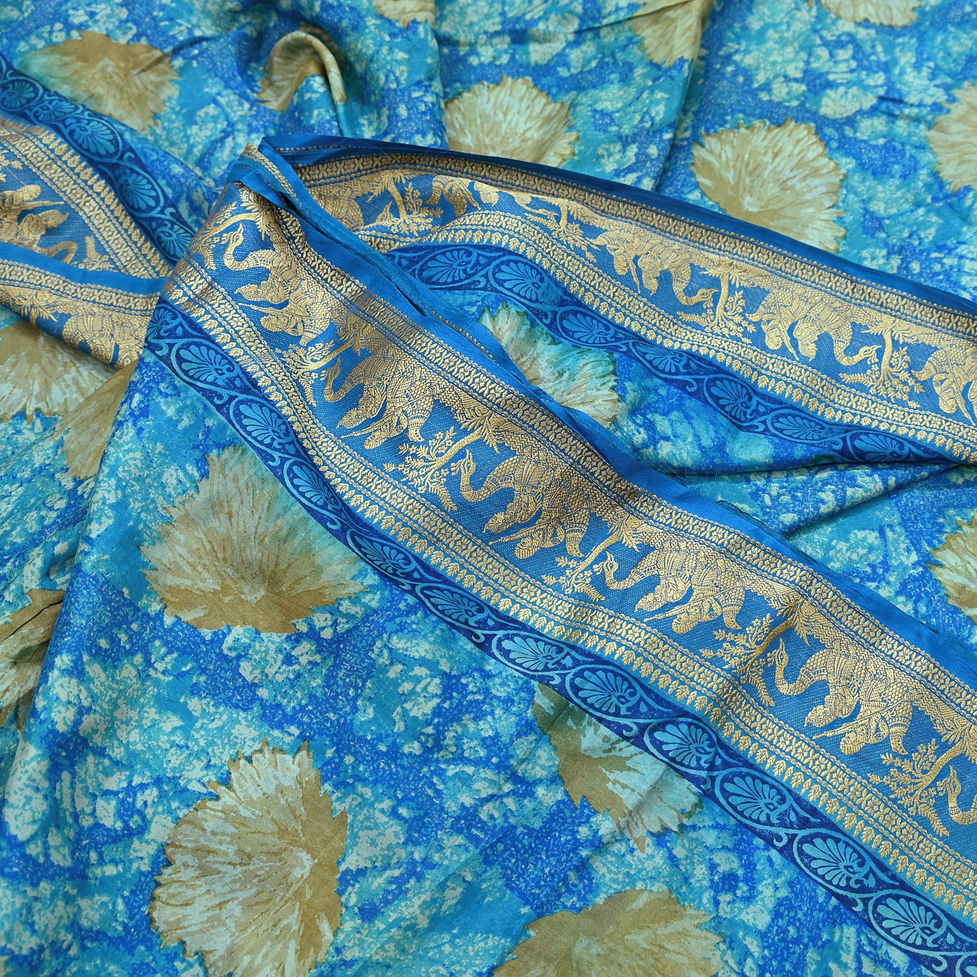 Indian Vintage Sari Green & Blue 100% Pure Silk Printed Sarees 5yd Sewing Craft Fabric Dress Making Soft Woven Border Upcycle Quilting