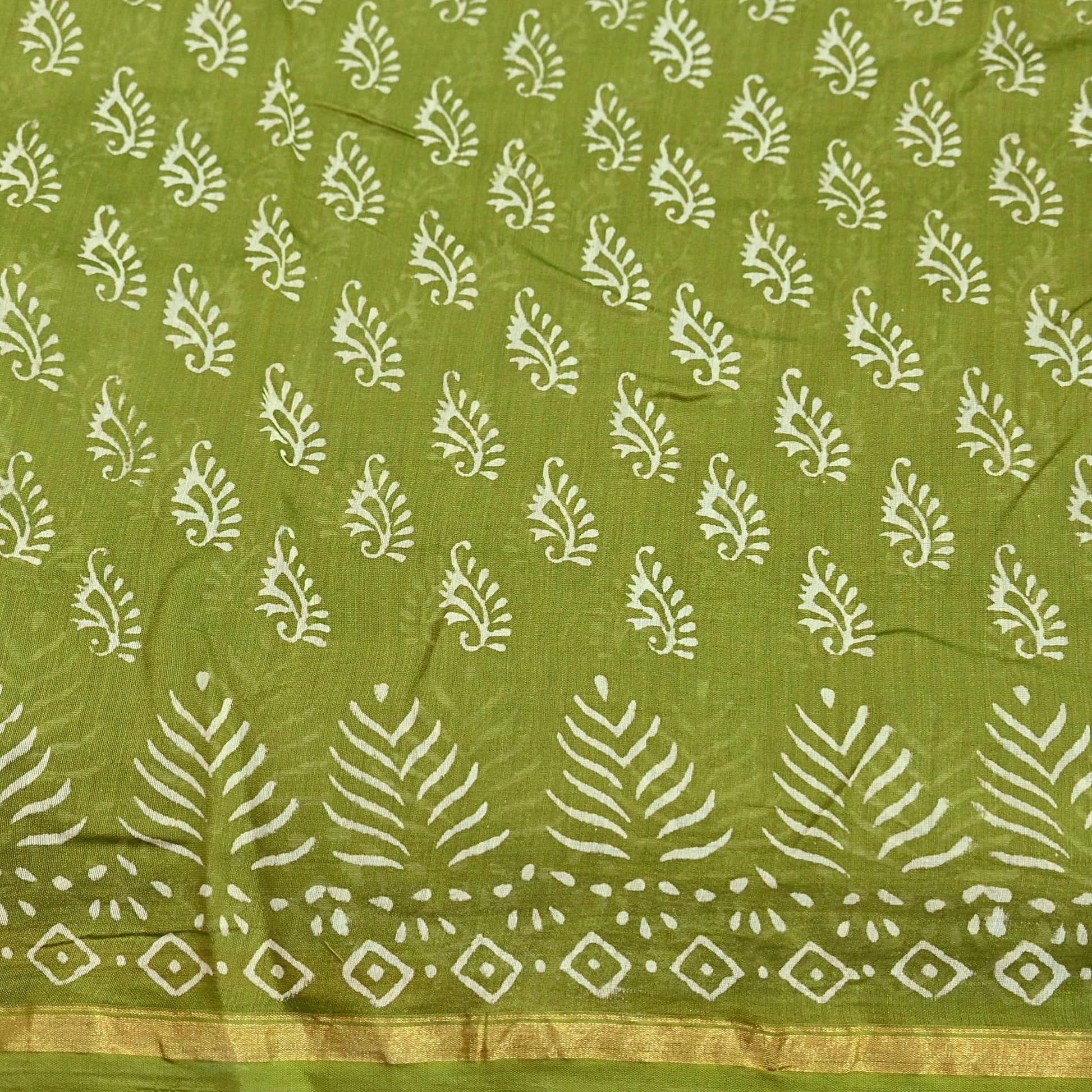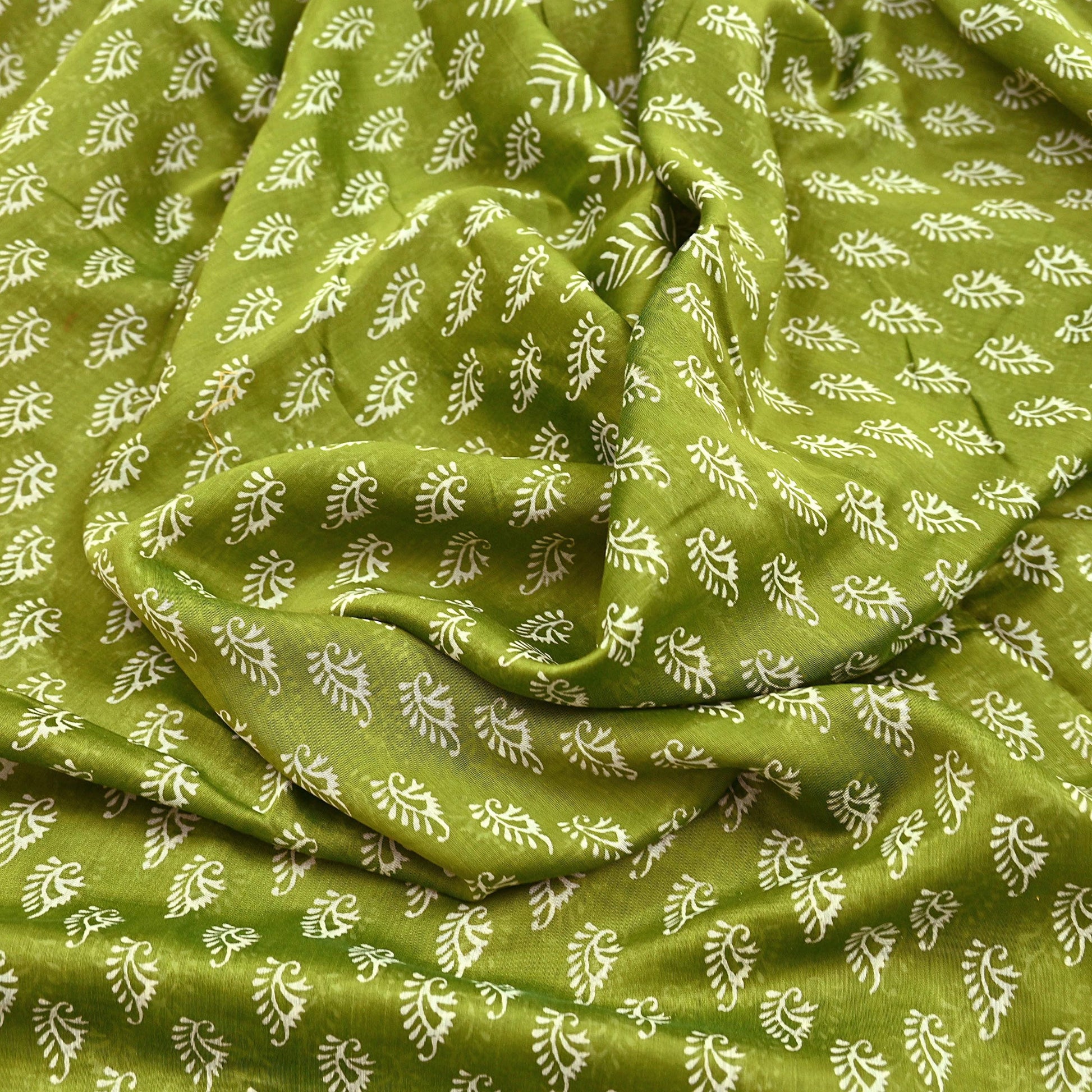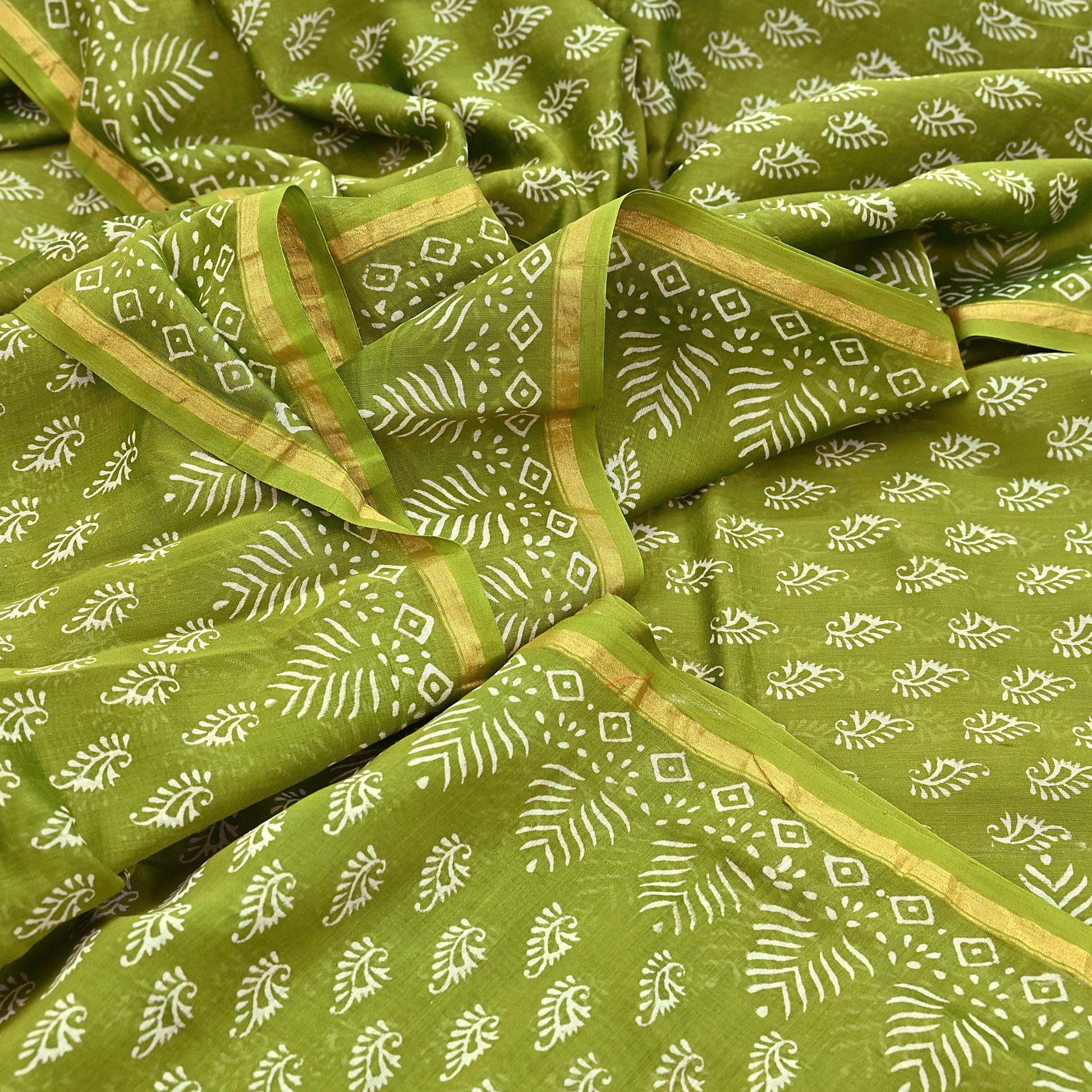 Indian Vintage Sari Green chanderi Silk Bagru Printed Saree 5Yd Fabric Floral Soft Zari Border Ethnic Upcycle Crafting Dress making