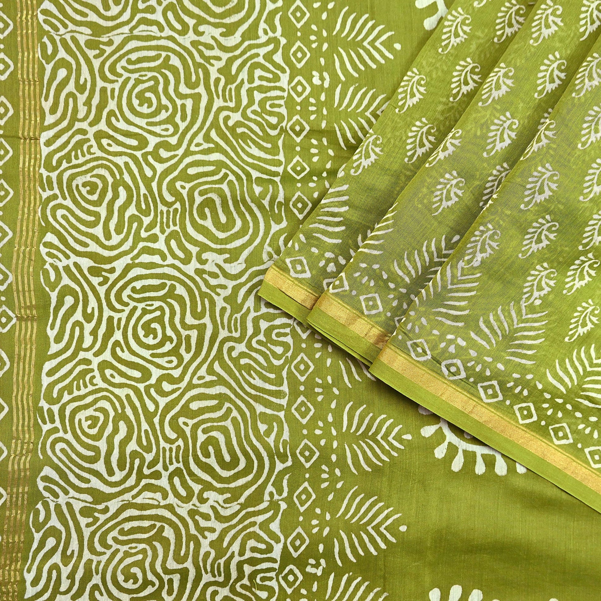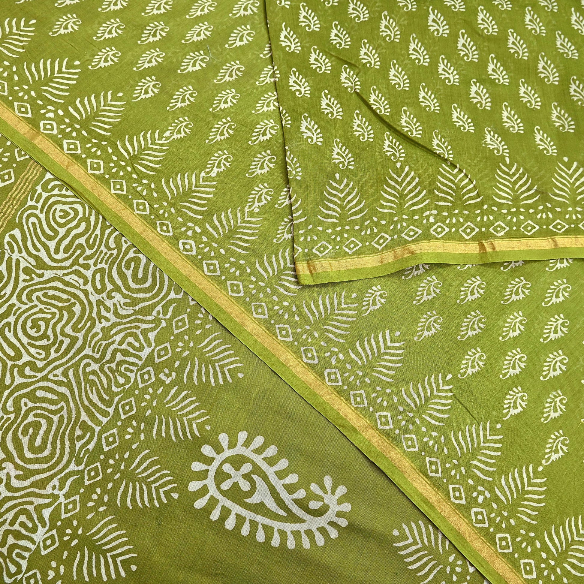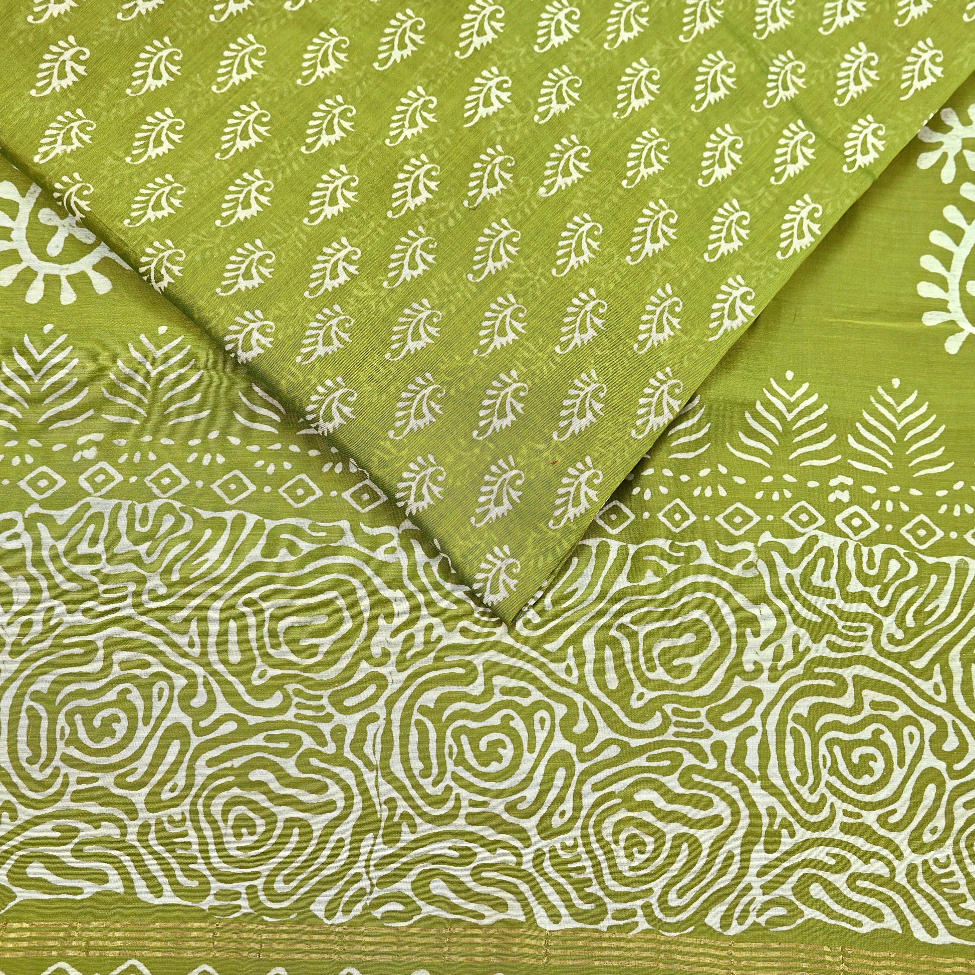 Indian Vintage Sari Green chanderi Silk Bagru Printed Saree 5Yd Fabric Floral Soft Zari Border Ethnic Upcycle Crafting Dress making