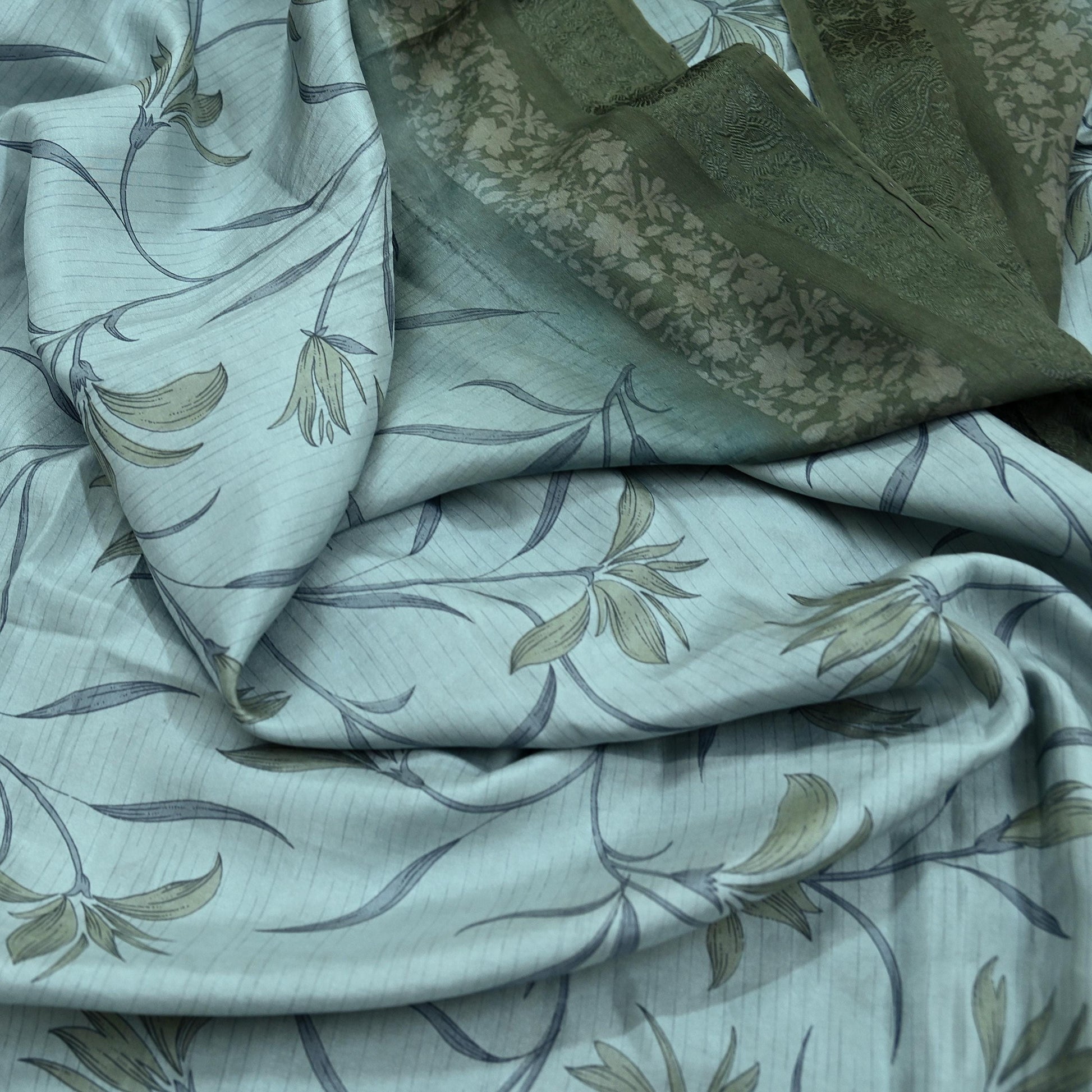Nice Floral Design With Printed Work On Green & Gray Color Base Fabric Is Really Enhancing The Beauty Of The Saree.