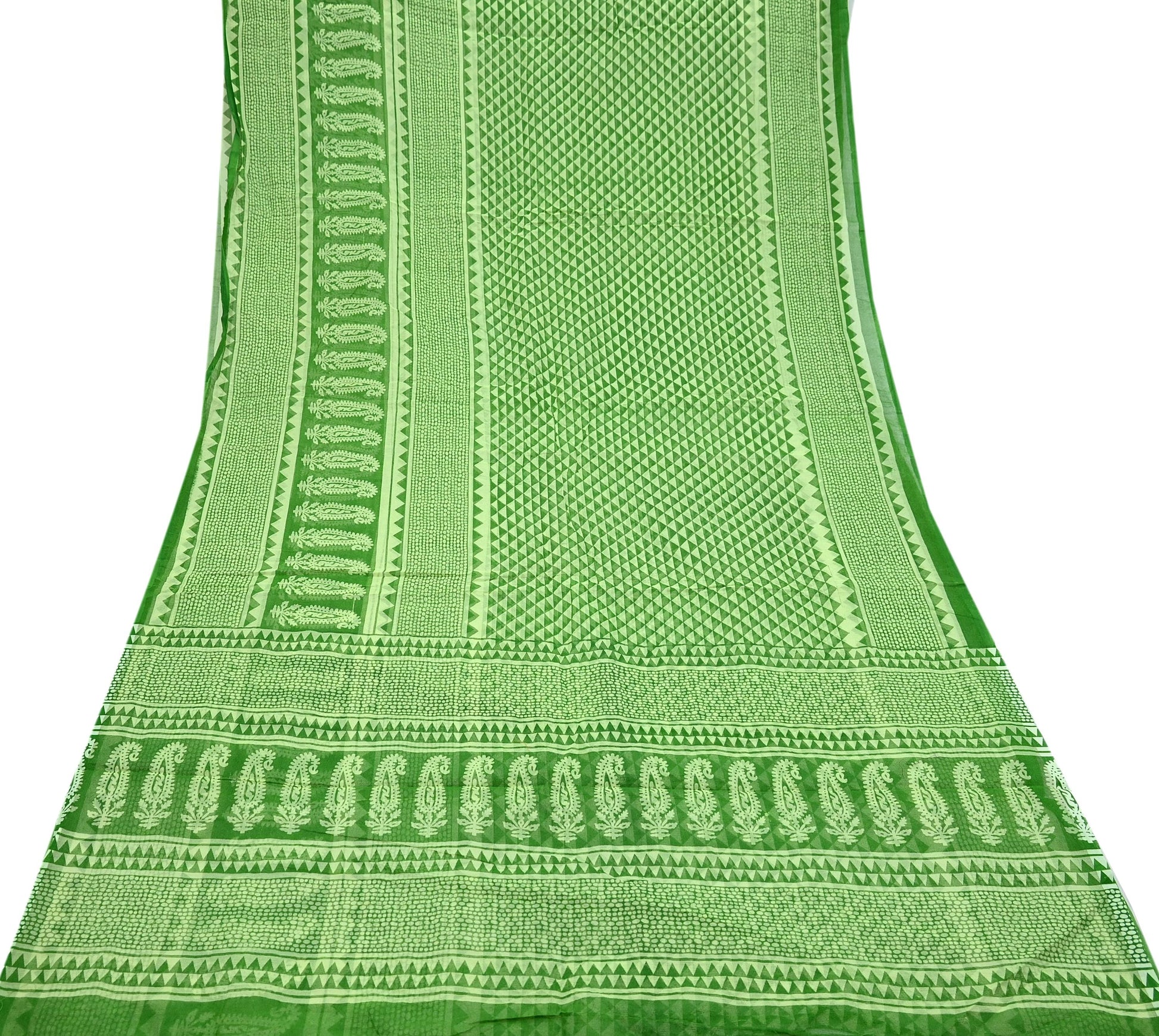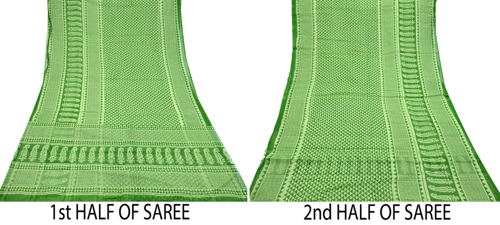 Indian Vintage Sari Green & Ivory Printed Pure Cotton Sarees 5Yd Craft Fabric Soft Sewing Sarong Wrap Boho Upcycle quilting Dress making