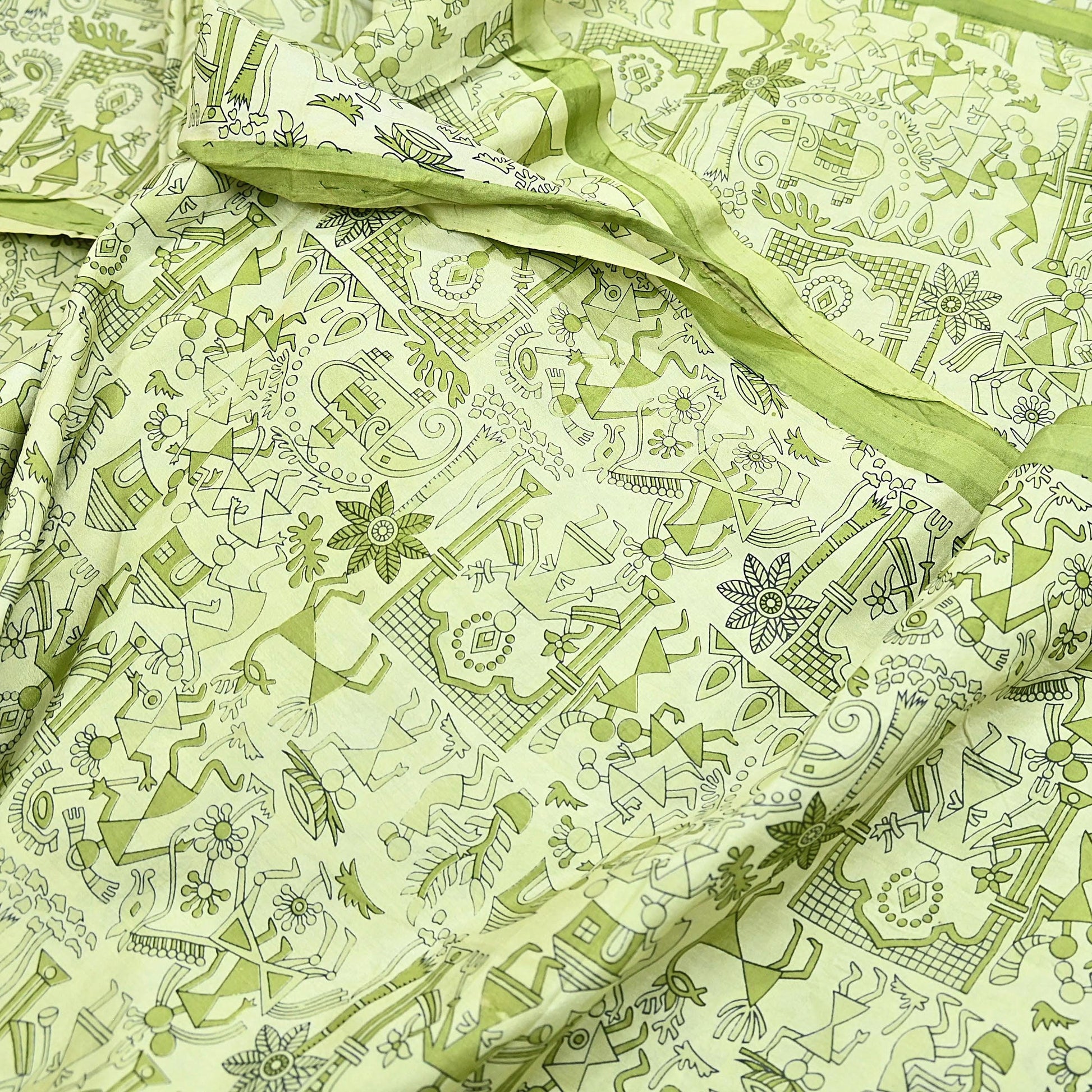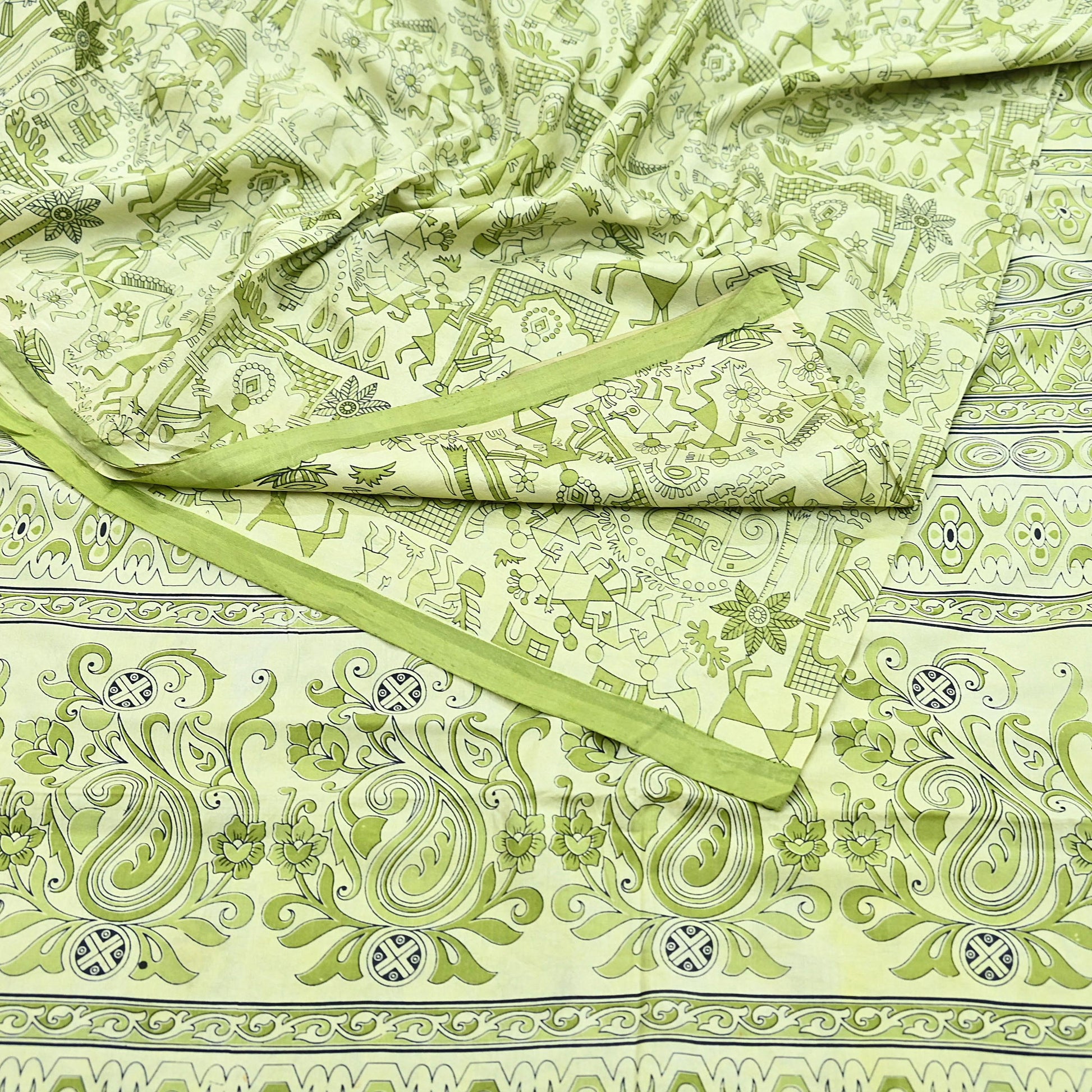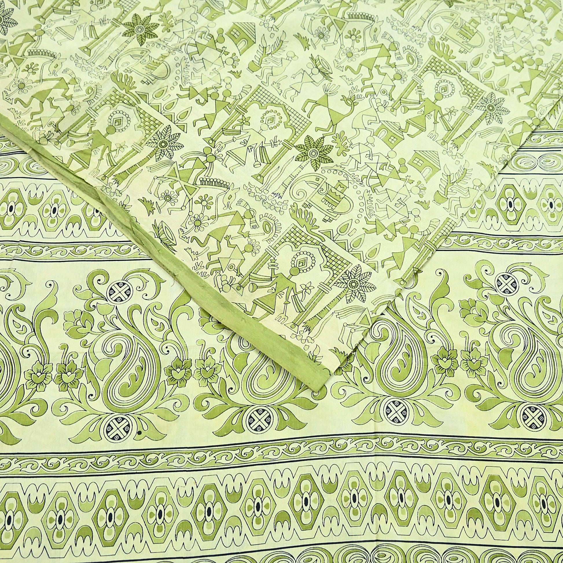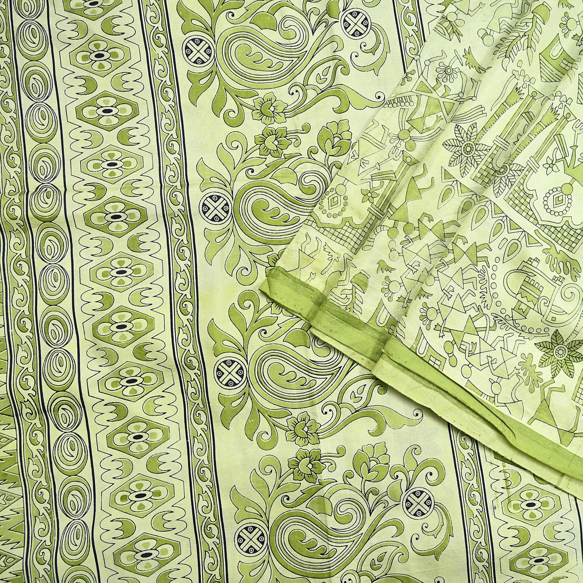 Indian Vintage Sari green & ivory Pure Silk Warli Printed Saree Craft Fabric 5Yd Dress making Sewing Dress making For Crafting Quilting