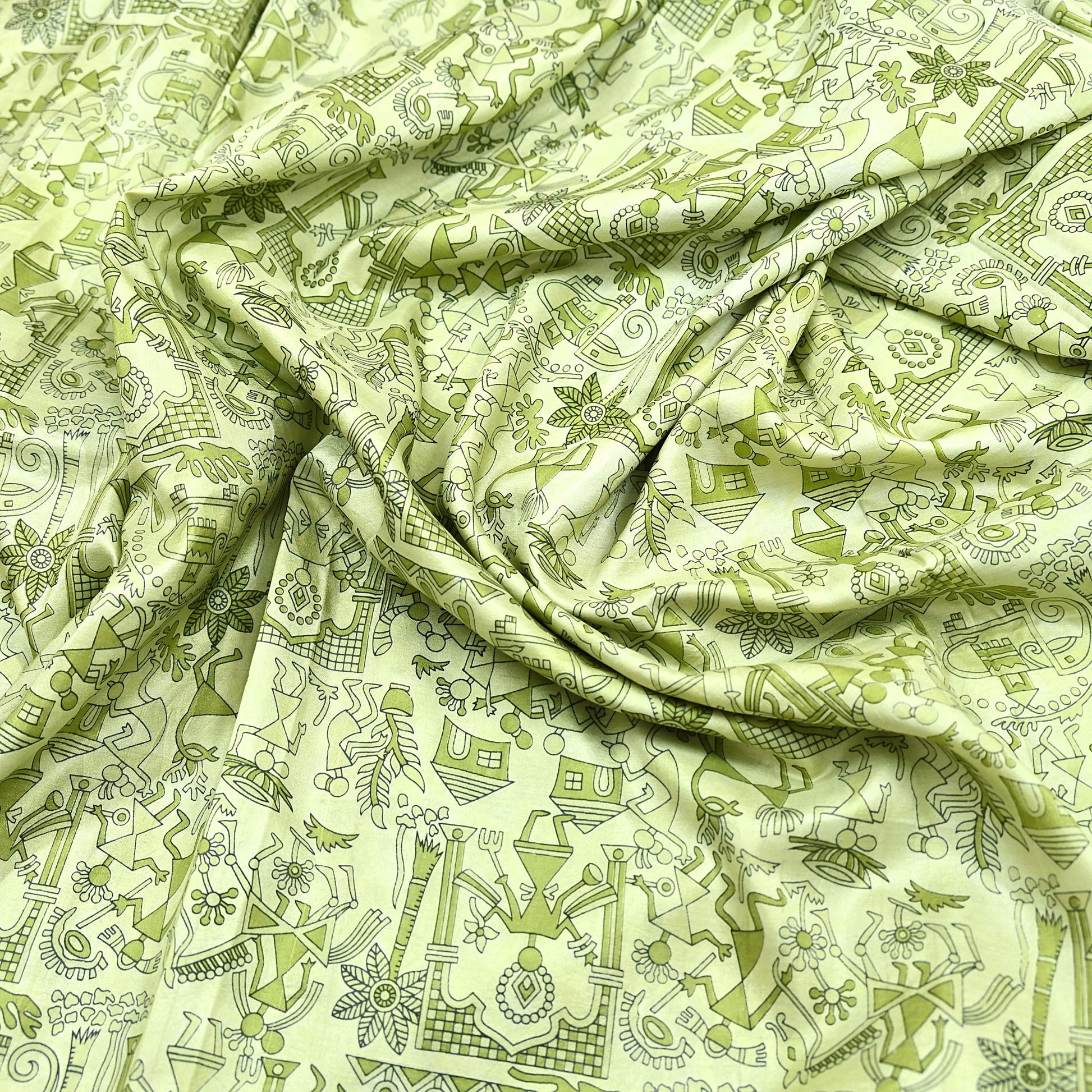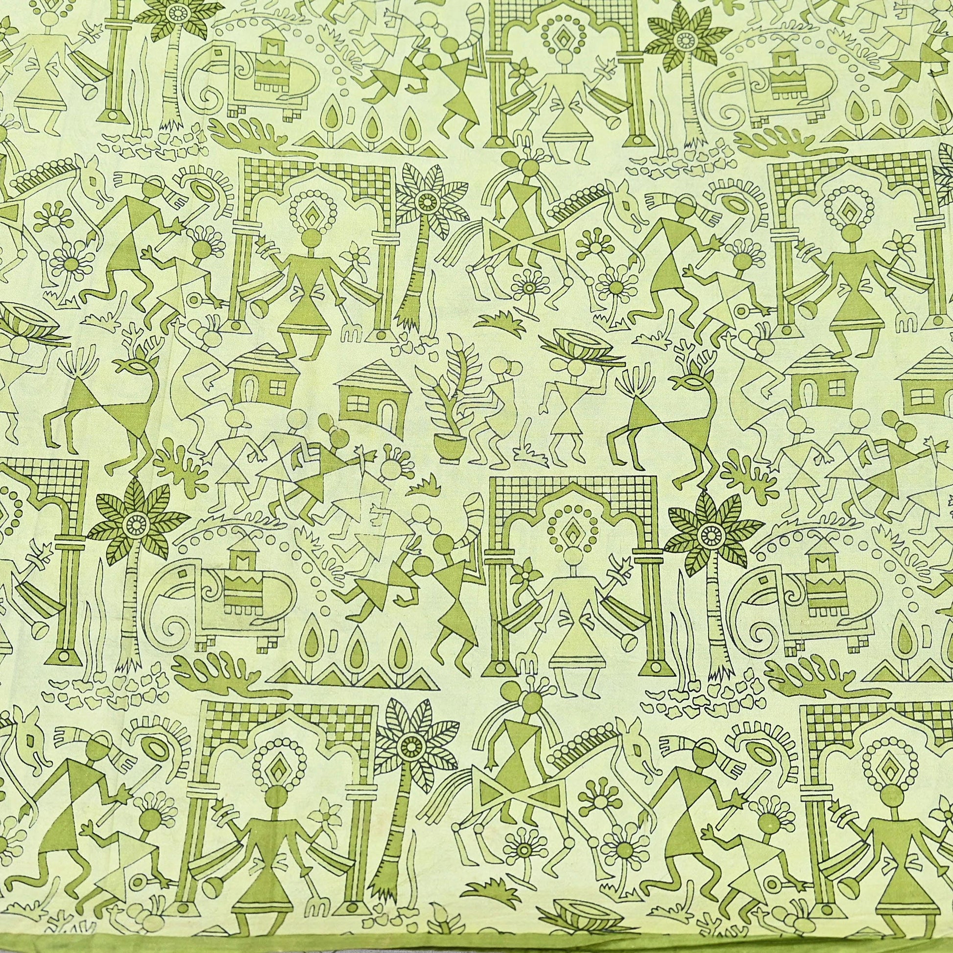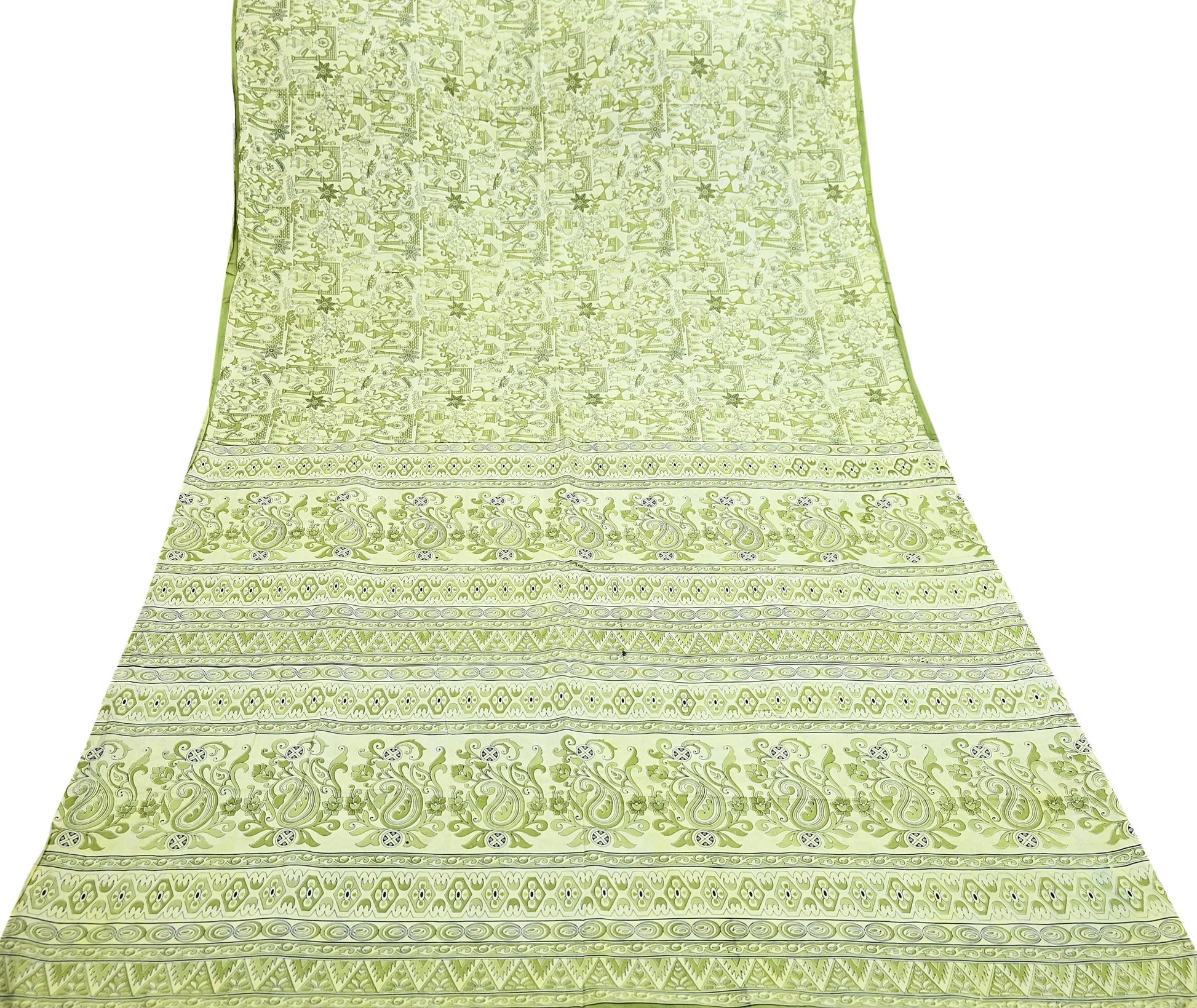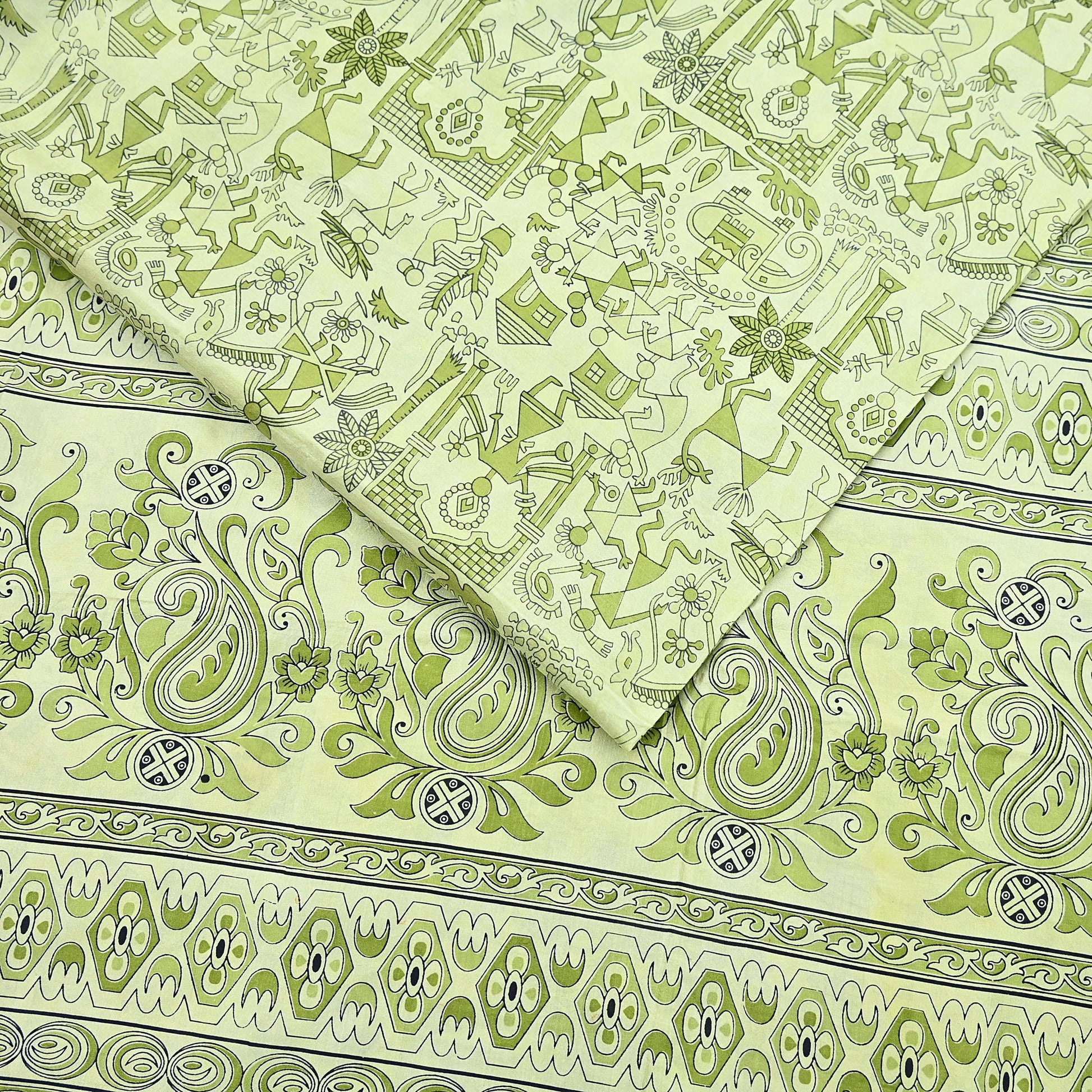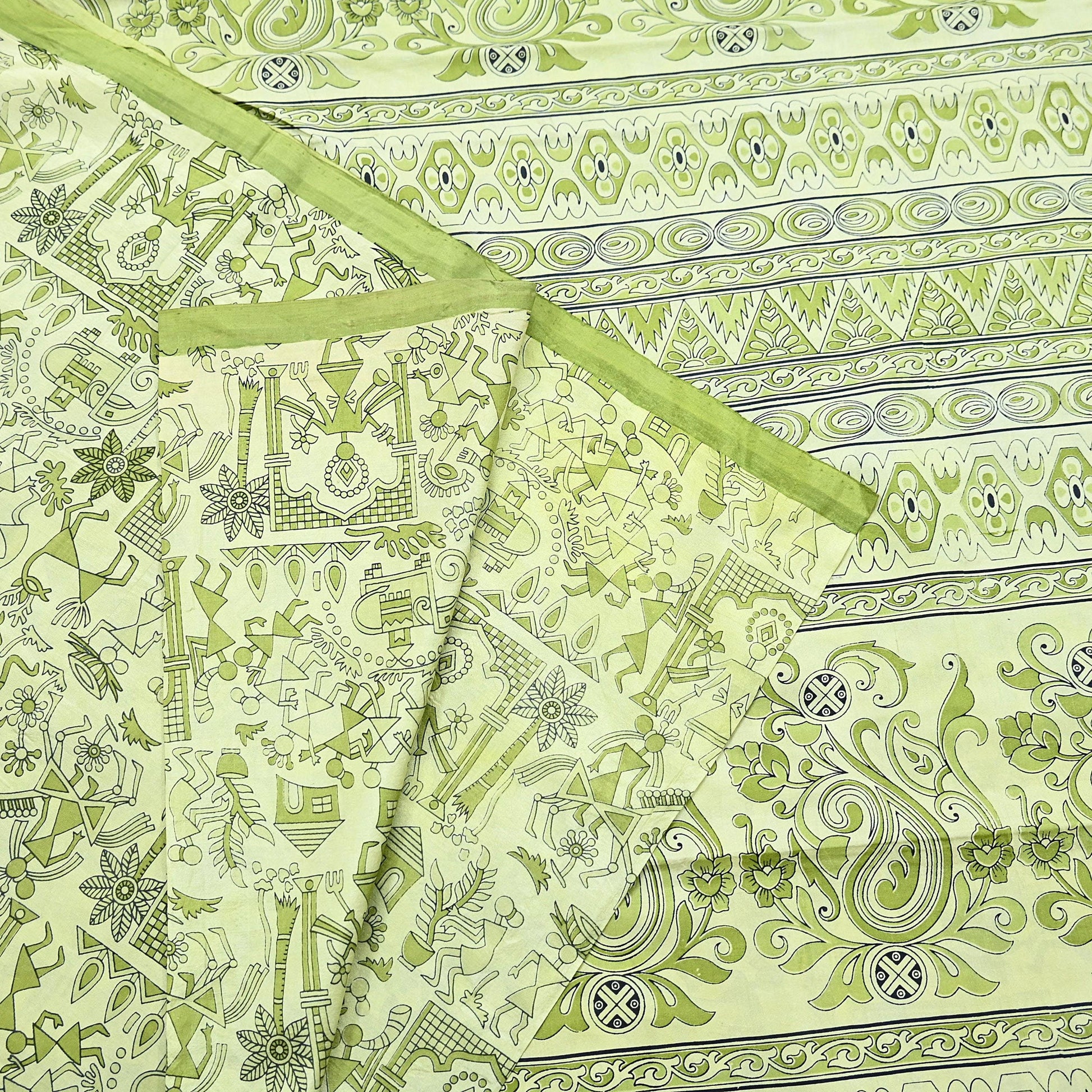 Indian Vintage Sari green & ivory Pure Silk Warli Printed Saree Craft Fabric 5Yd Dress making Sewing Dress making For Crafting Quilting