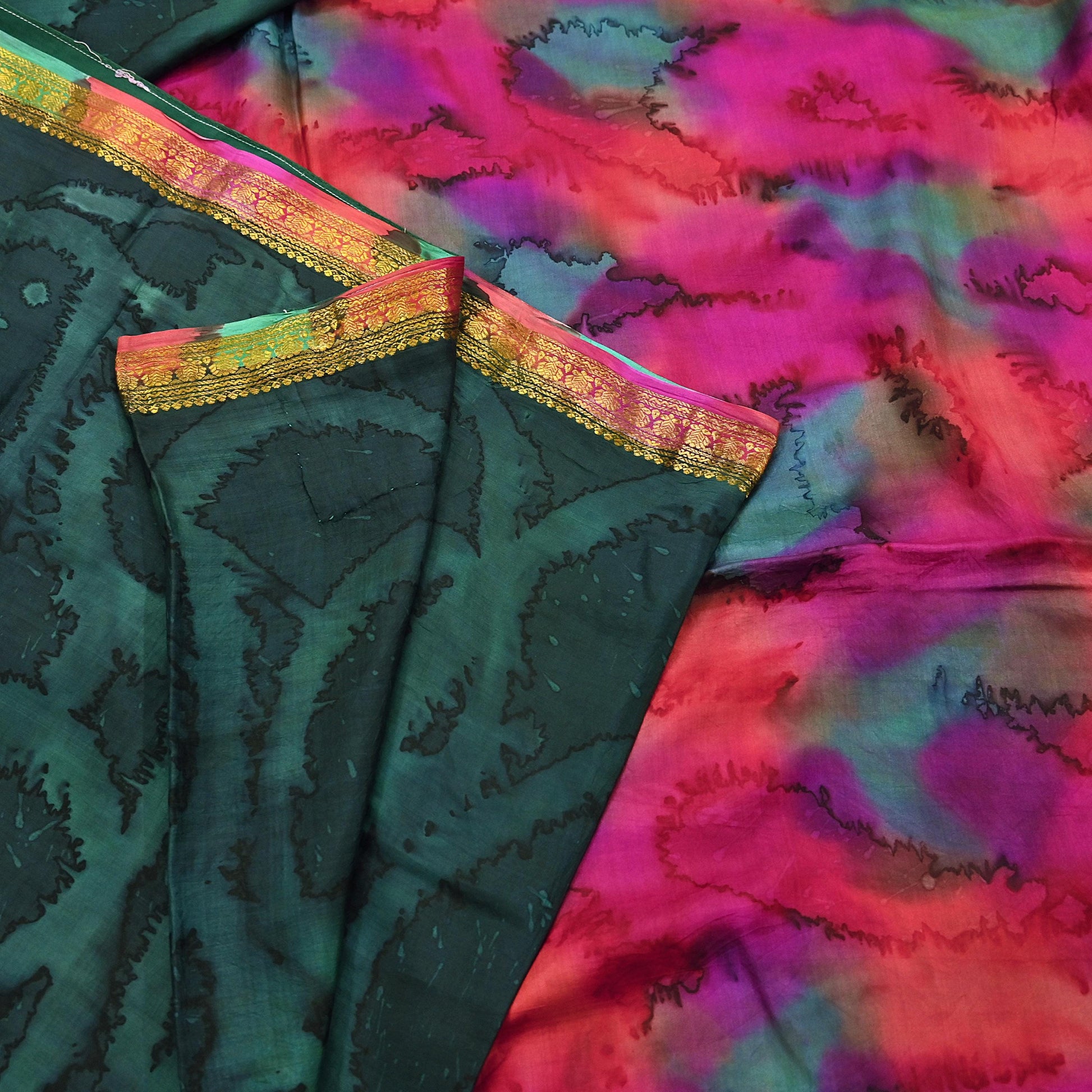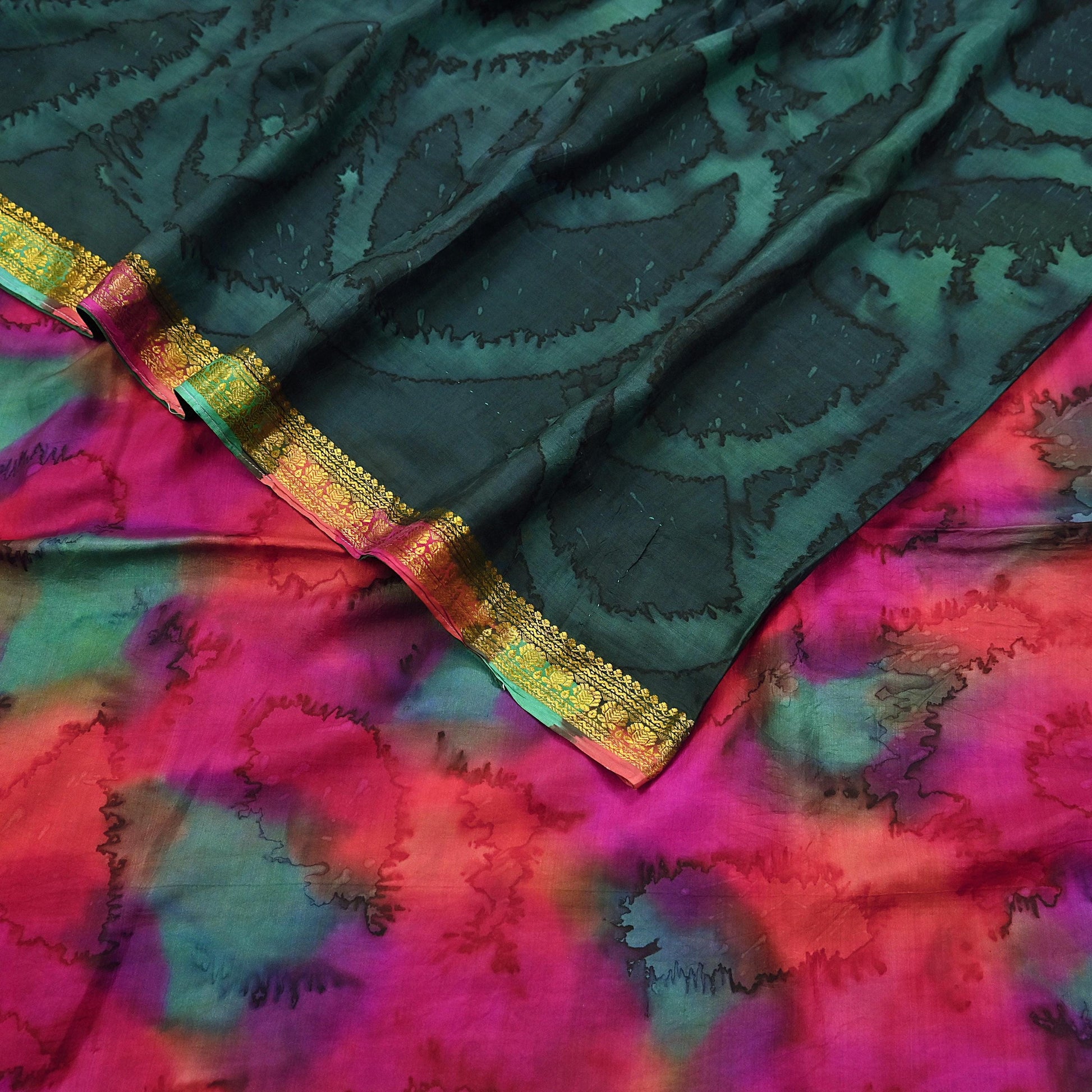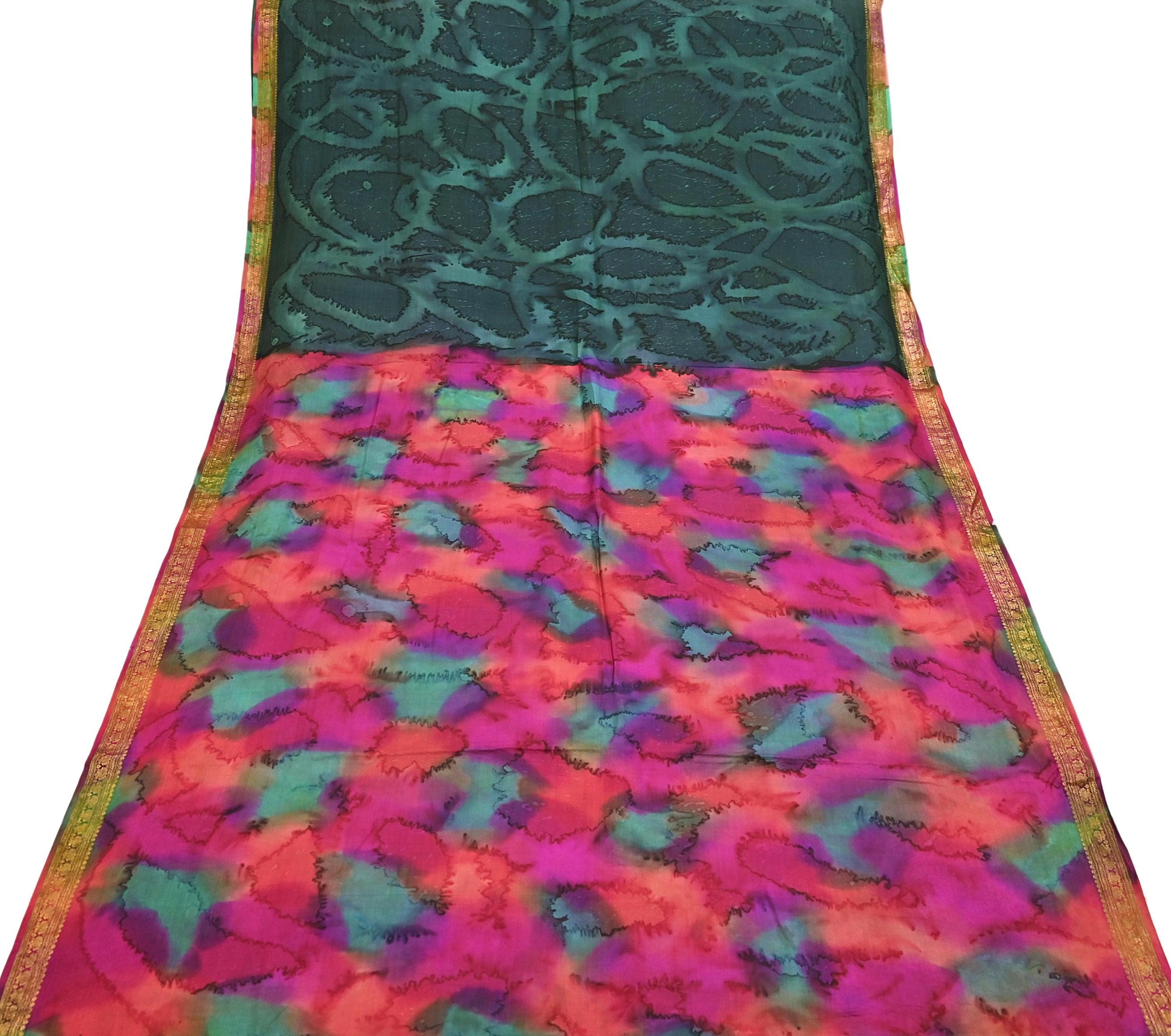 Indian Vintage Sari Green & Multi Pure Silk Printed Tie-Dye Saree Fabric 6yd Sewing Floral Craft Zari Border