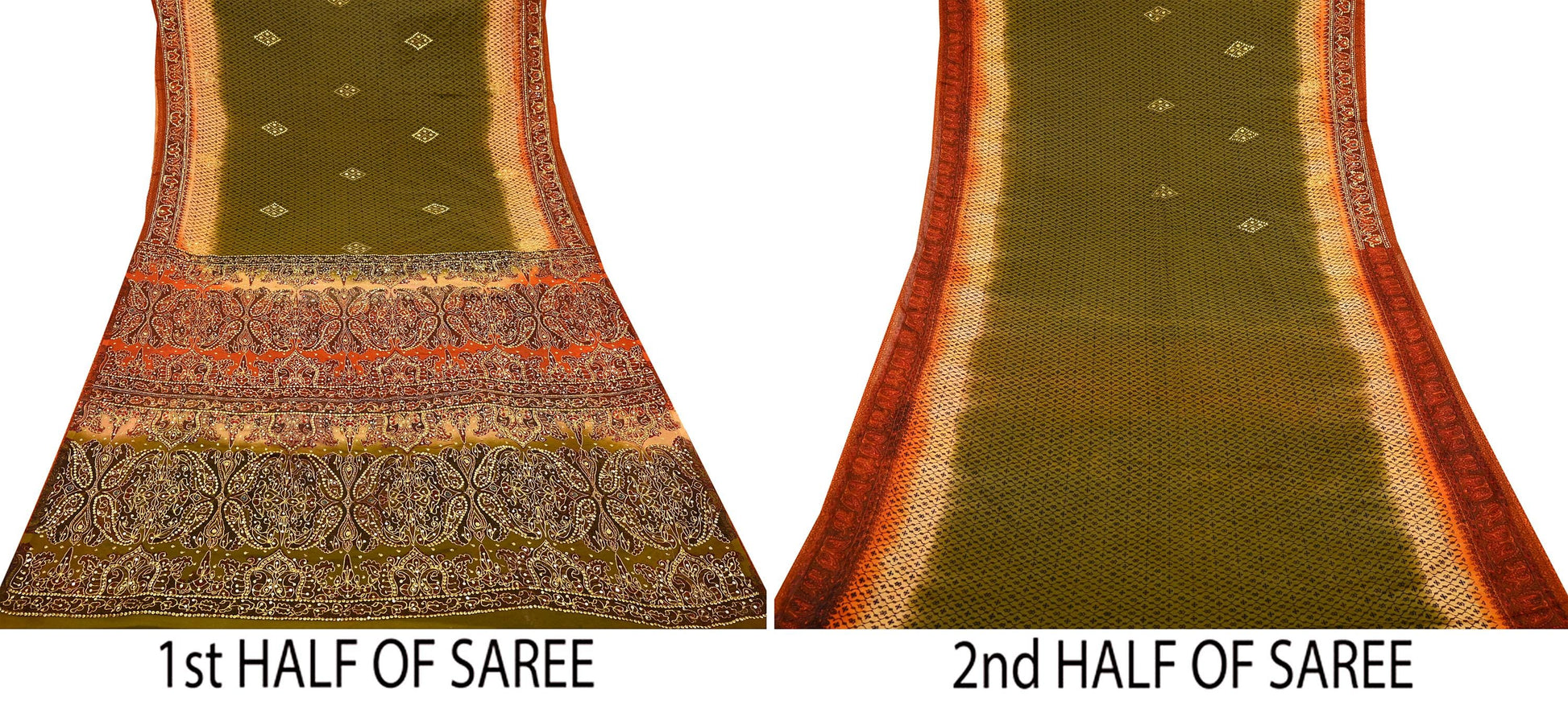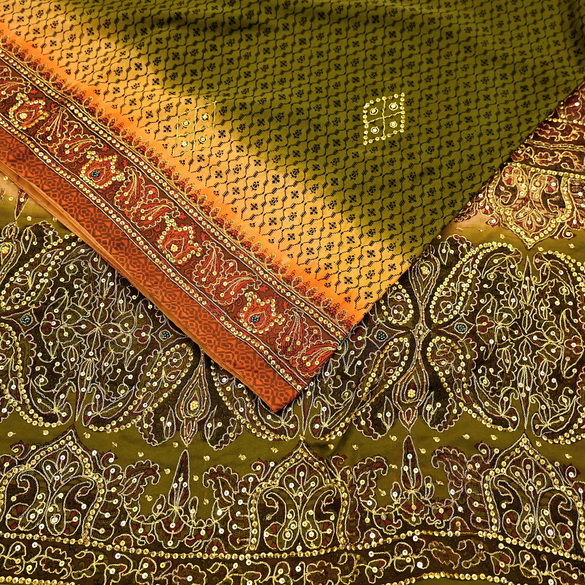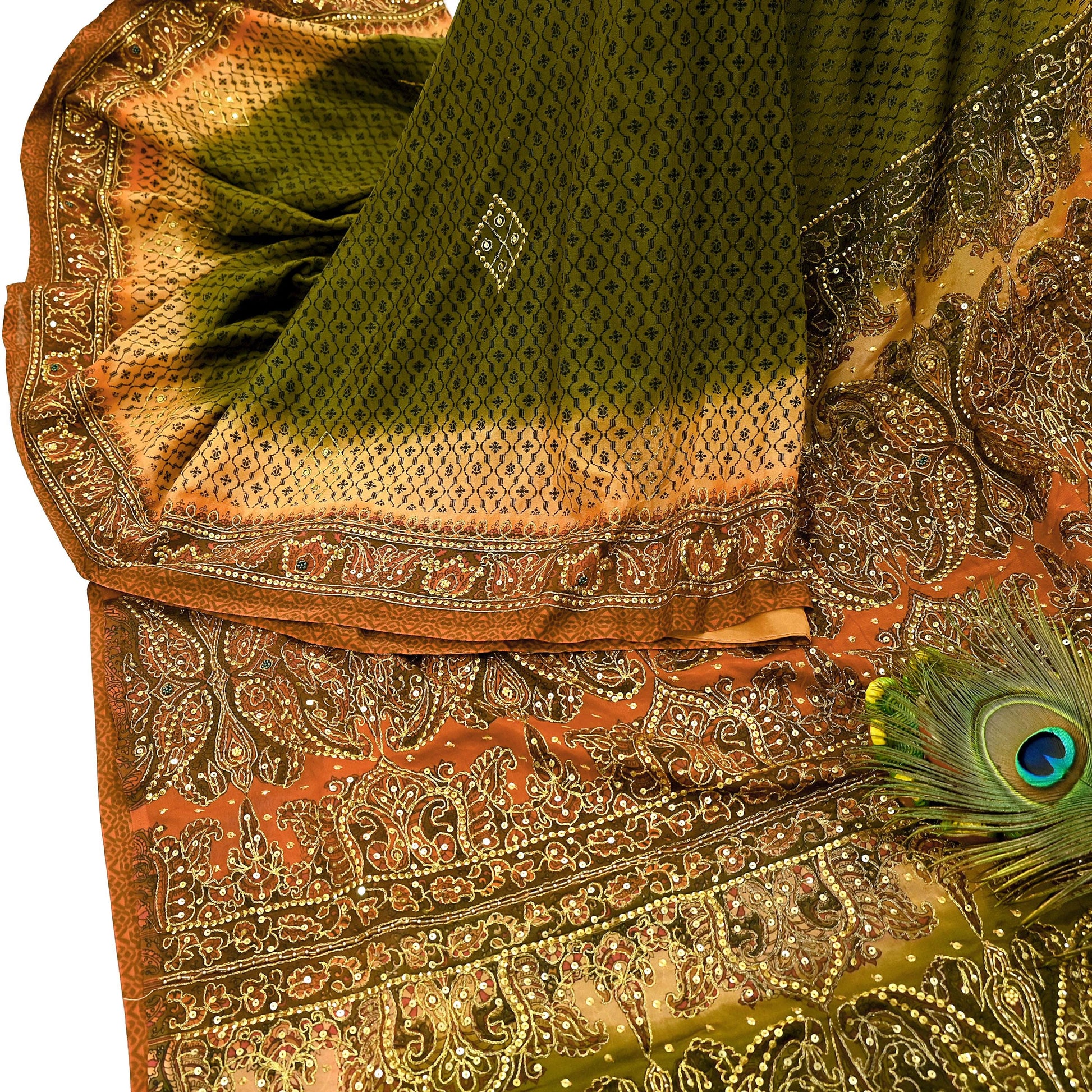 Indian Vintage Sari Green & Orange Artificial Silk Hand Embroidered Sarees Craft Fabric 5Yd Sewing Soft Zardozi/Zari Upcycle Dress Making