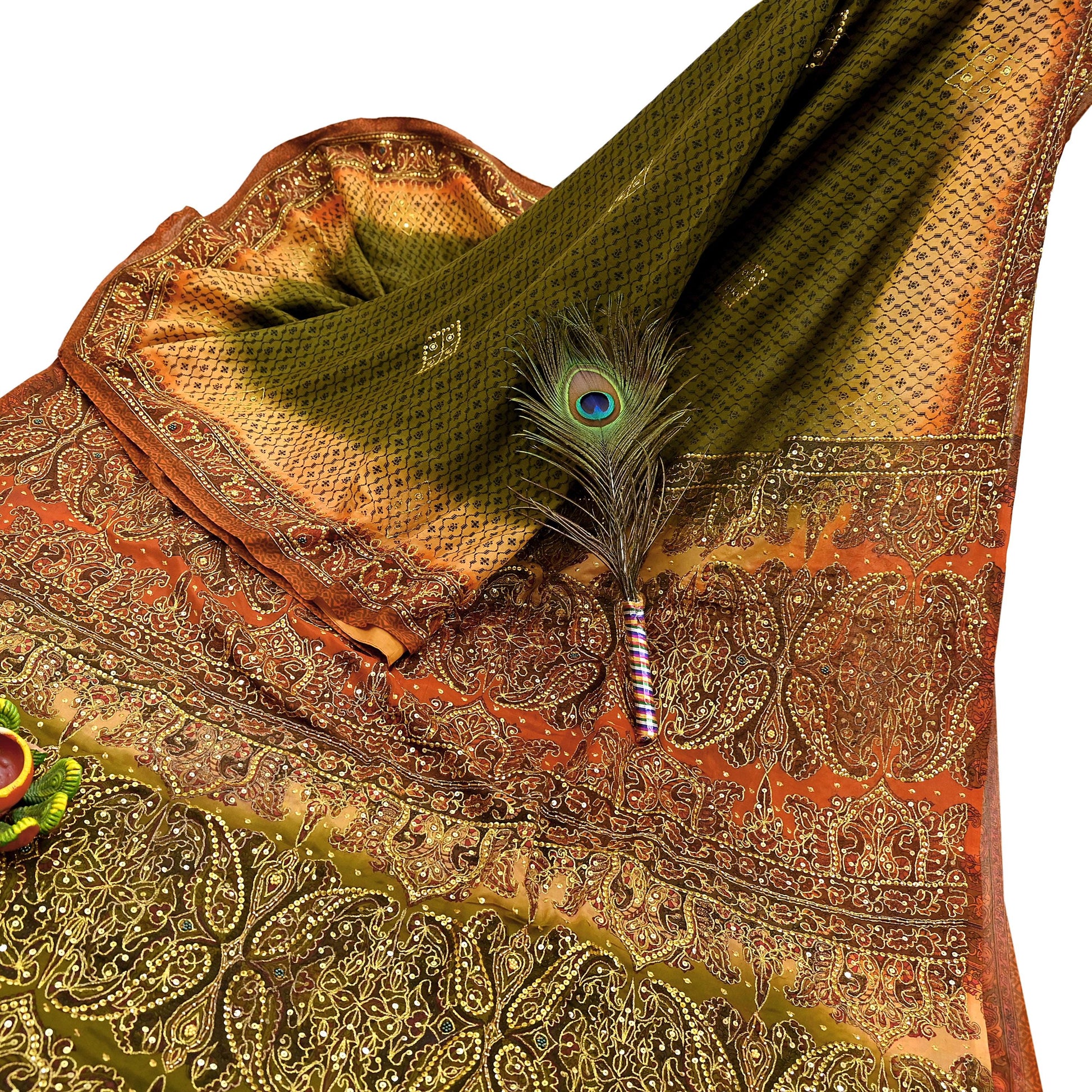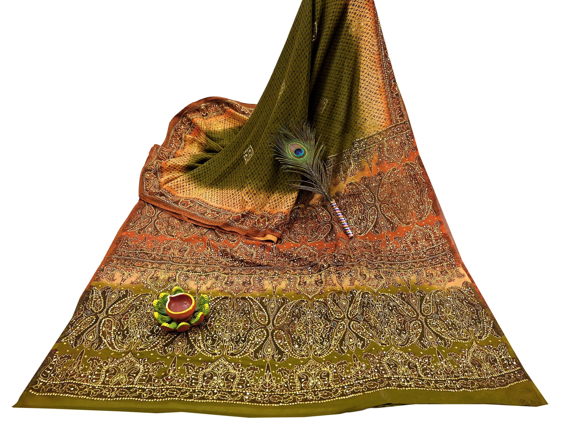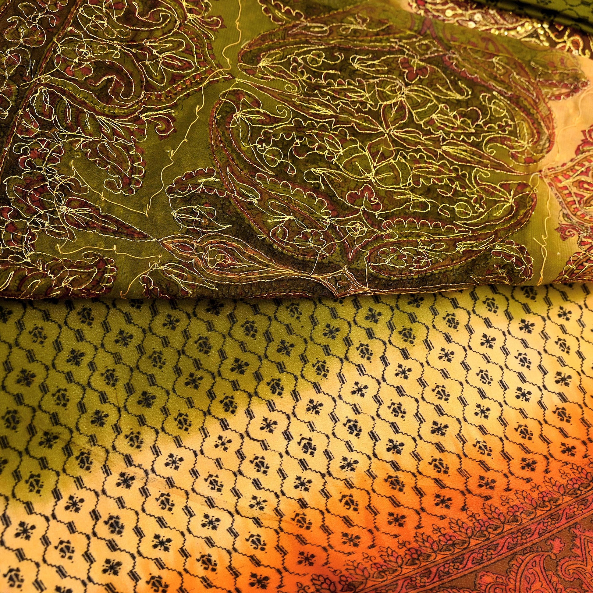 Indian Vintage Sari Green & Orange Artificial Silk Hand Embroidered Sarees Craft Fabric 5Yd Sewing Soft Zardozi/Zari Upcycle Dress Making