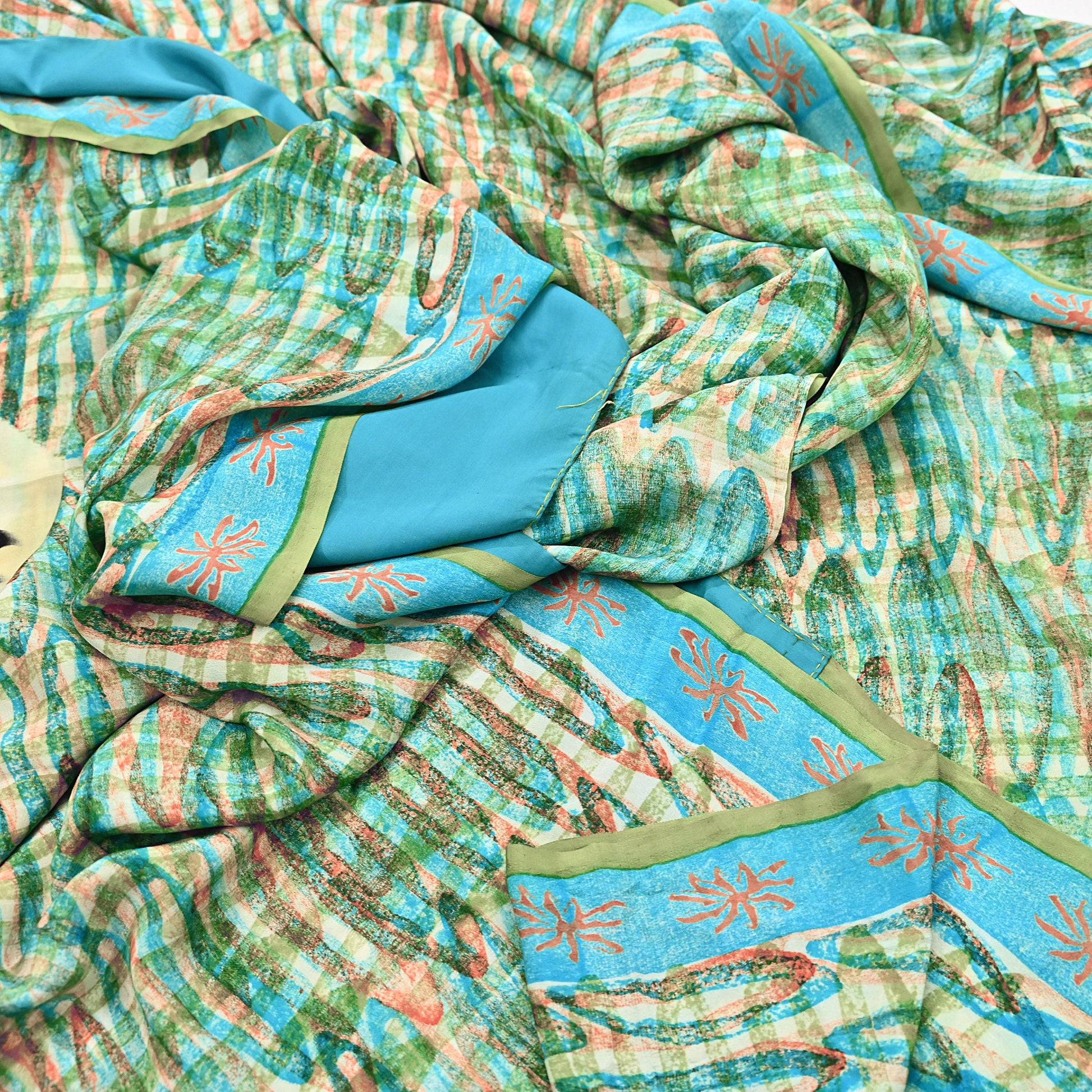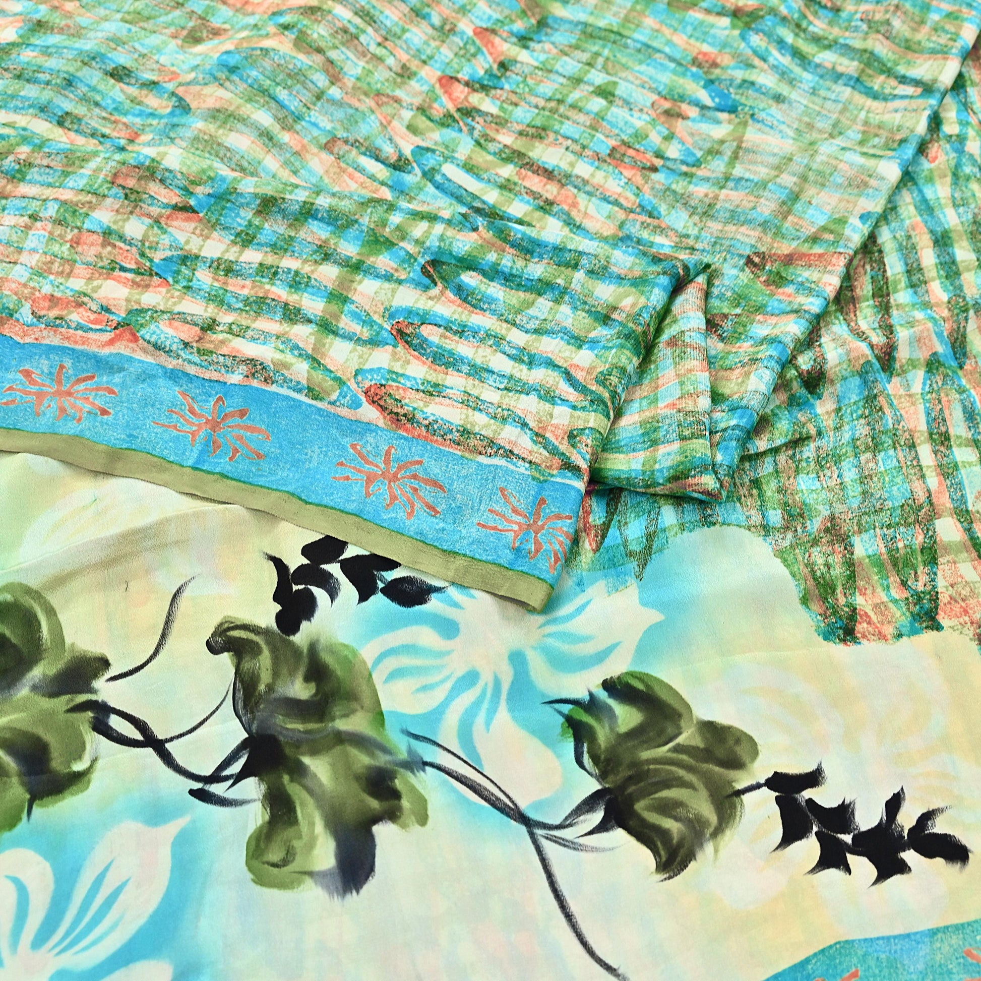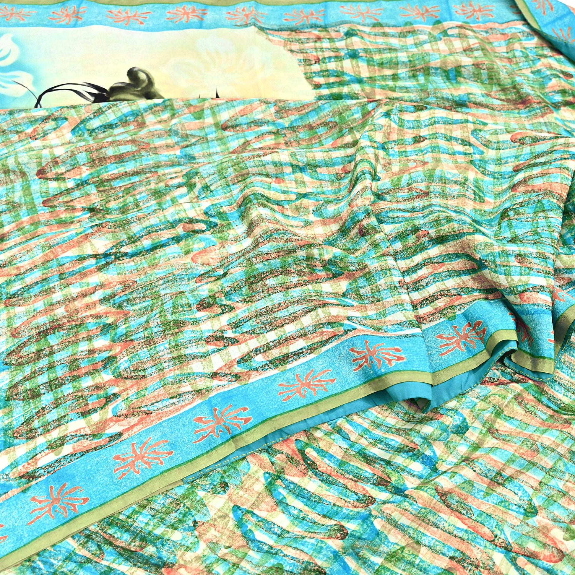 *Vintage Green & Ivory Colored Block Printed Pure Crepe Silk Saree .